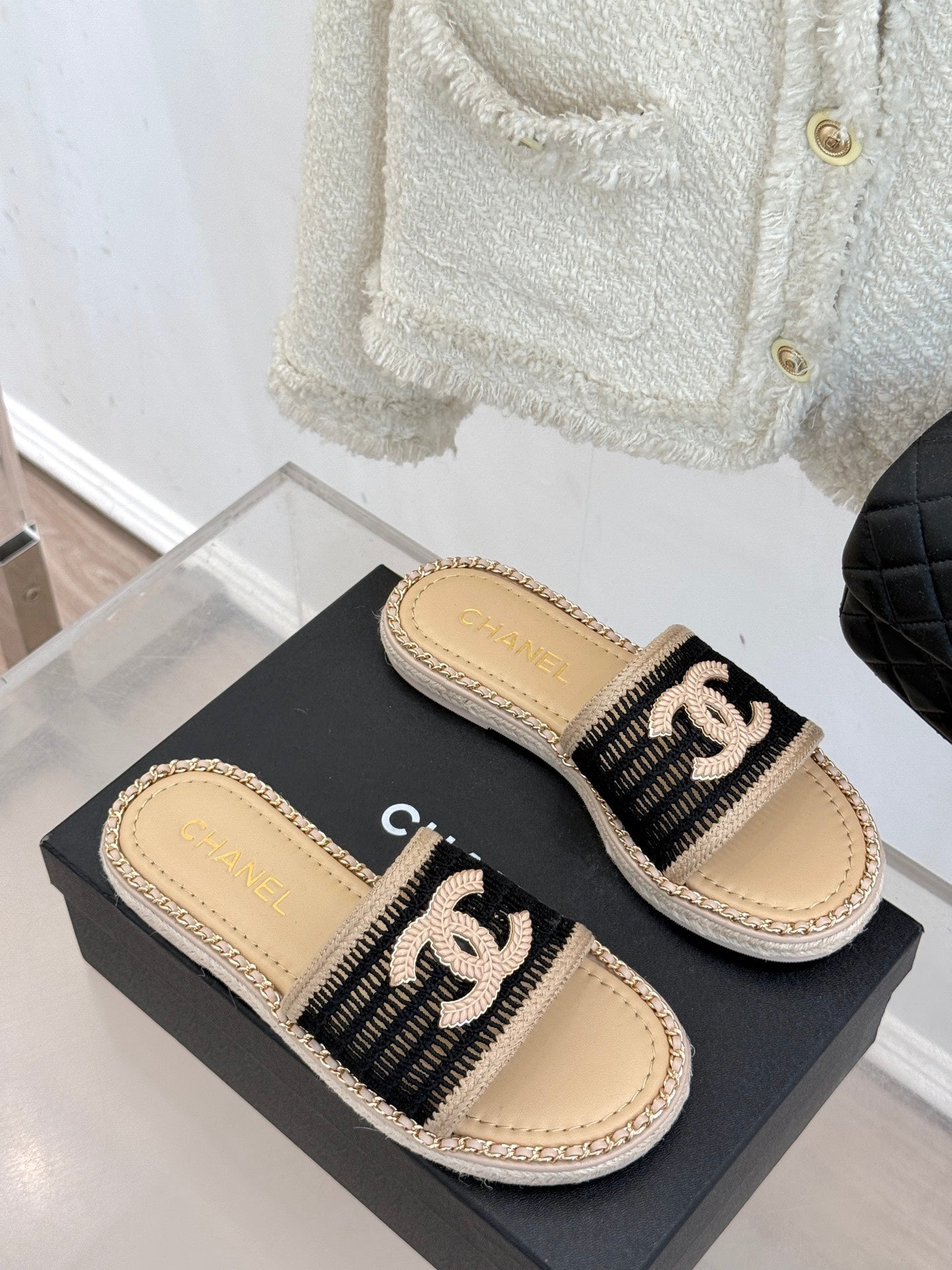 CC Mesh Hollow Chain Double C Thick-Soled Slippers 20mm Beige Black 265646