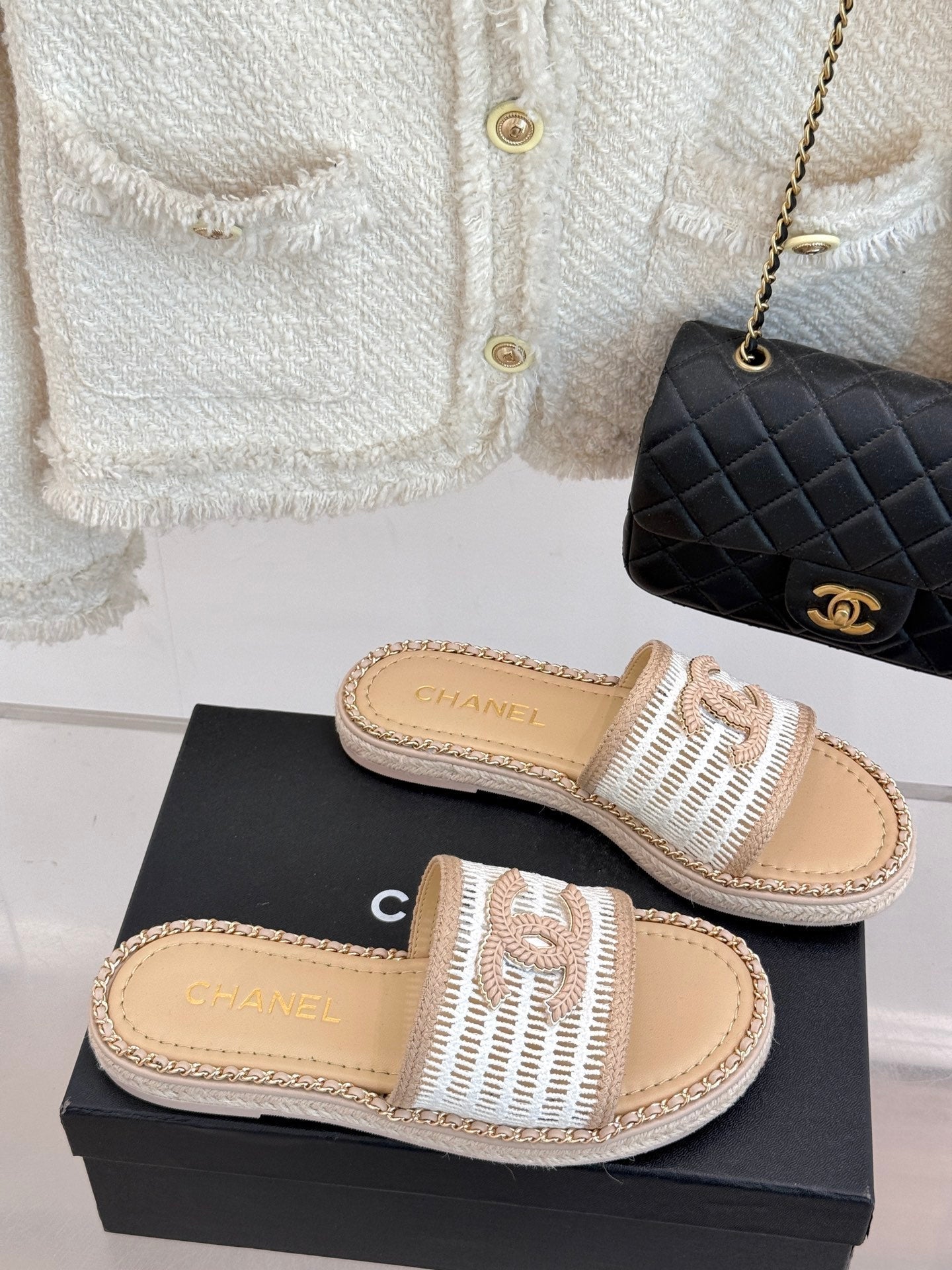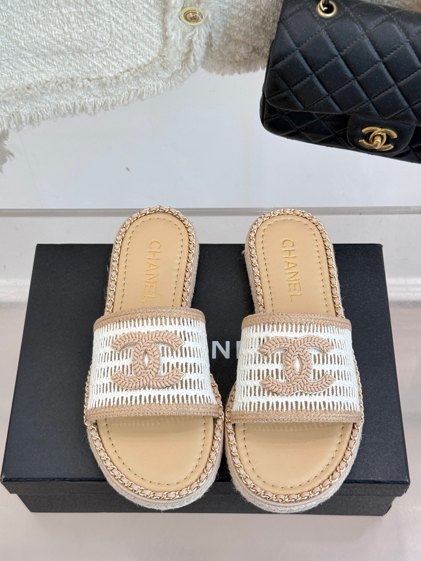 CC Mesh Hollow Chain Double C Thick-Soled Slippers 20mm Beige White 265644