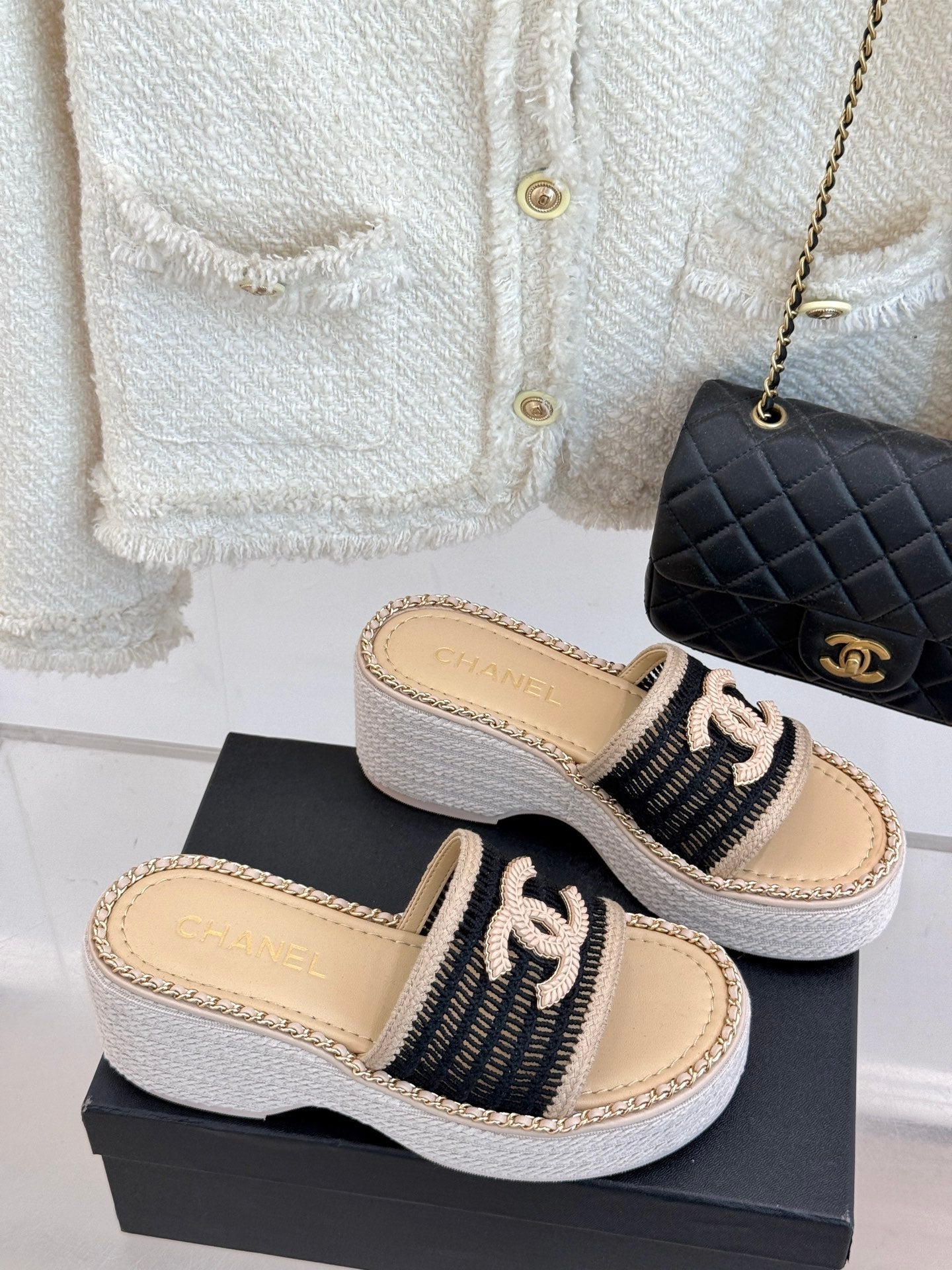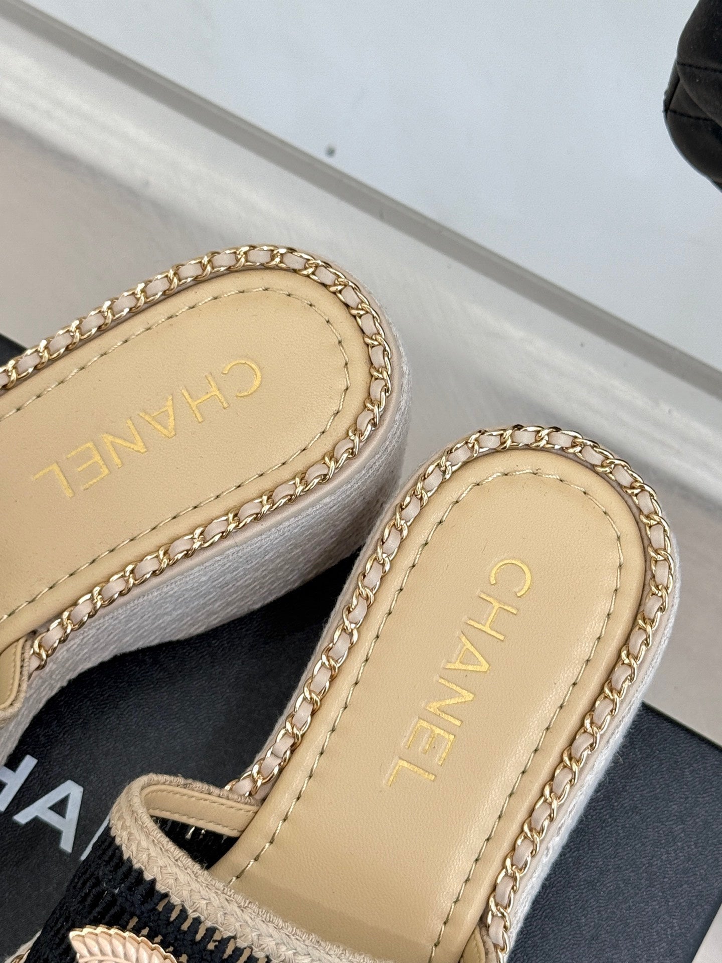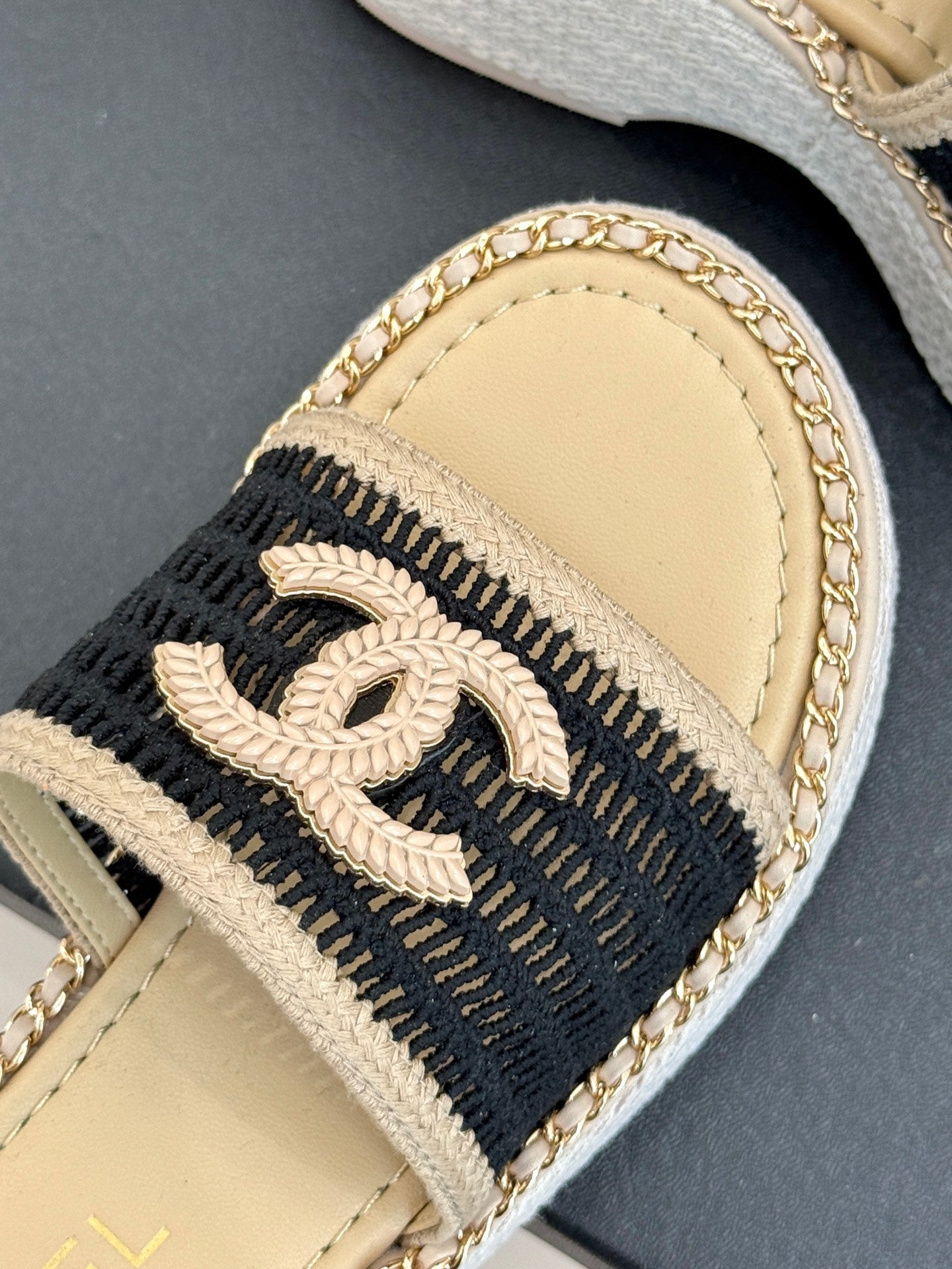 CC Mesh Hollow Chain Double C Thick-Soled Slippers 70mm Beige Black 265650