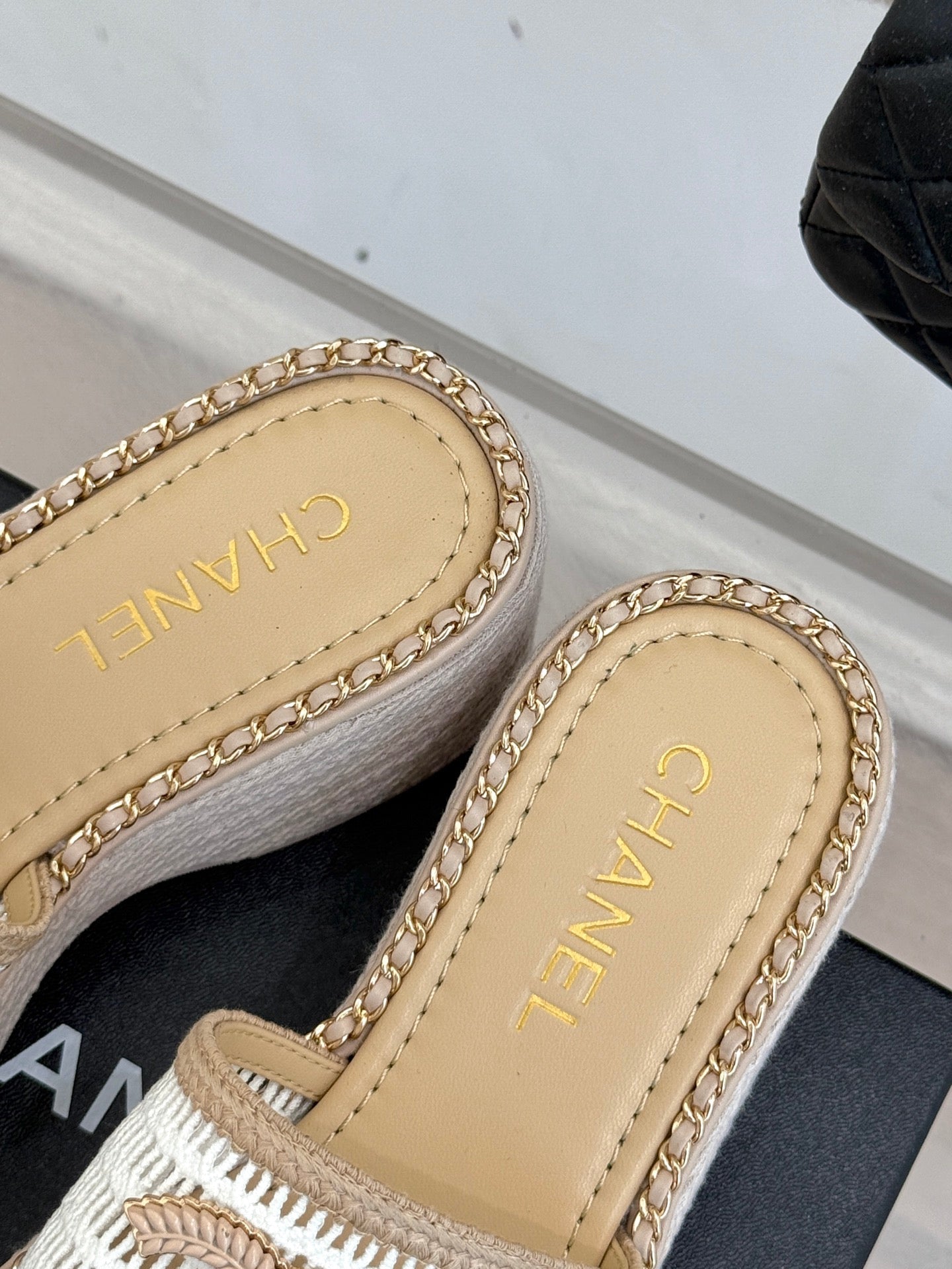 CC Mesh Hollow Chain Double C Thick-Soled Slippers 70mm Beige White 265648
