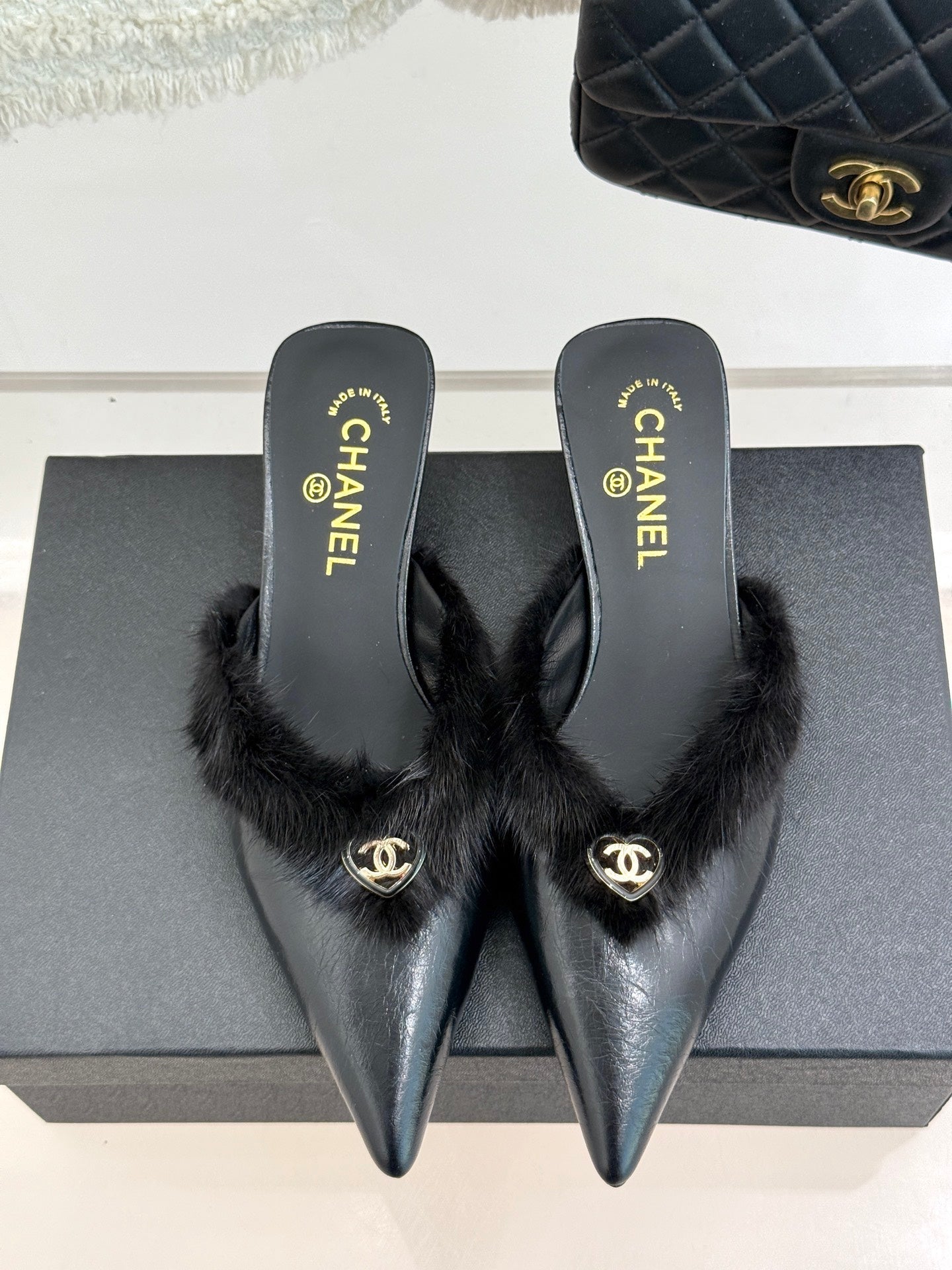RABBIT FUR POINTED-TOE MULE IN BLACK LAMBSKIN