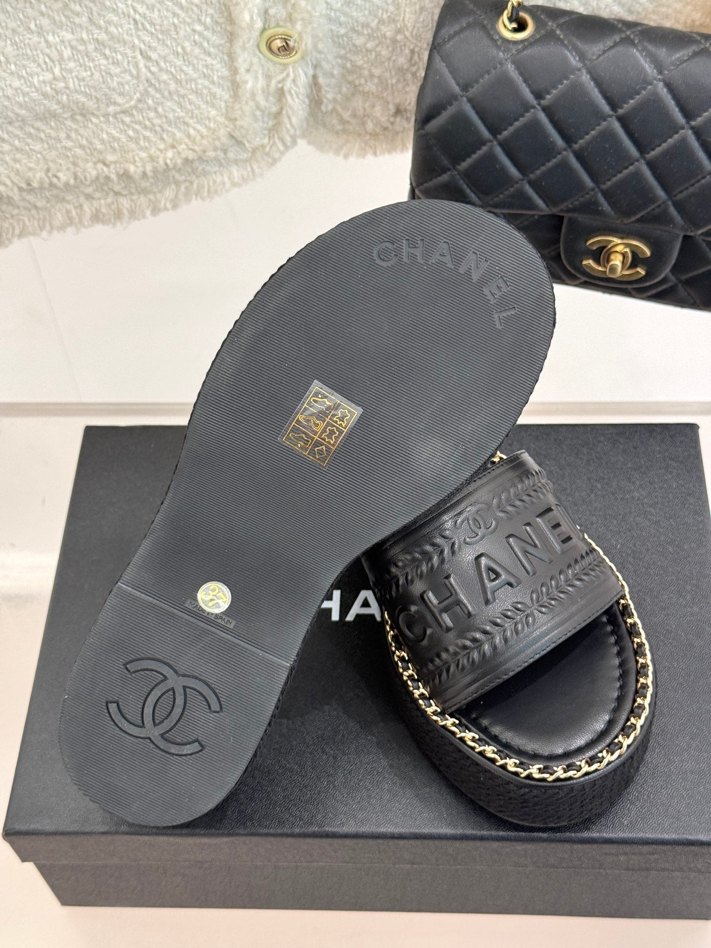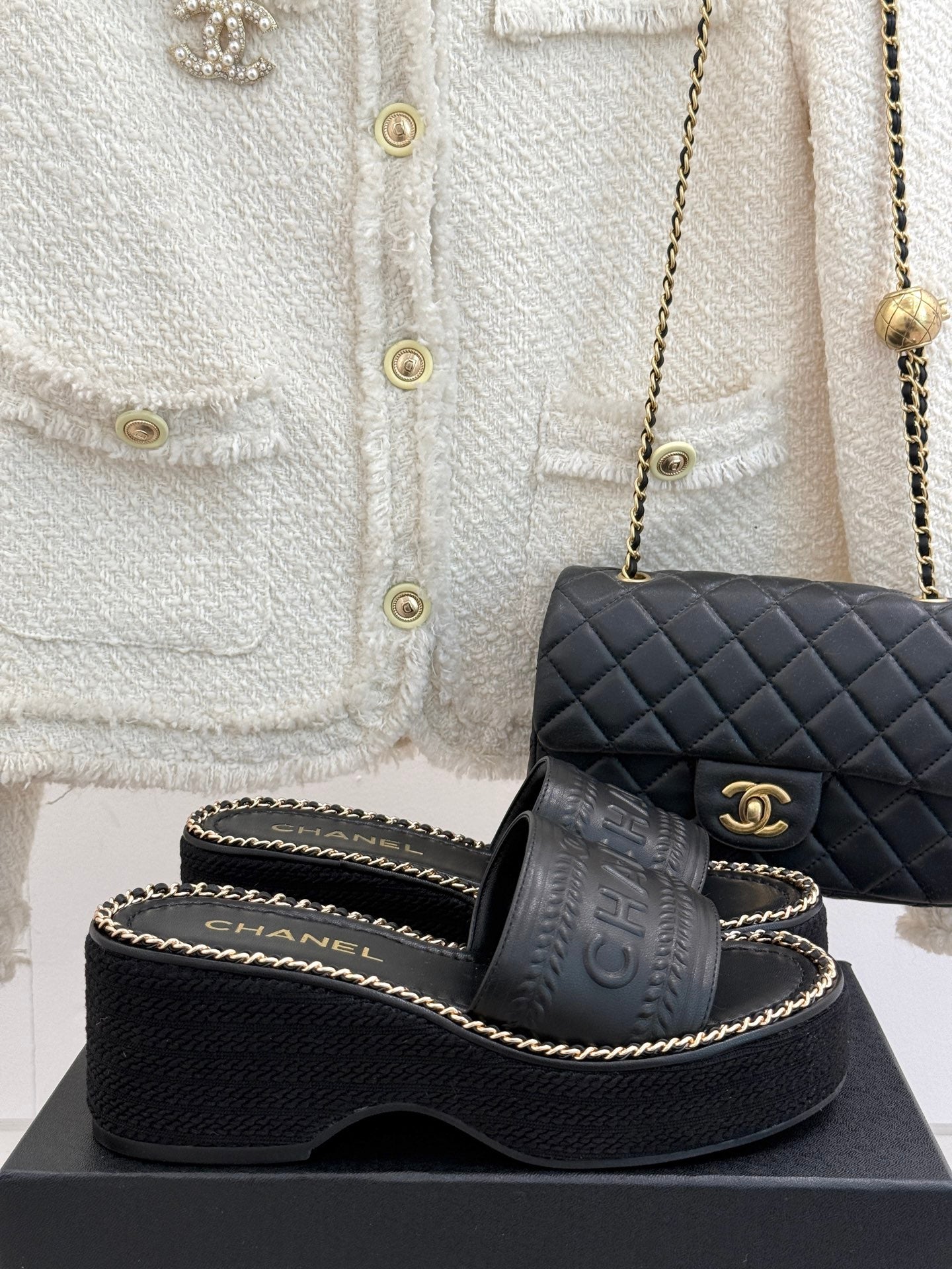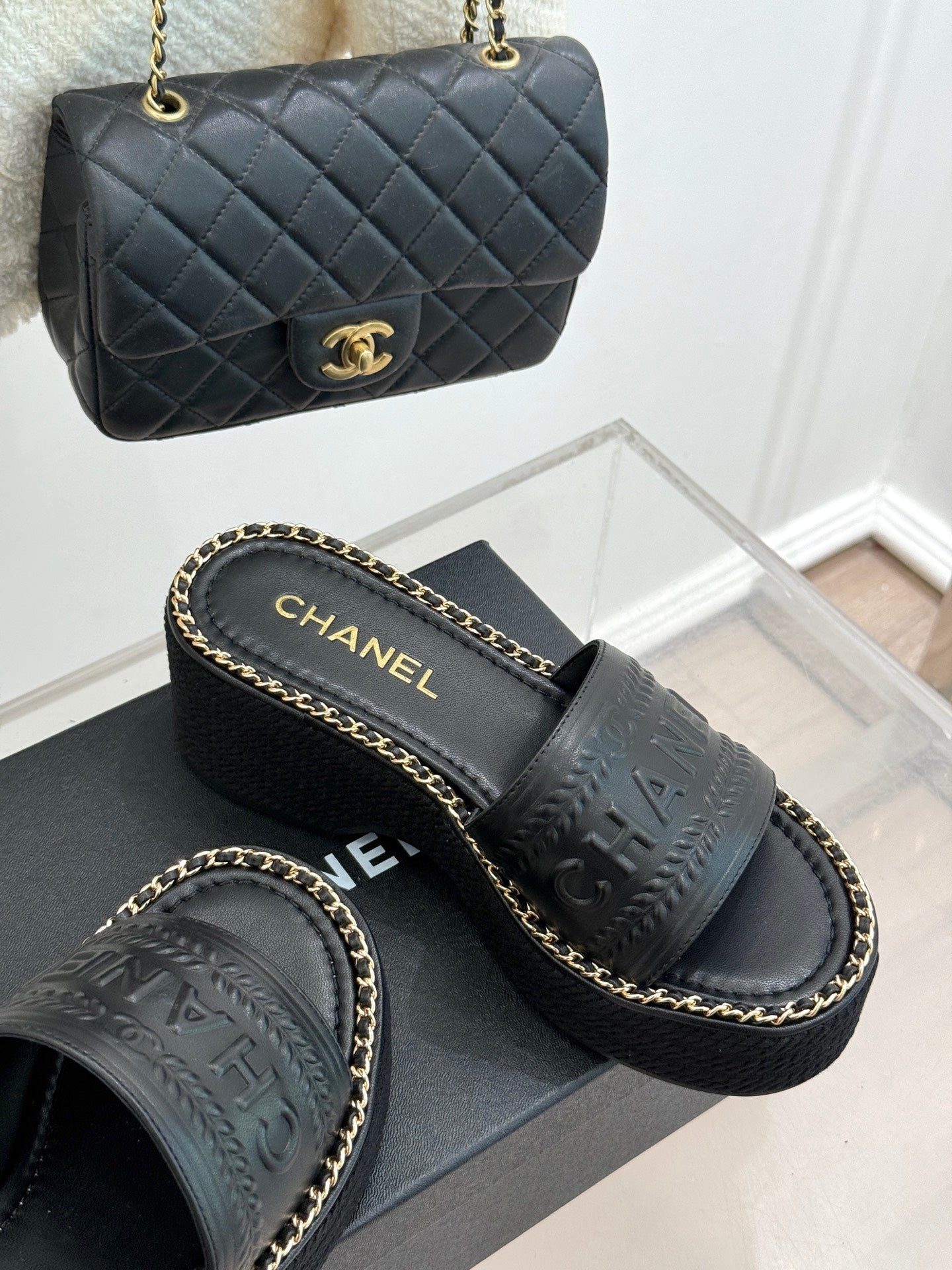 THICK SOLE WEDGE SLIPPERS IN BLACK CALFSKIN