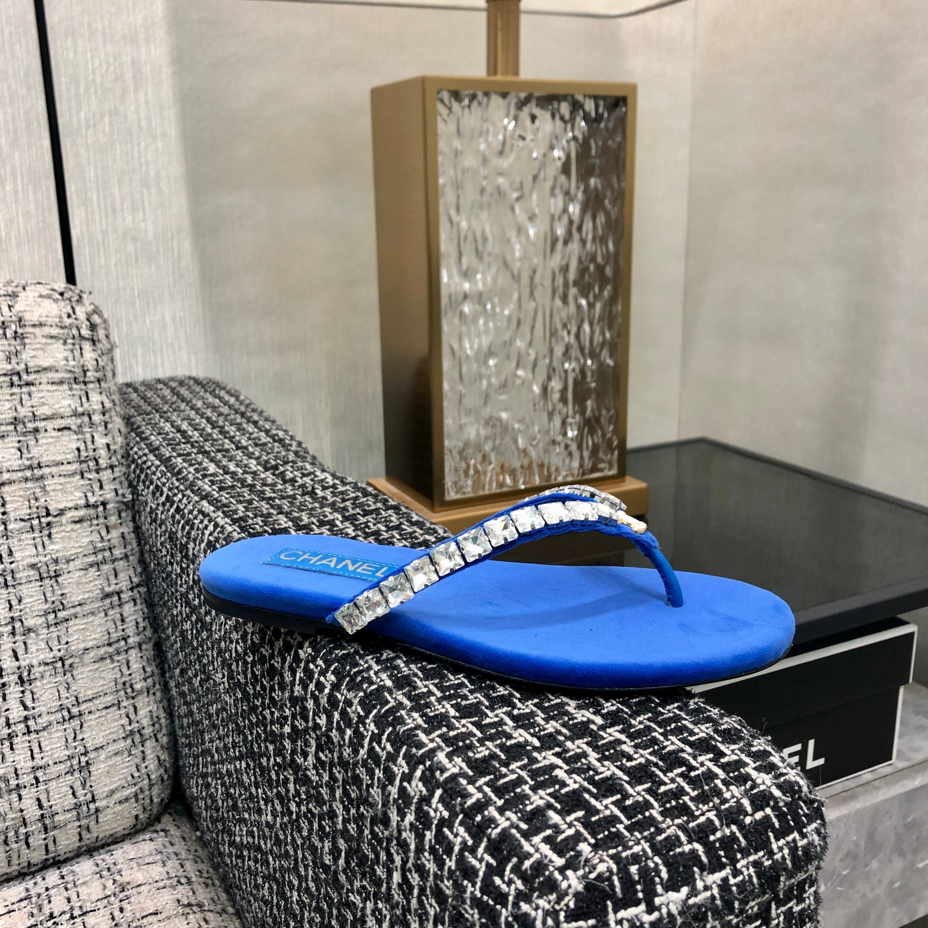 THONG SLIDE IN COBALT BLUE SUEDE WITH WHITE CRYSTALS