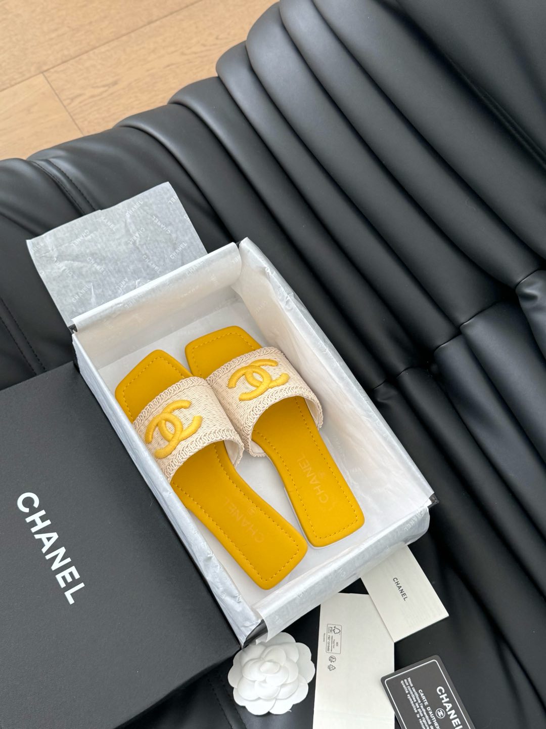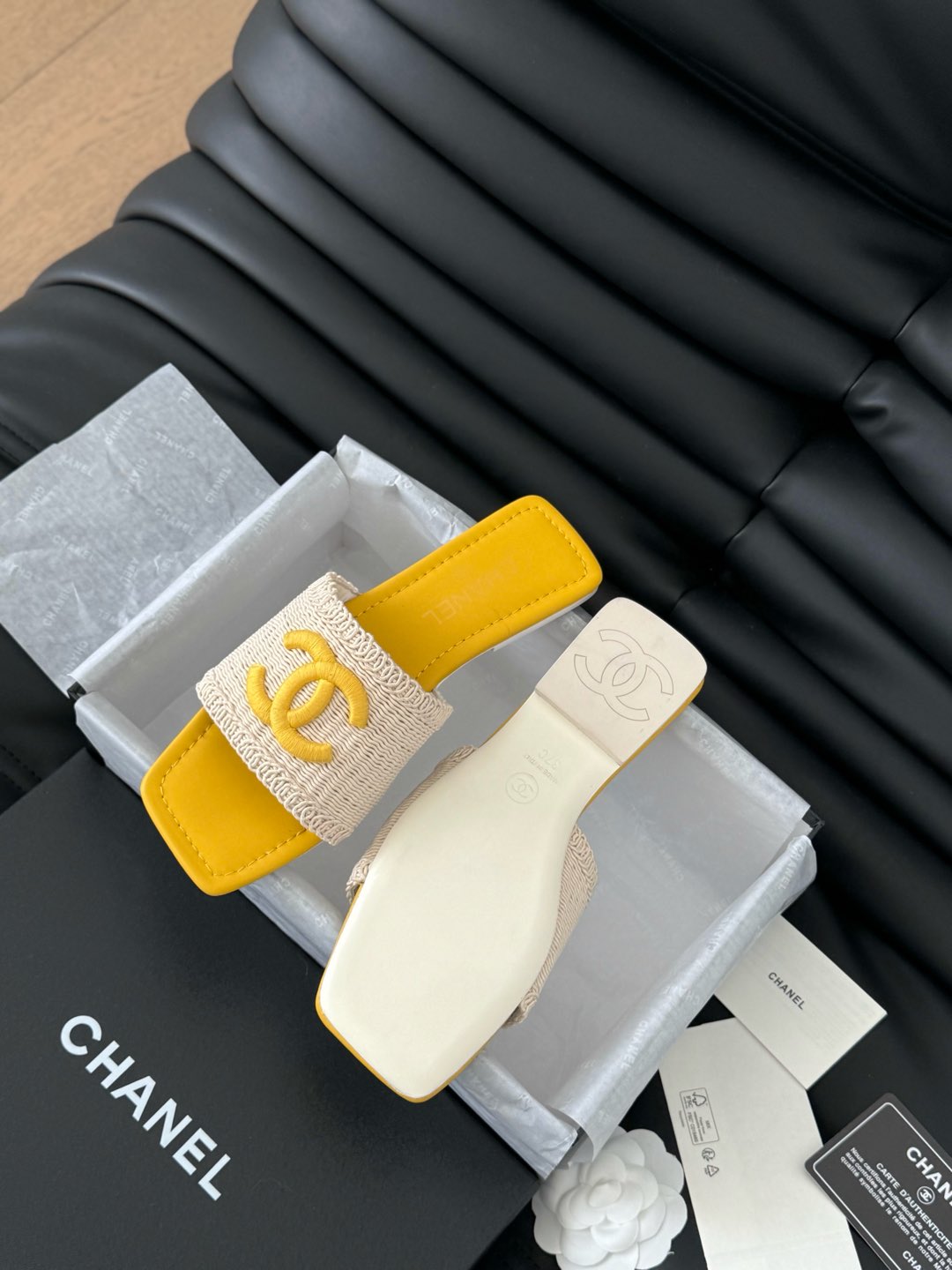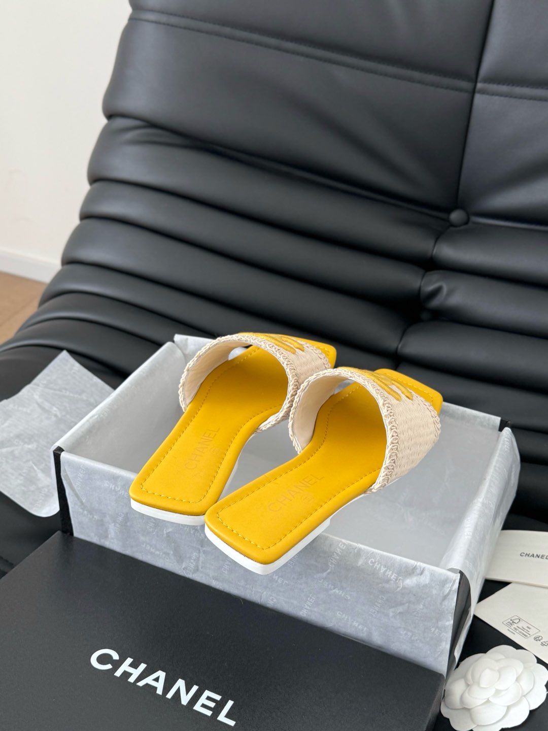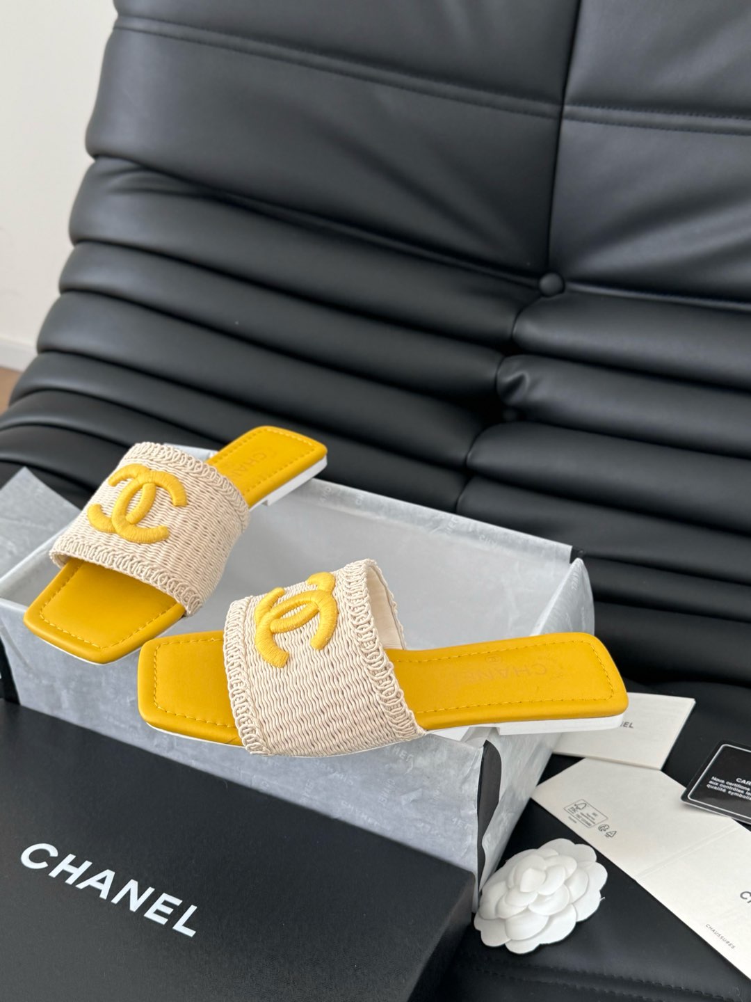 WOVEN SLIDE IN RAFFIA AND LIGHT YELLOW LAMBSKIN