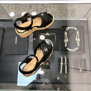 PEEP-TOE THICK SOLE SANDALS IN BLACK PATENT LAMBSKIN