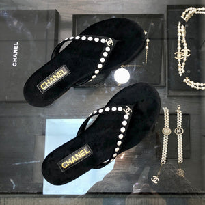 THONG SLIDE IN BLACK SUEDE WITH WHITE RHINSTONES
