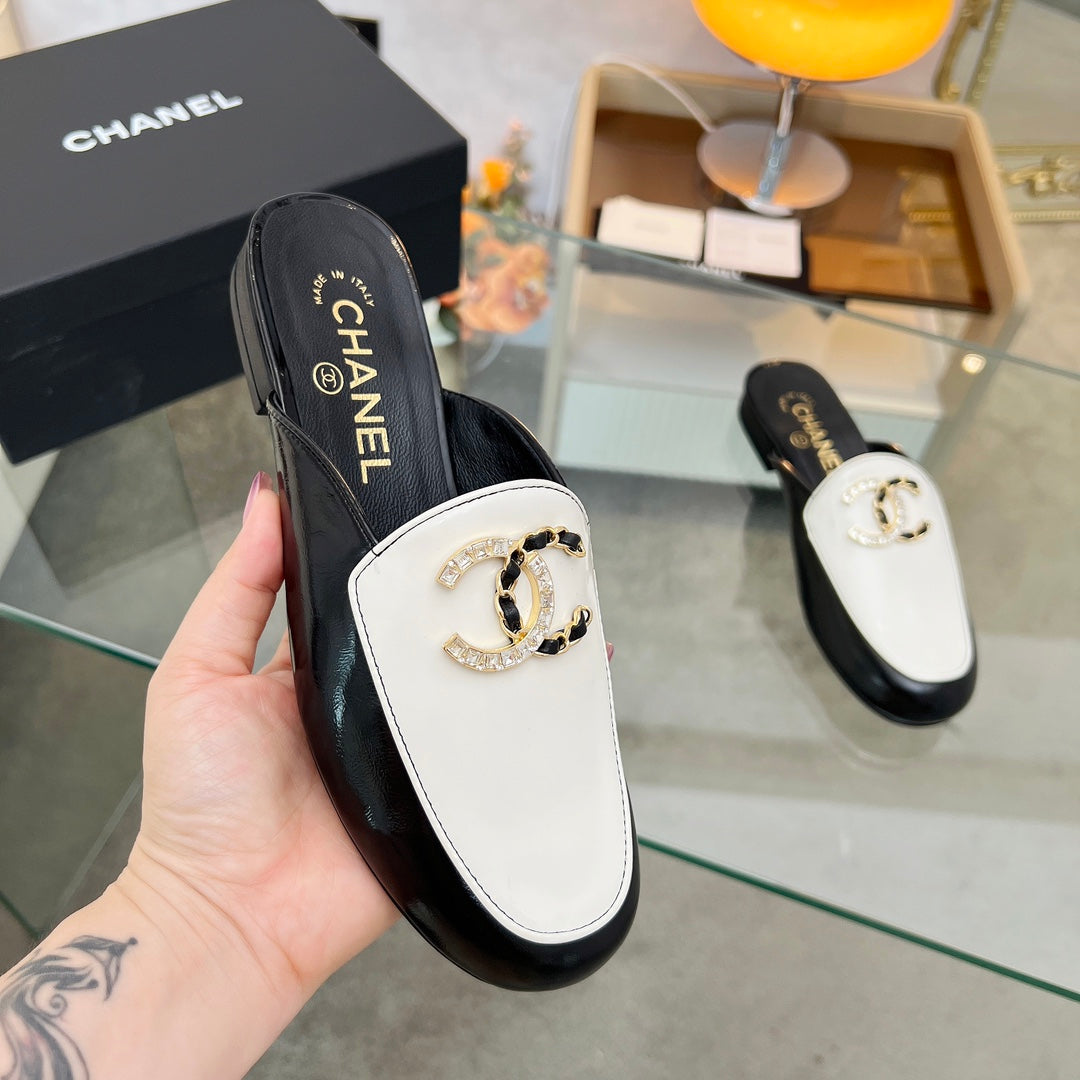 CC 25 Mule Black White Calfskin Large Double C Logo
