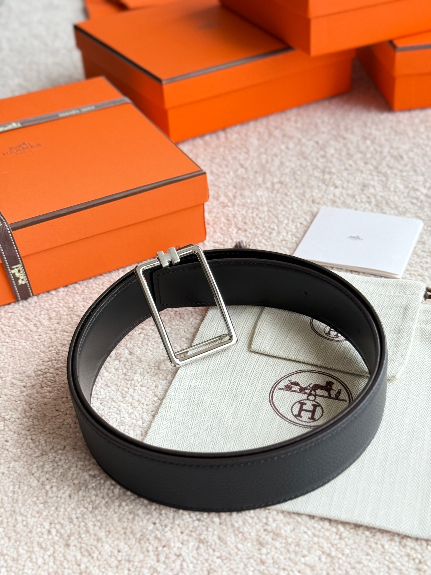 HM Silver Tube H Buckle Belt 38mm Black Leather 187780