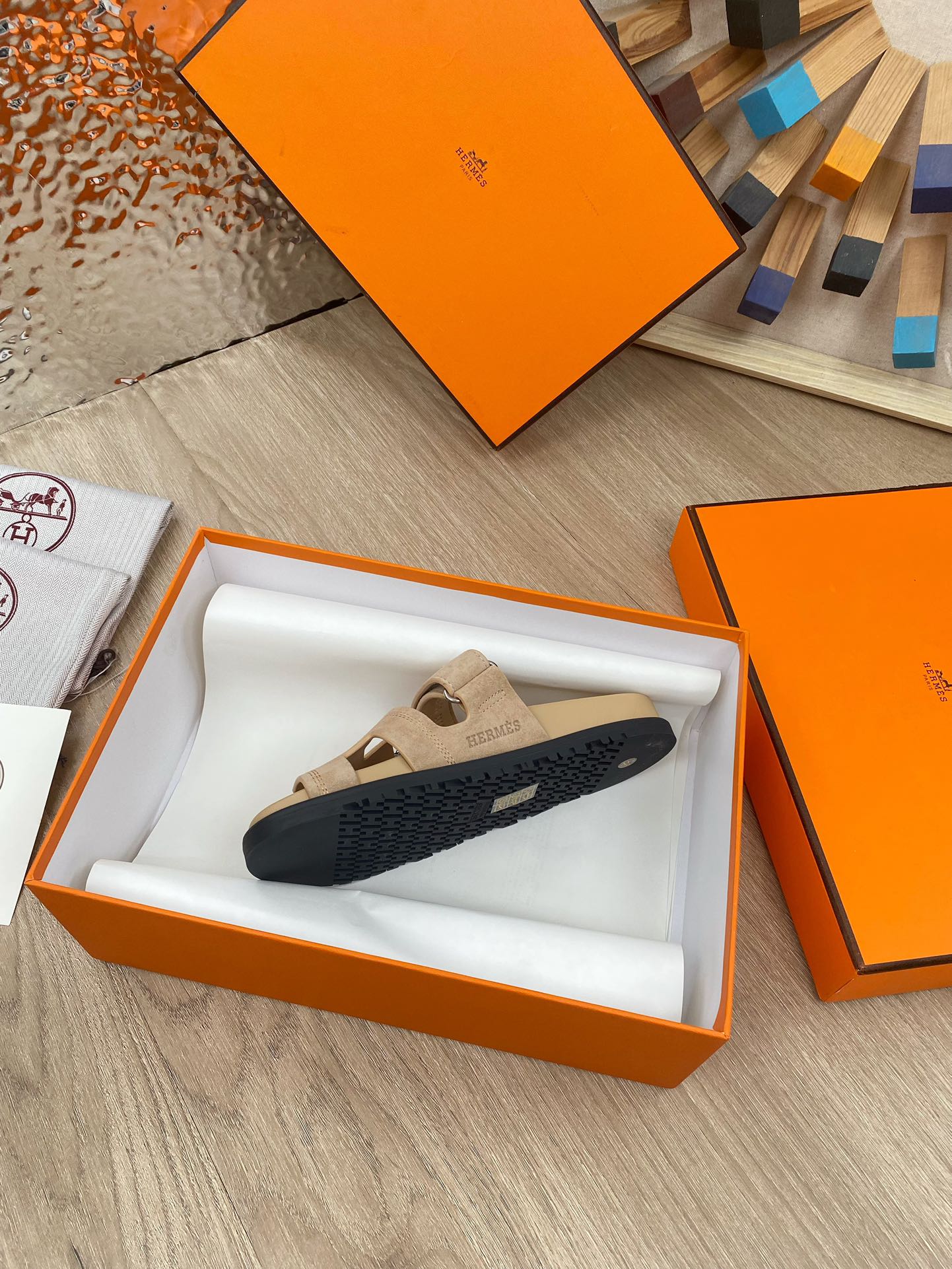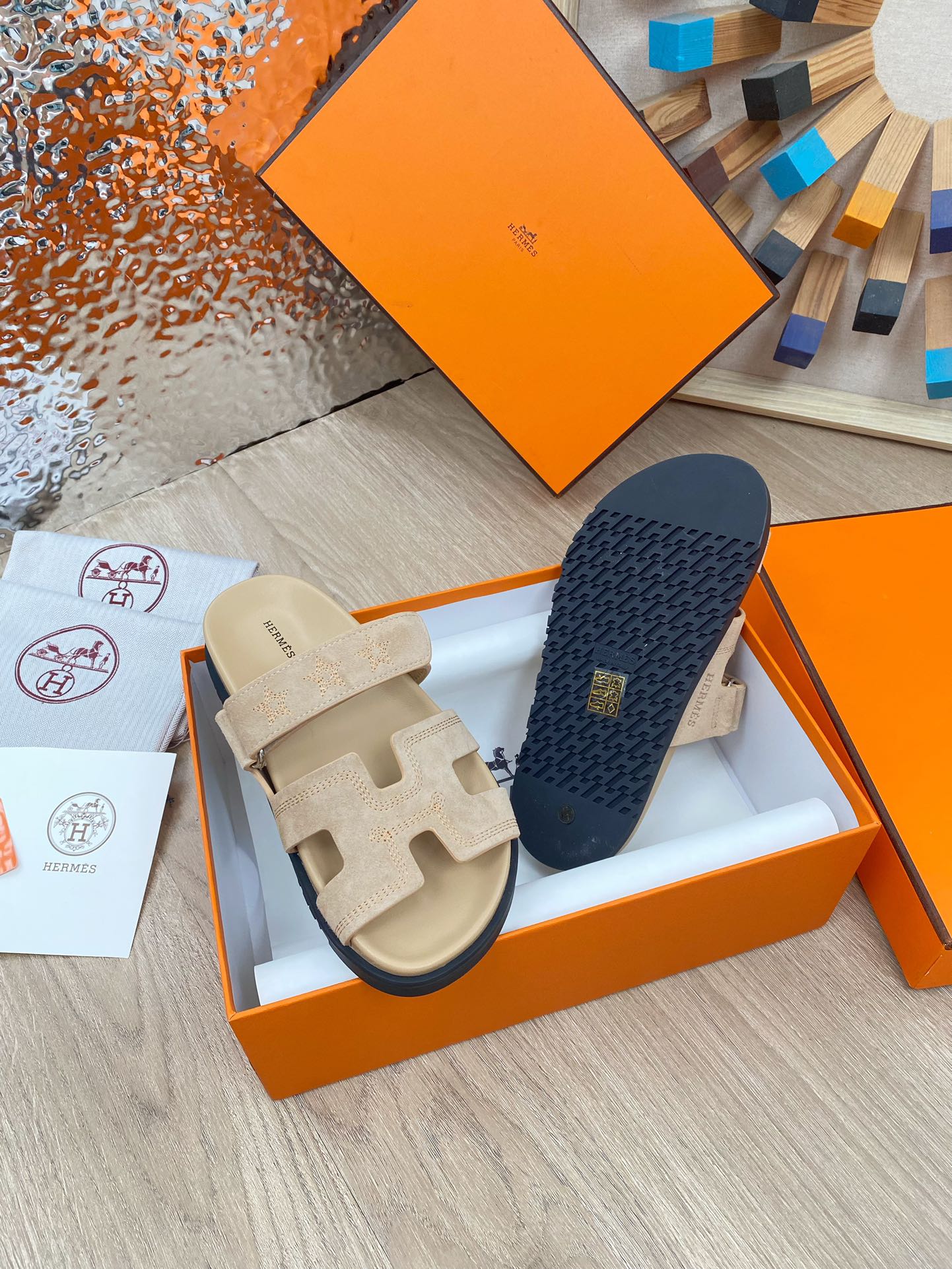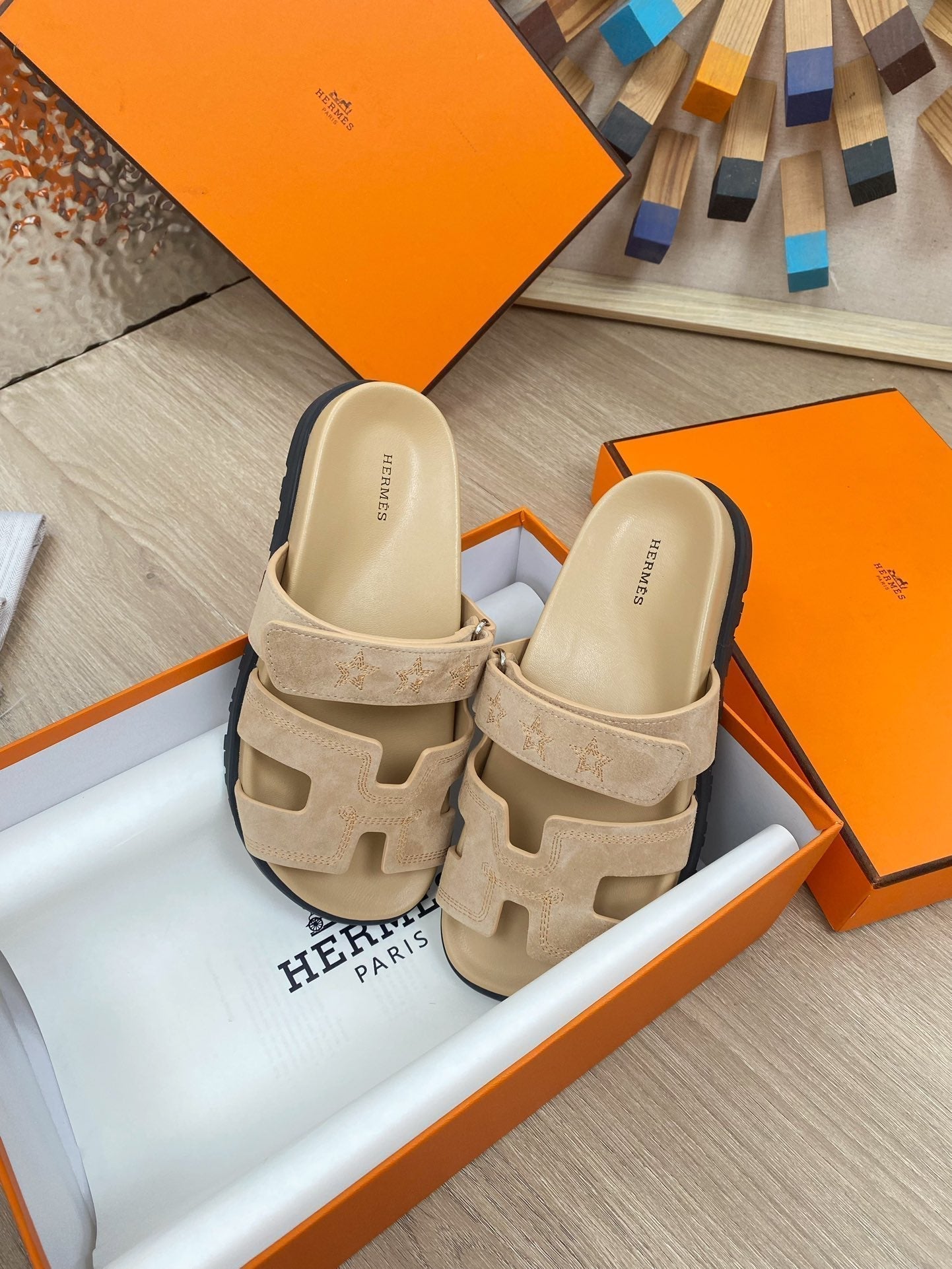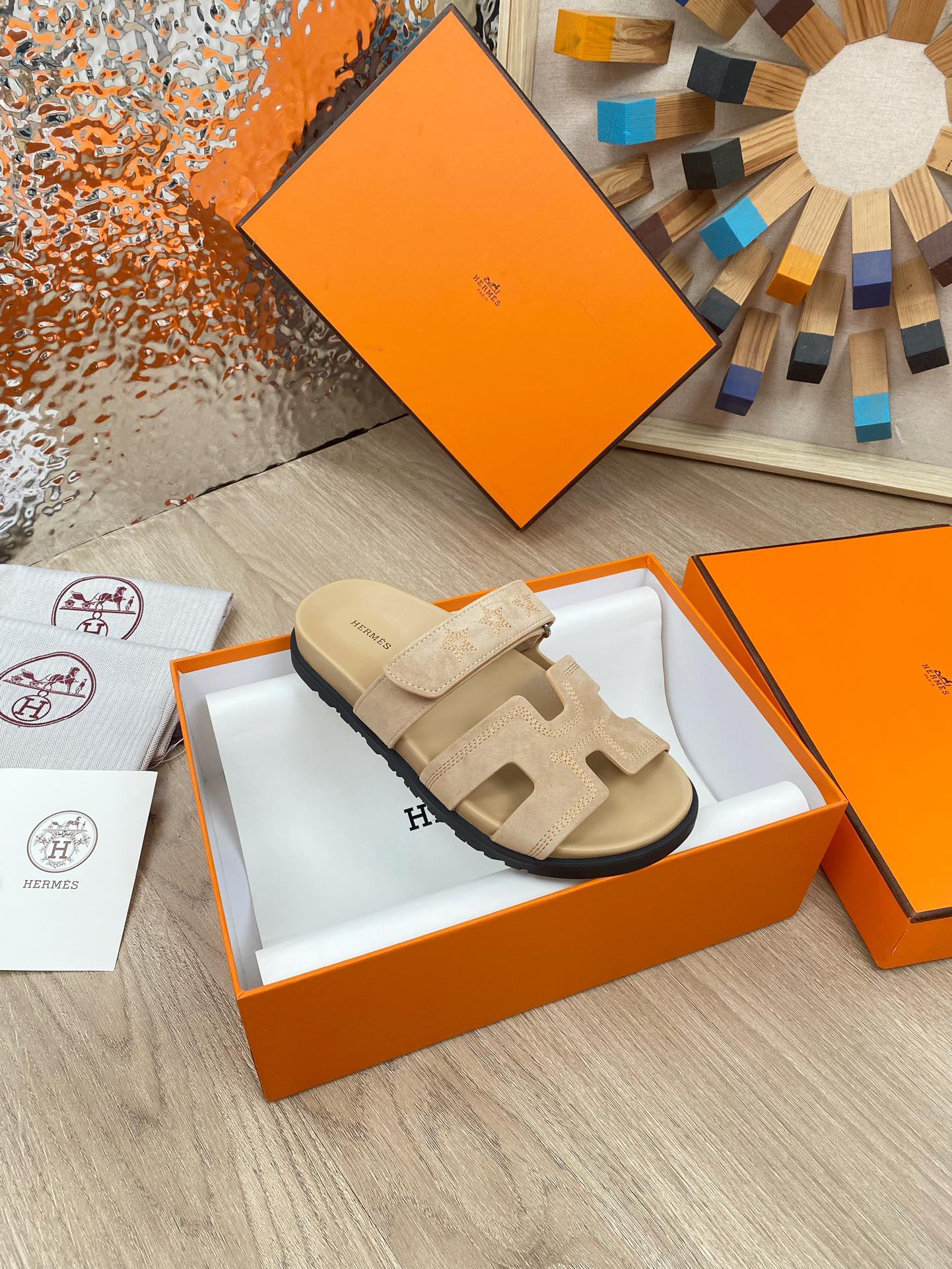 chypre sandal beige suede calfskin white thread embroidered