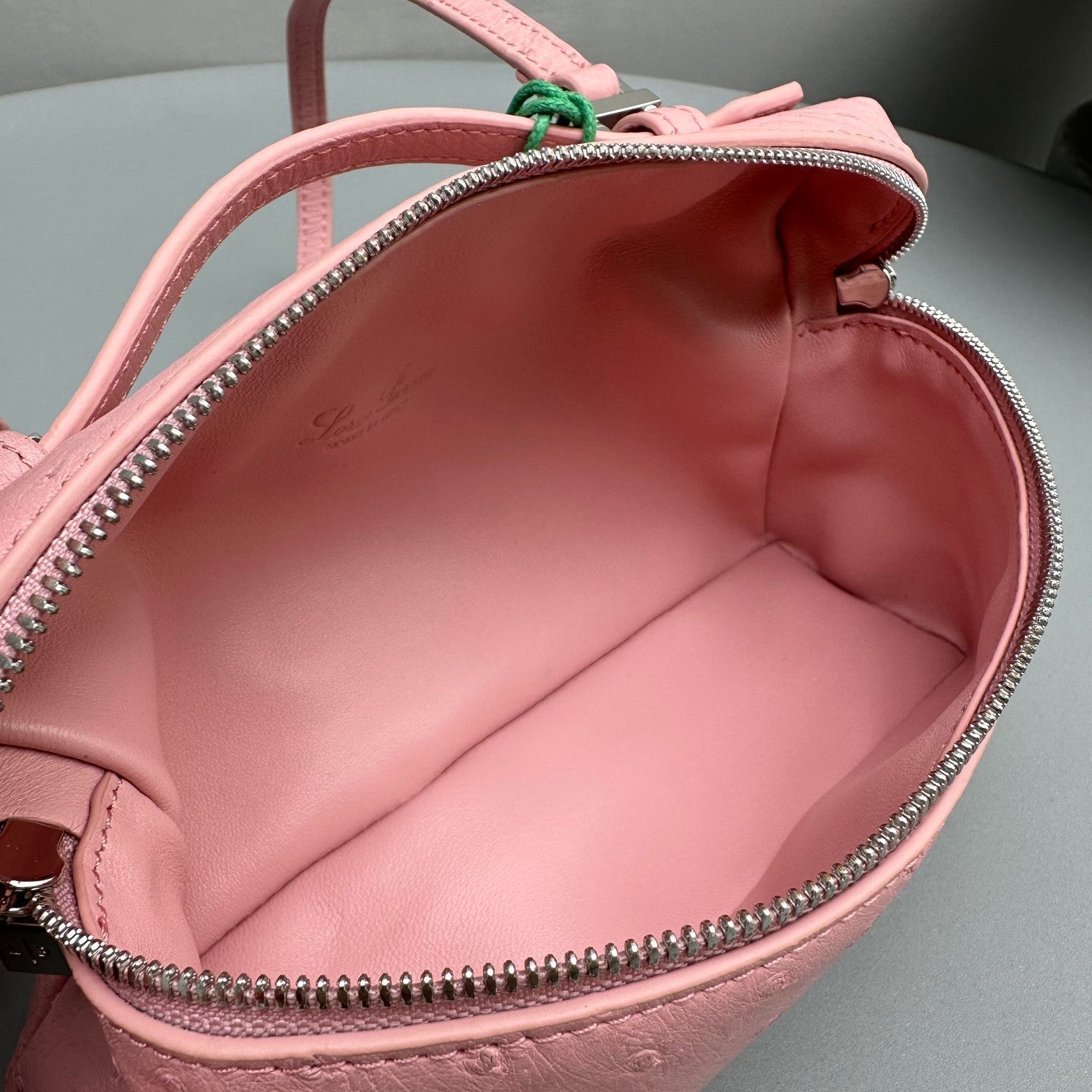 - Ostrich-leather handle and shoulder strap