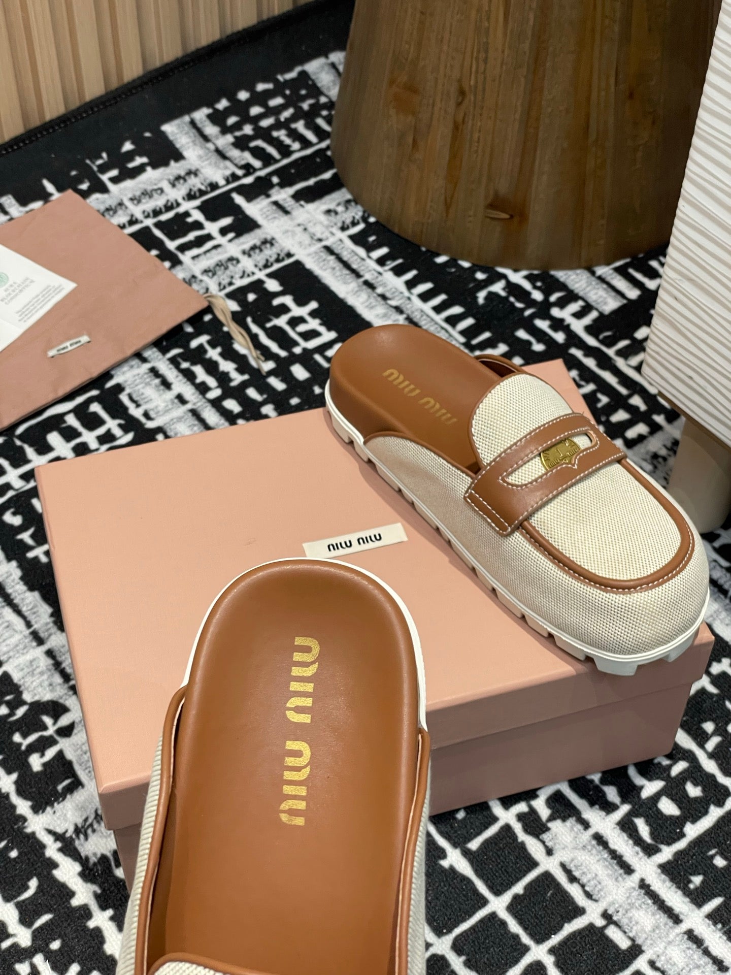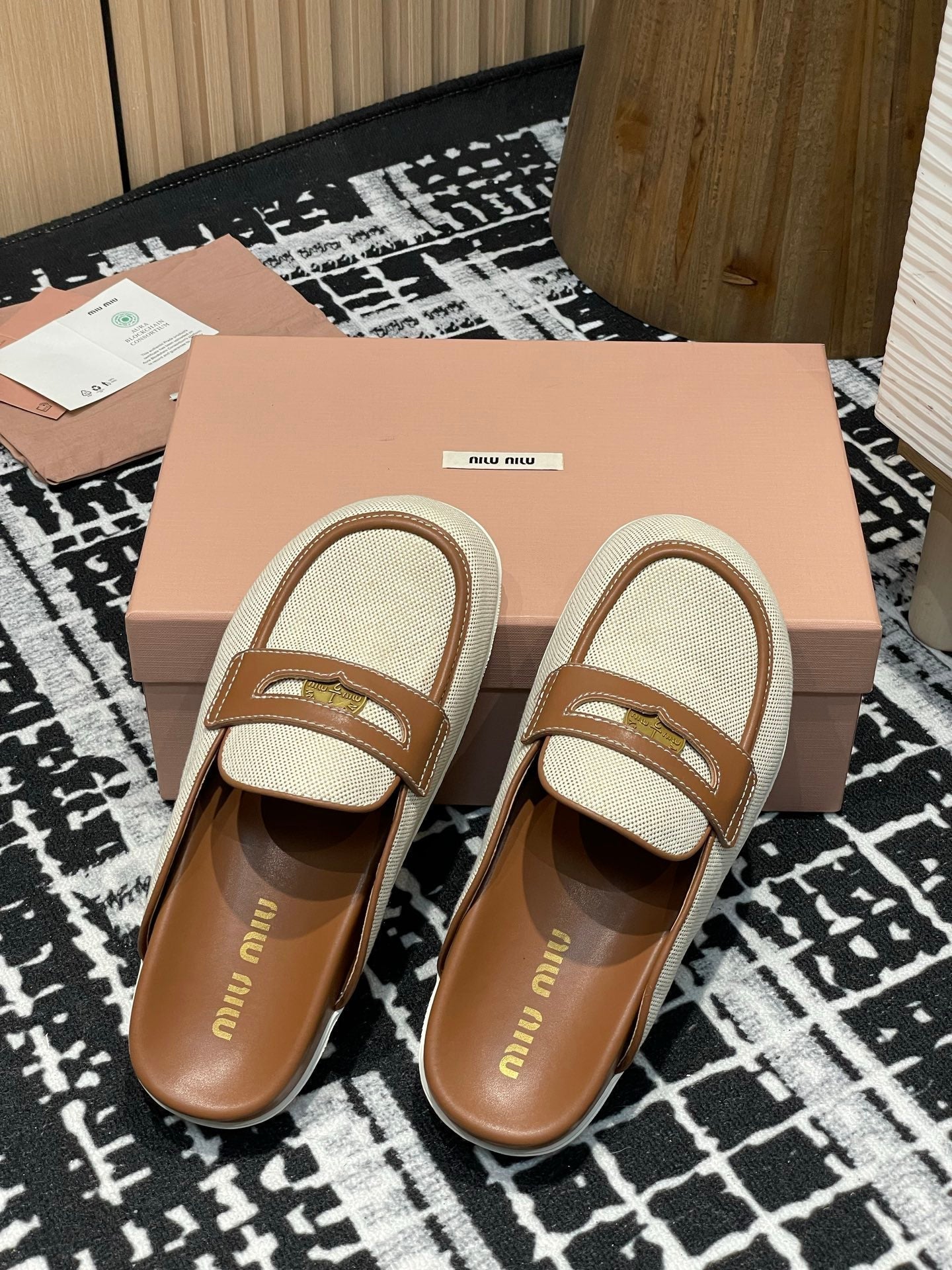 Miu 25S Beige and Brandy Canvas and leather Mules 227138