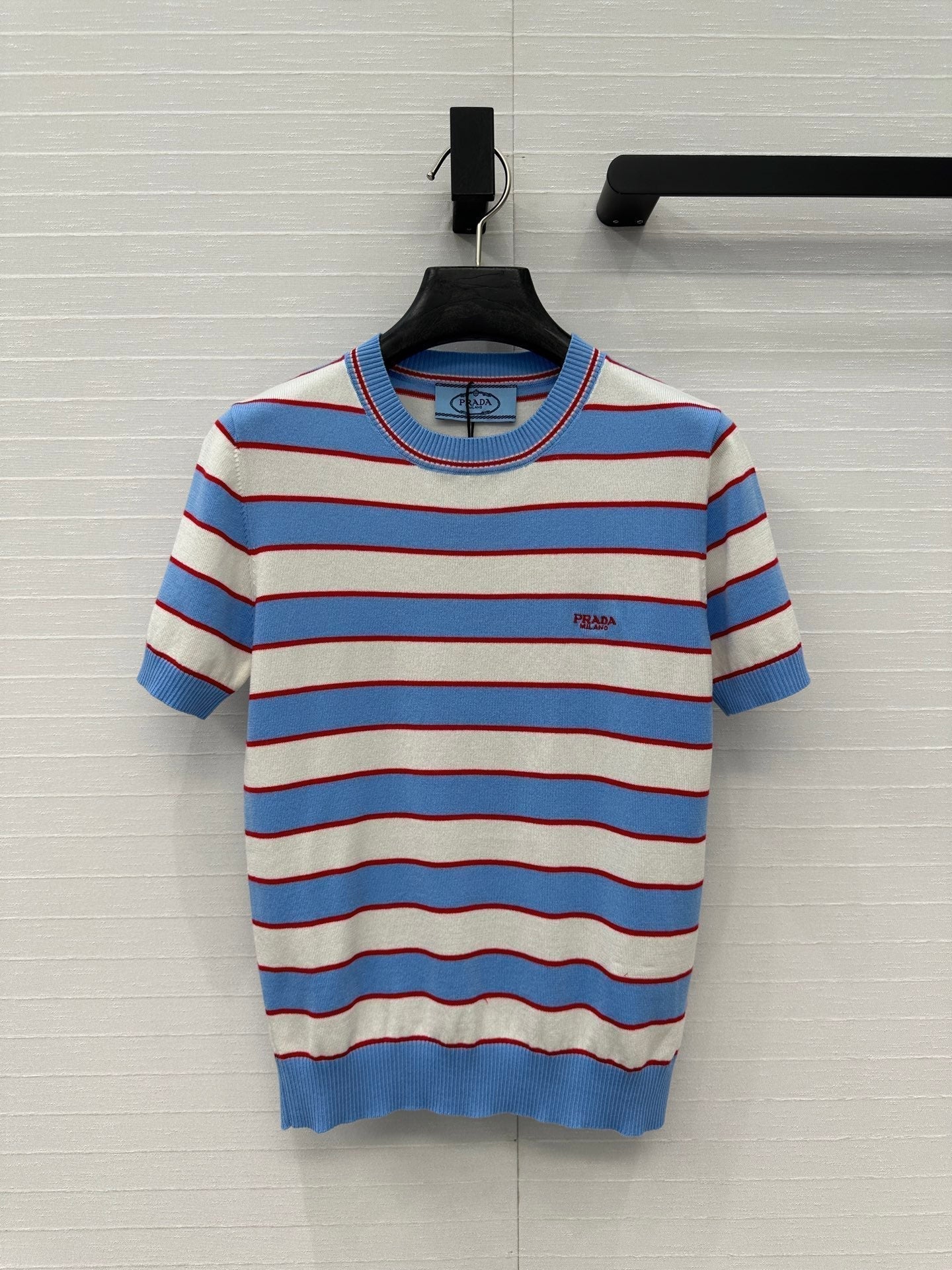 Prada 25 Striped Short-sleeved Knitted Top Blue white red Cotton