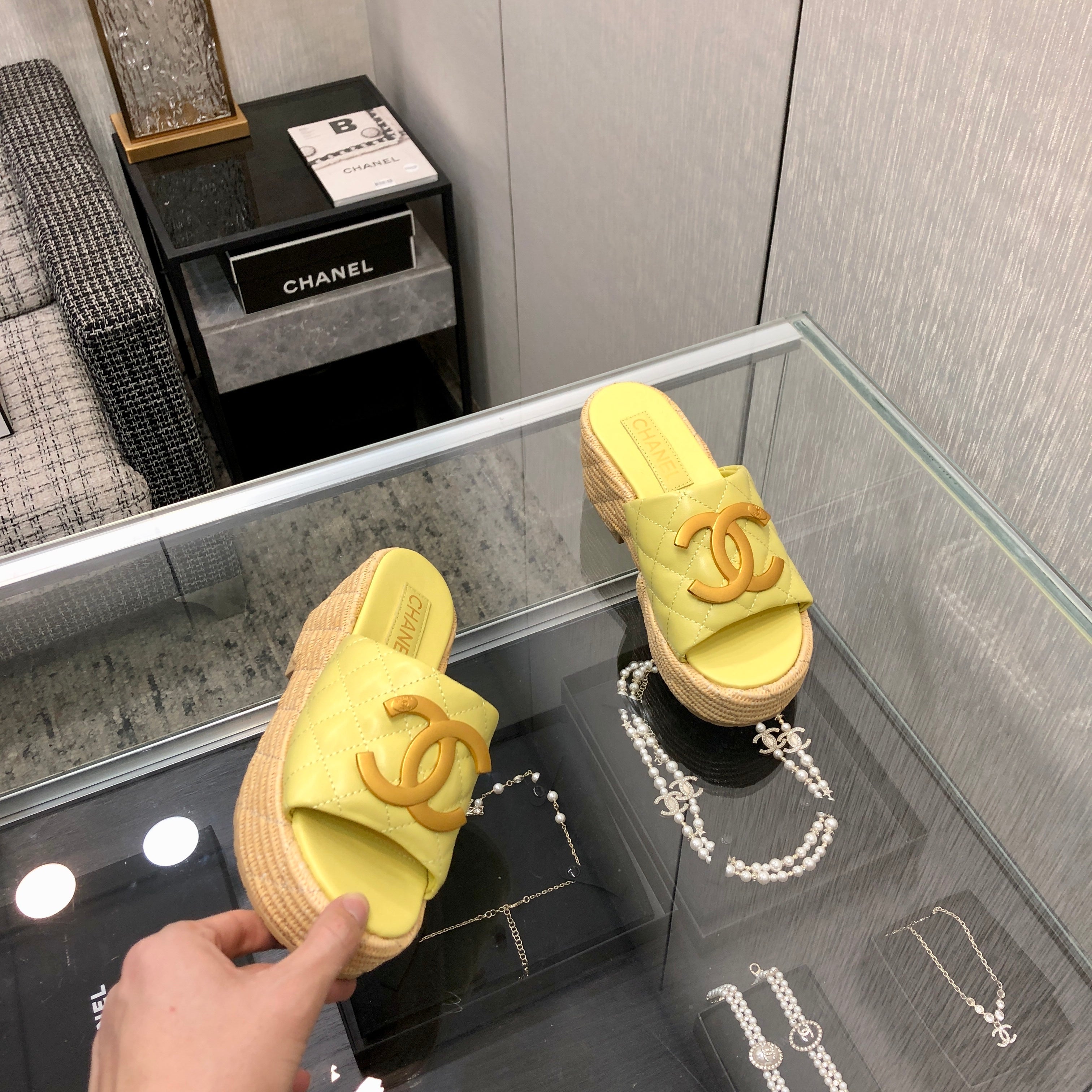 THICK SOLE WEDGE SLIPPERS IN SAND YELLOW LAMBSKIN AND BEIGE RUBBER