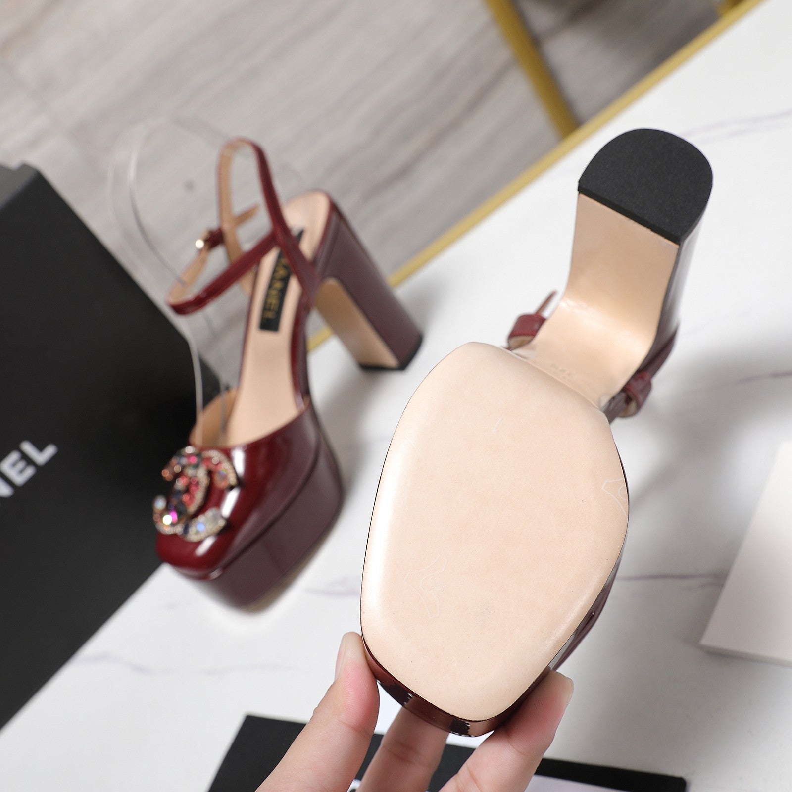 - Material: Patent Leather & Sheepskin