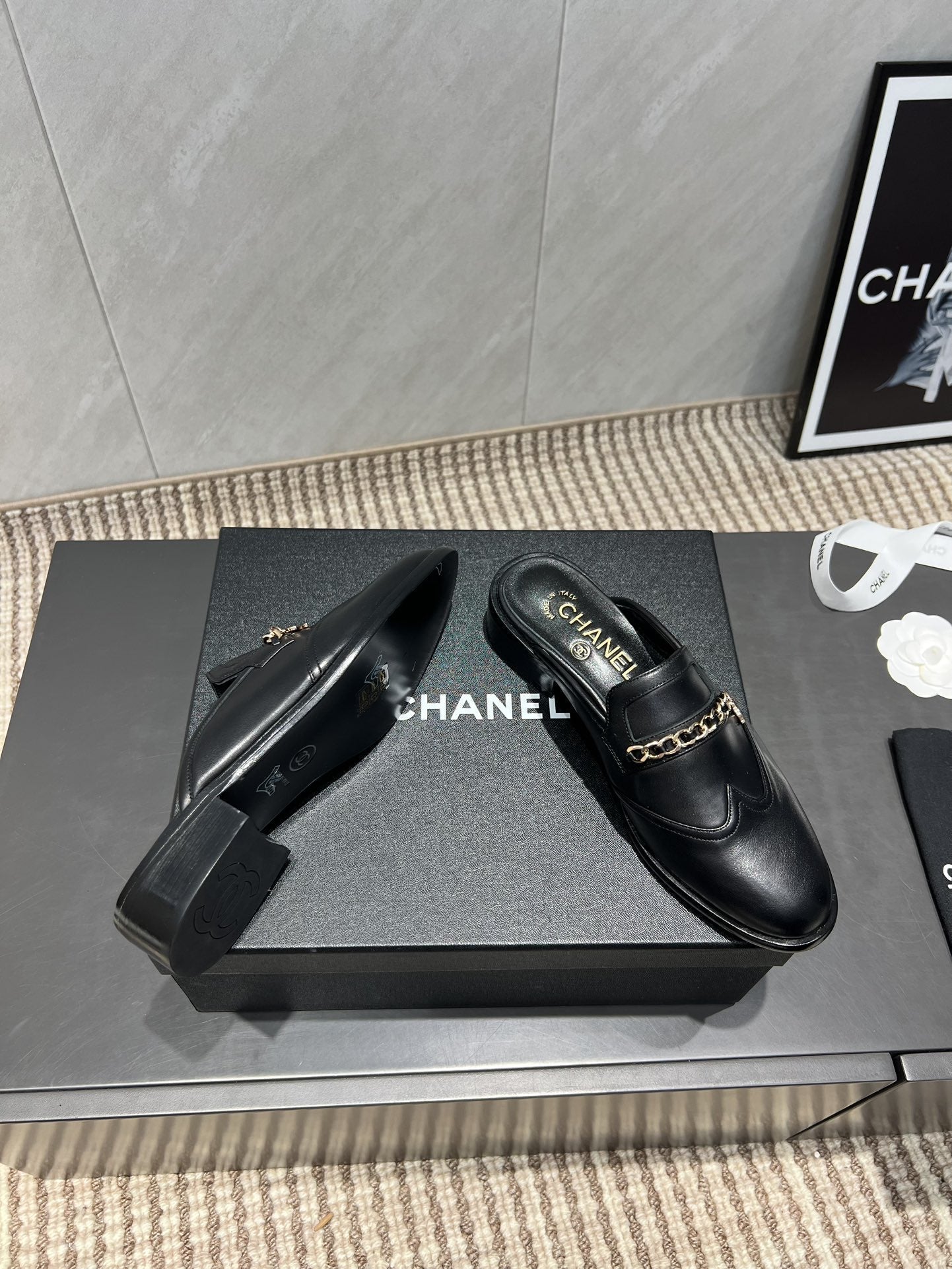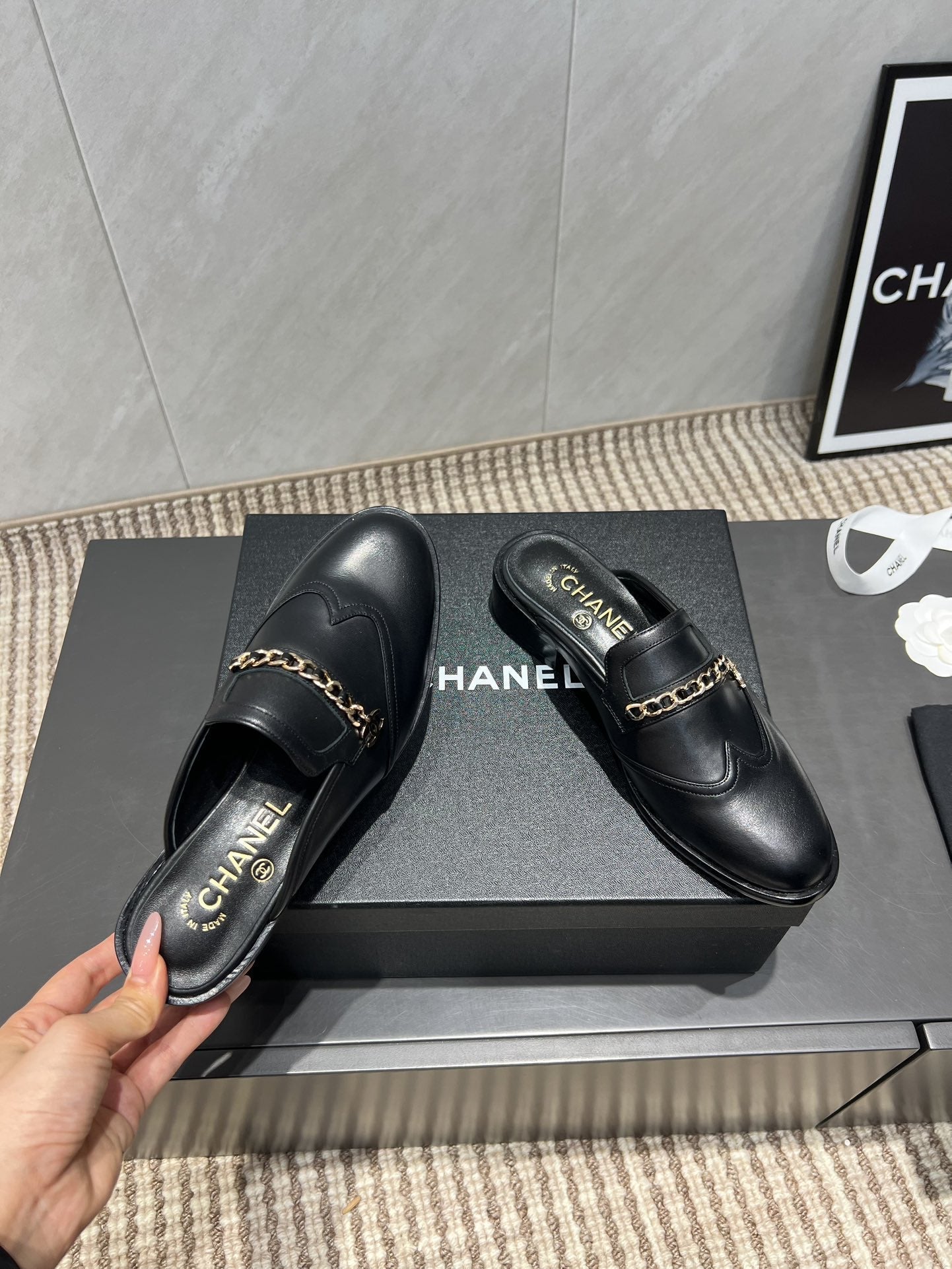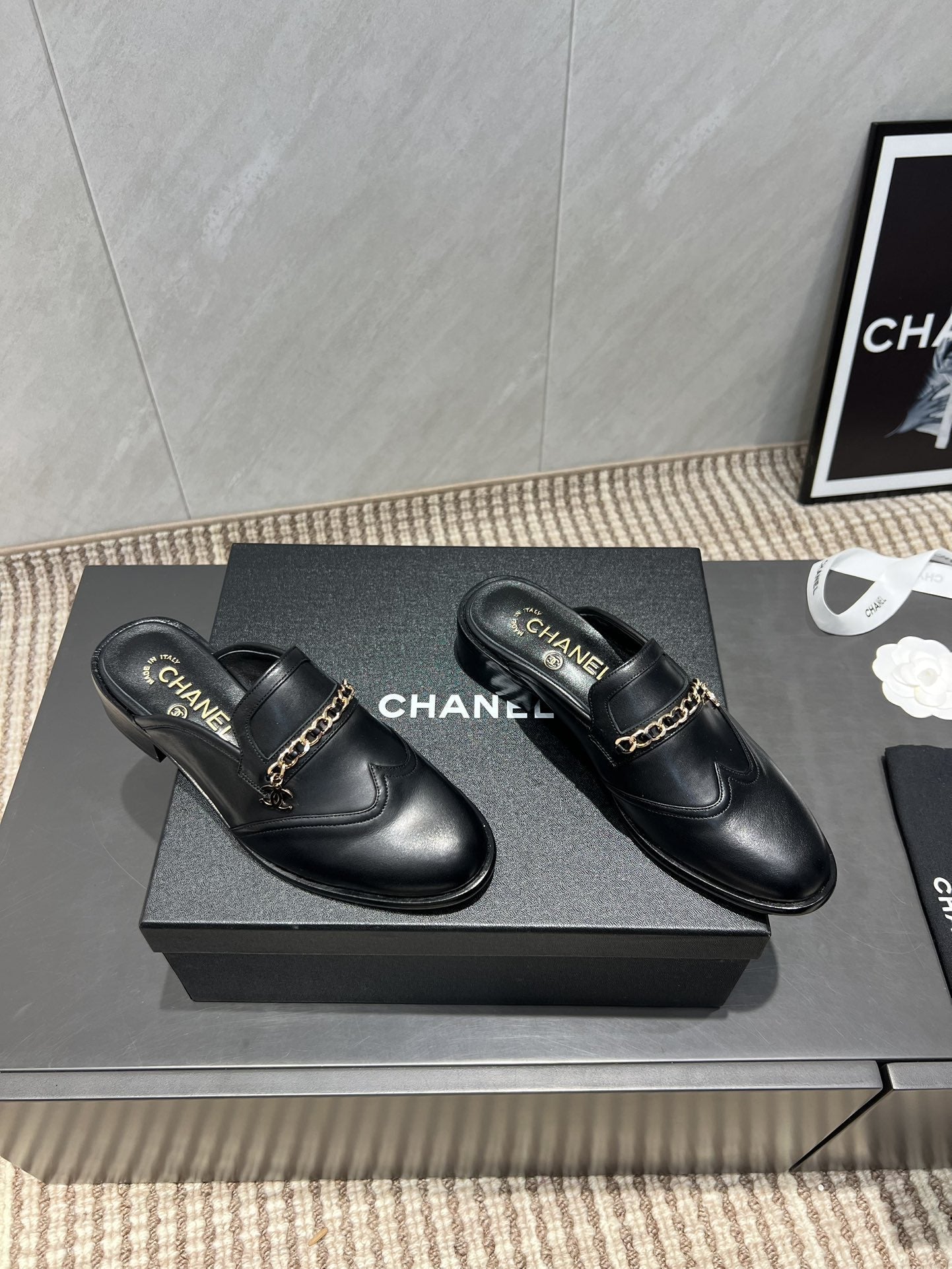 CC 25S Round Toe Chain Loafer Half Slippers in Black Cowhide 442534