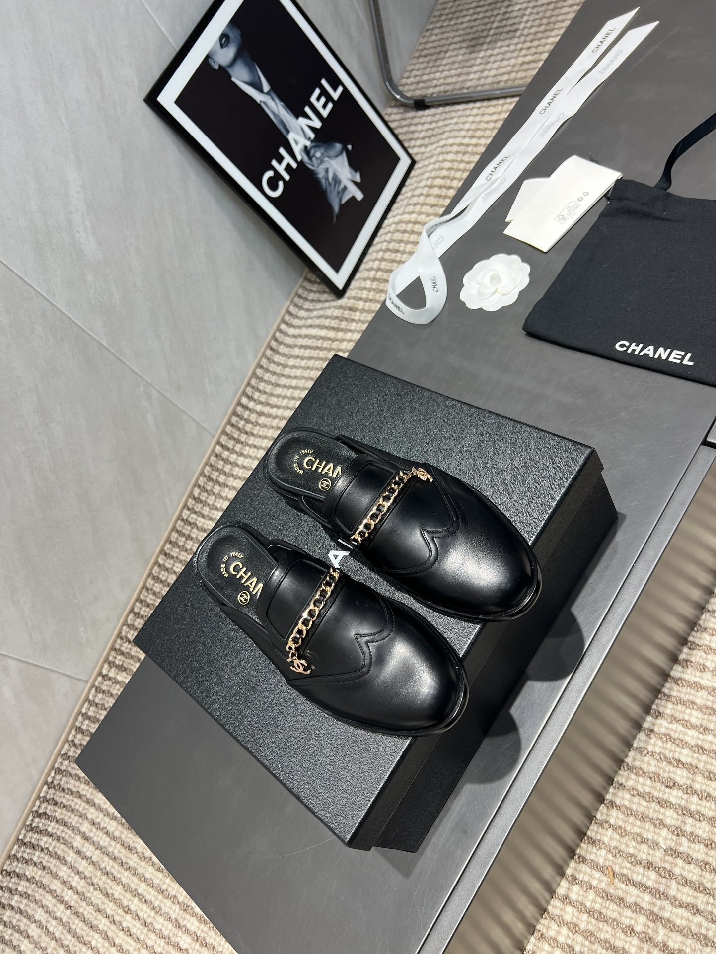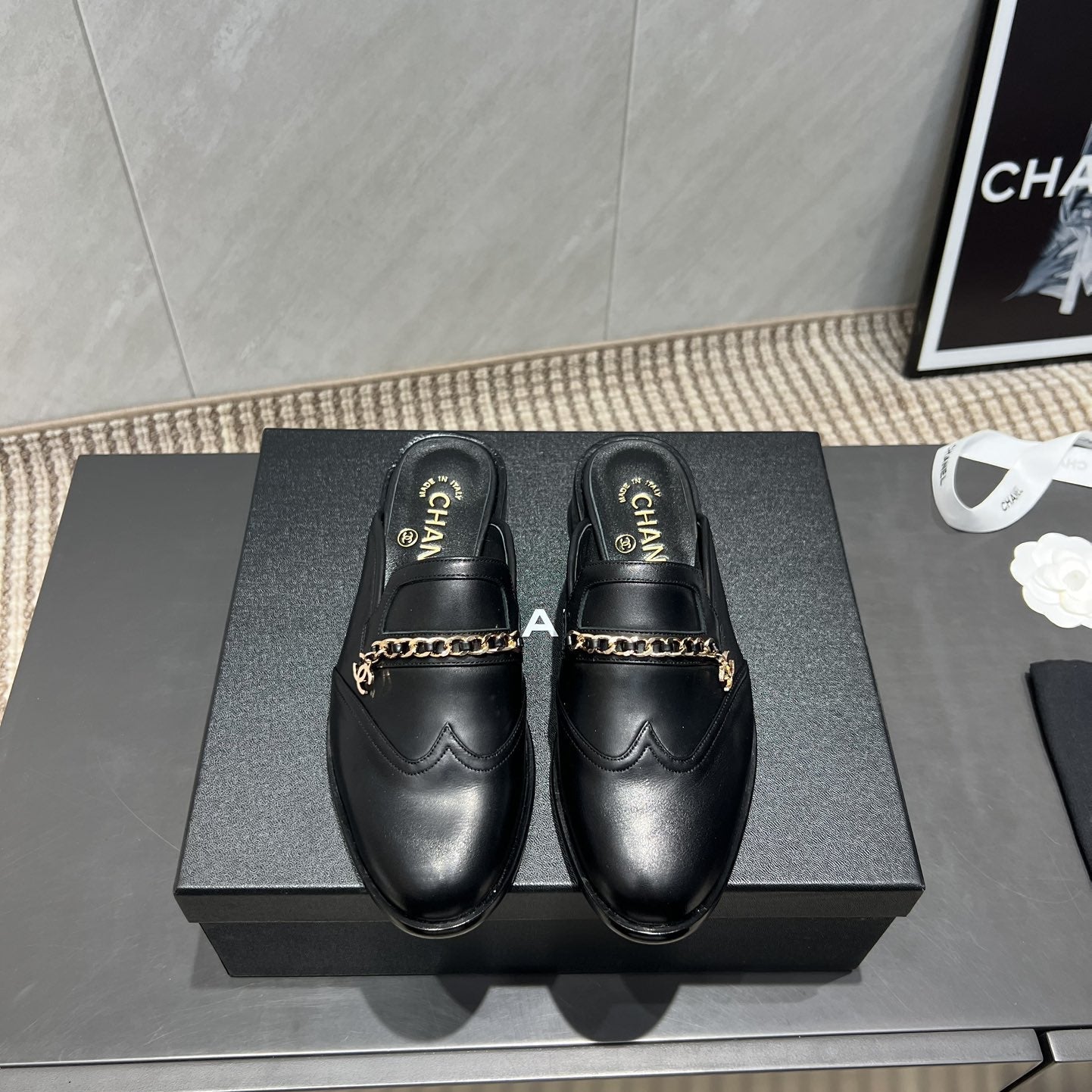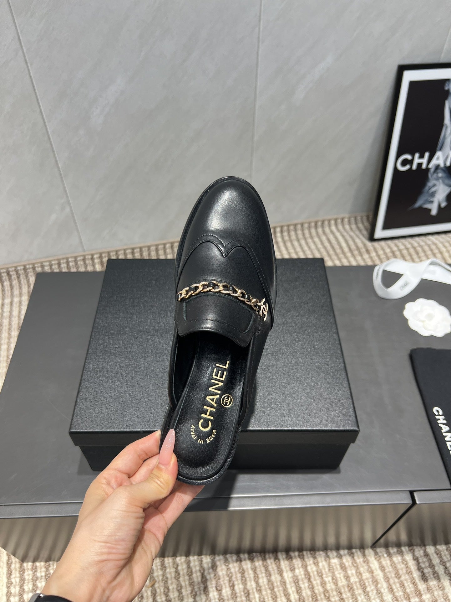 CC 25S Round Toe Chain Loafer Half Slippers in Black Cowhide 442534
