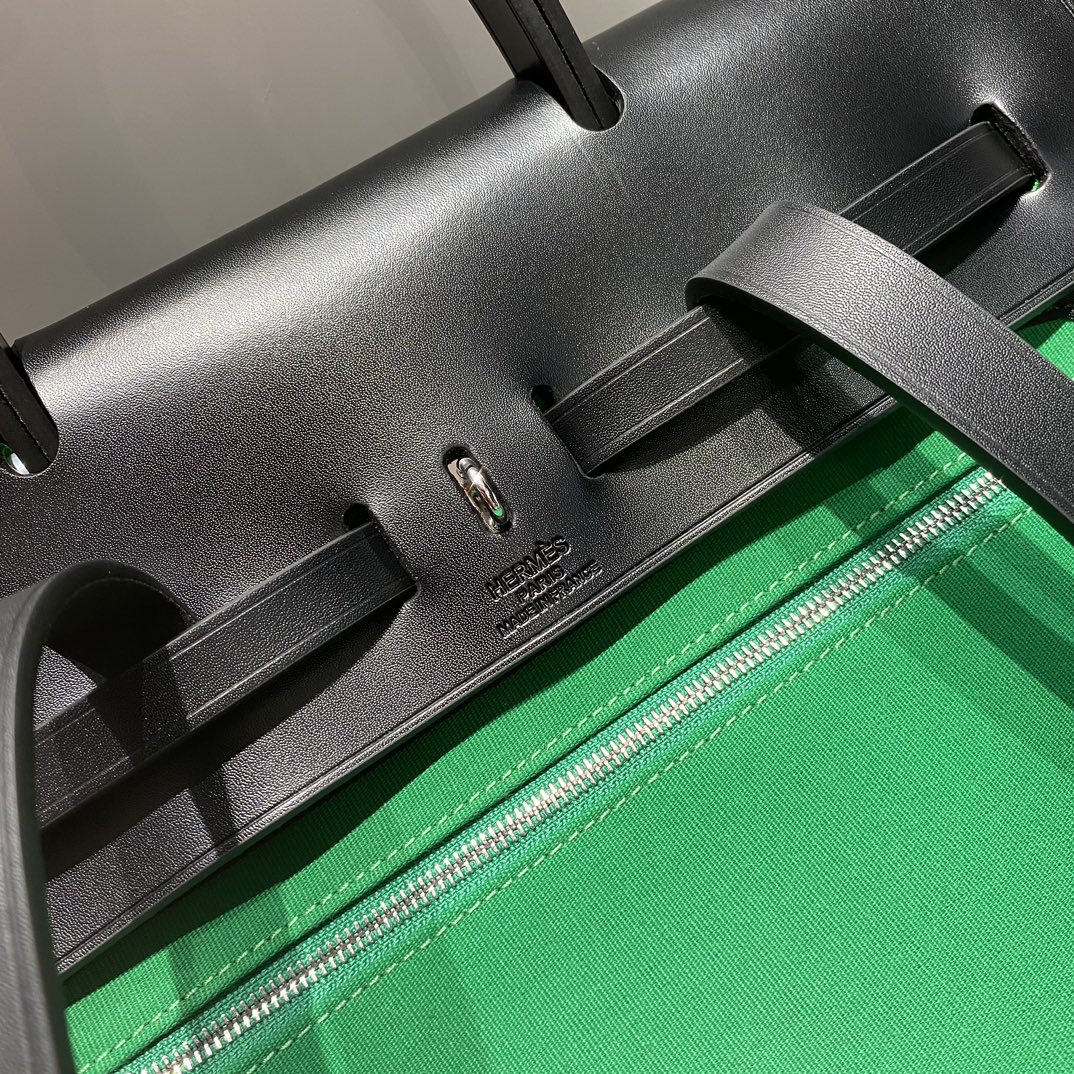 HERBAG A DOS ZIP RETOURNE BACKPACK 29 IN GREEN CANVAS AND BLACK CALFSKIN