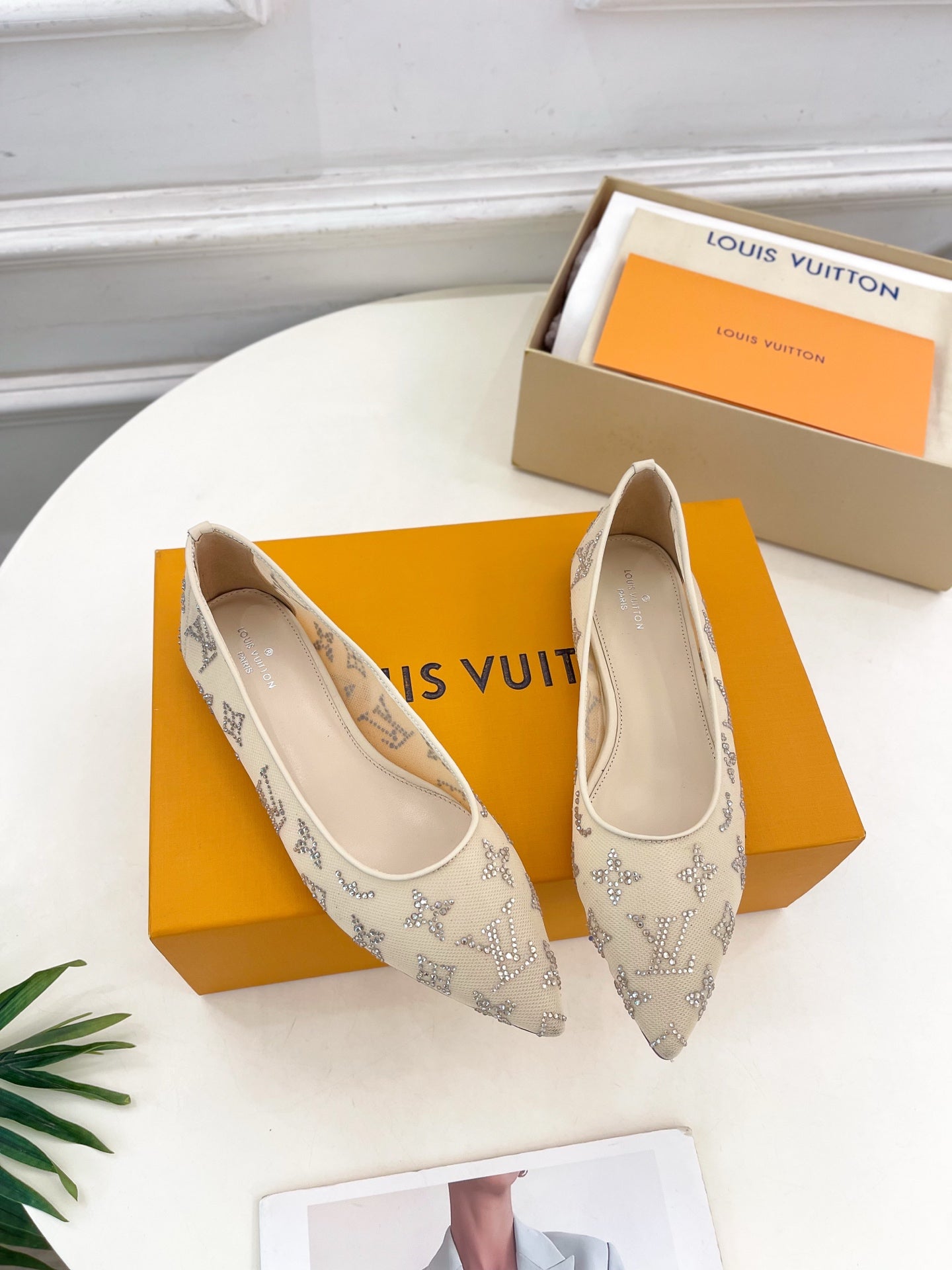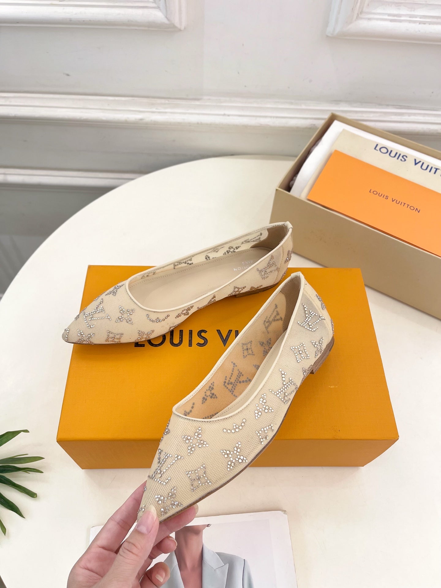 LV Gala Rhinestone Pointed Toe Flat Beige Mesh 425137