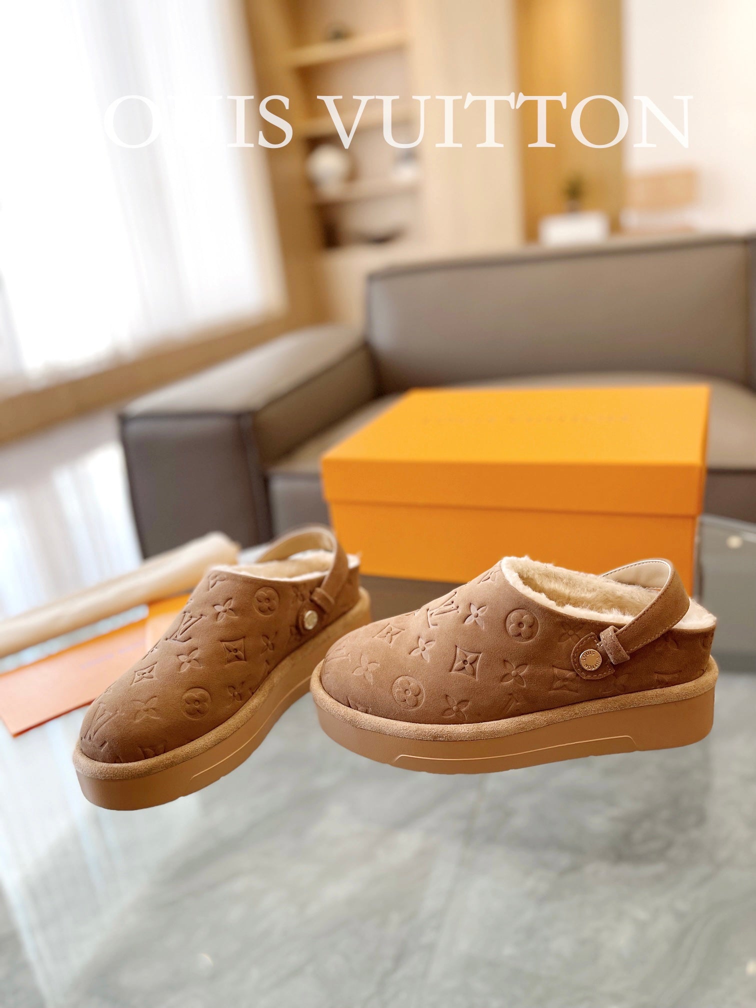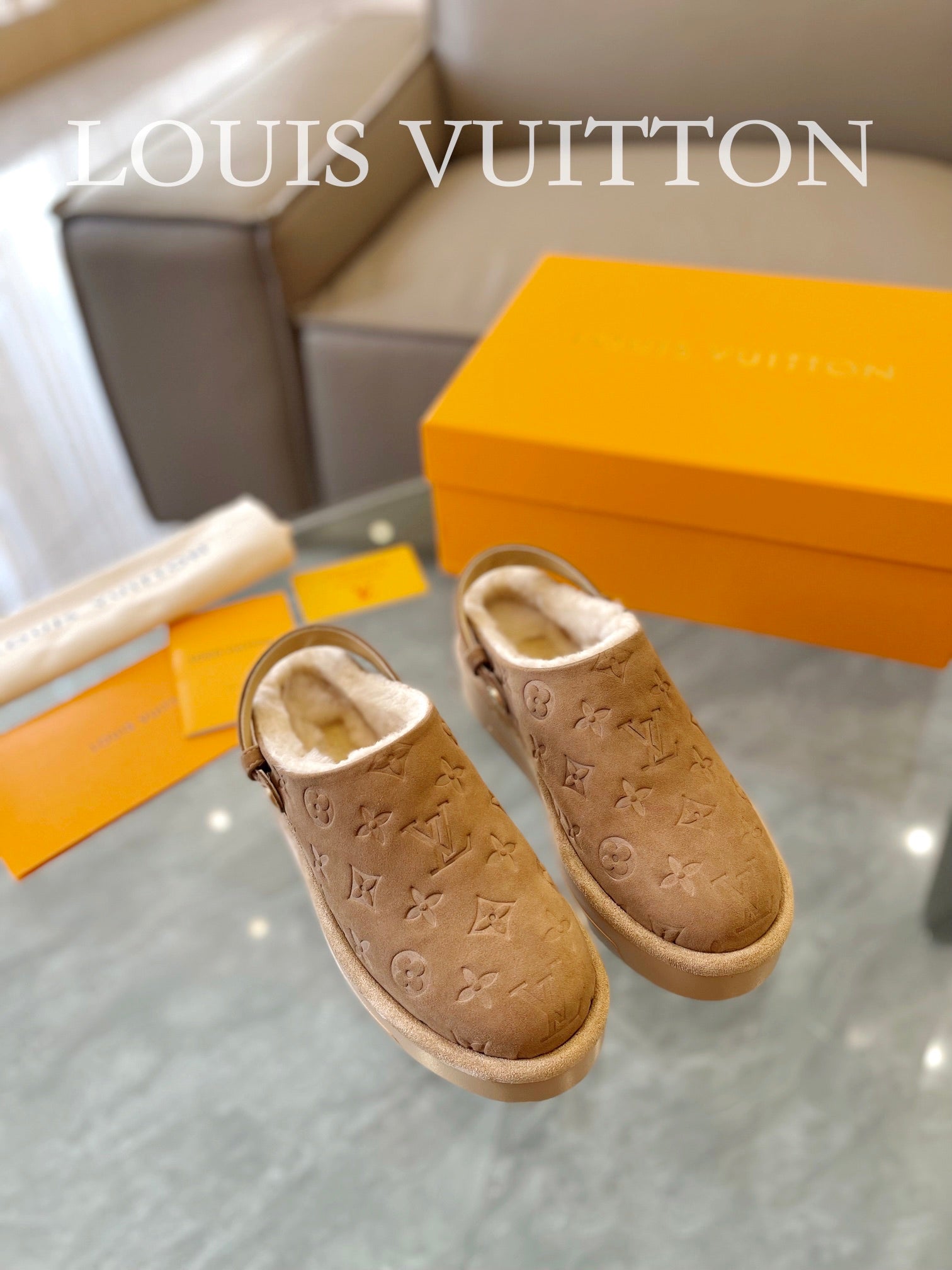 LV Aspen Platform Clog Light Brown Monogram Suede
