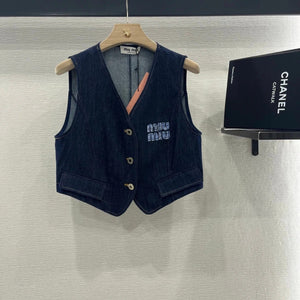 MIUMIU V-NECK BLAZER AND WIDE-LEG PANTS IN BLUE DENIM