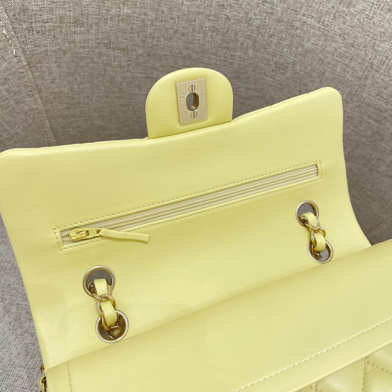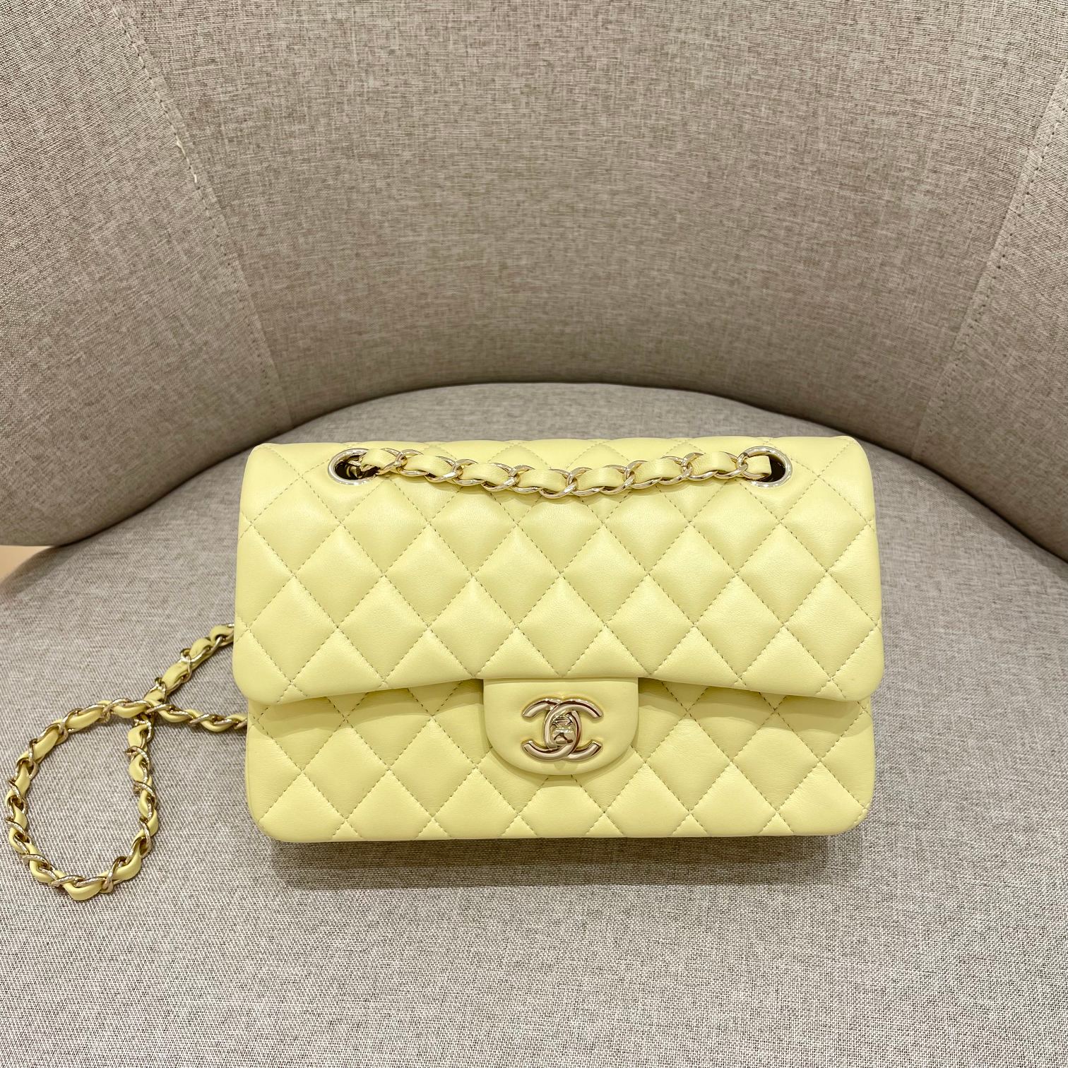 FLAP BAG 23CM PASTEL YELLOW LAMBSKIN GOLD HARDWARE