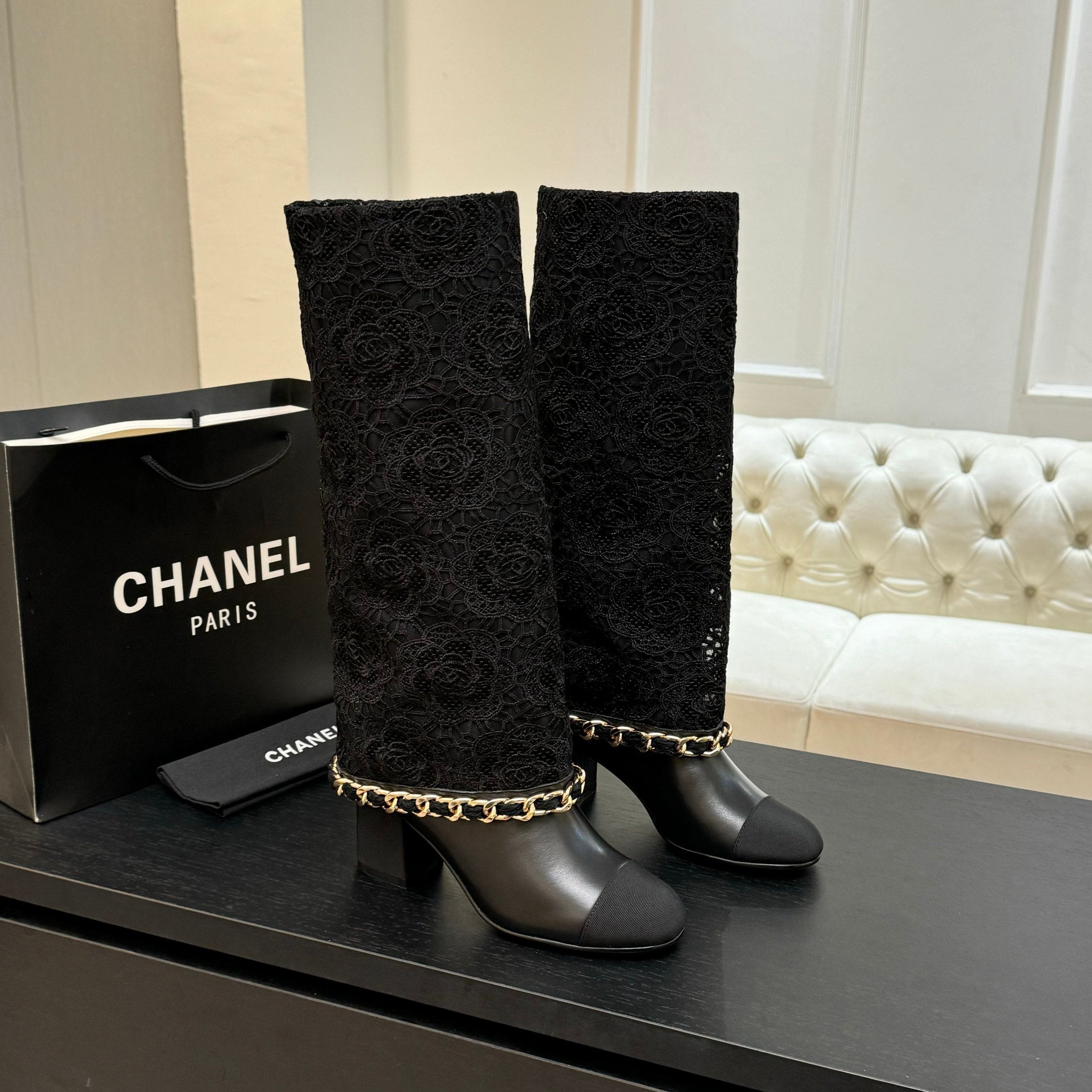 CC 25B High Boots Black Lace With Chain And Grosgrain 373806