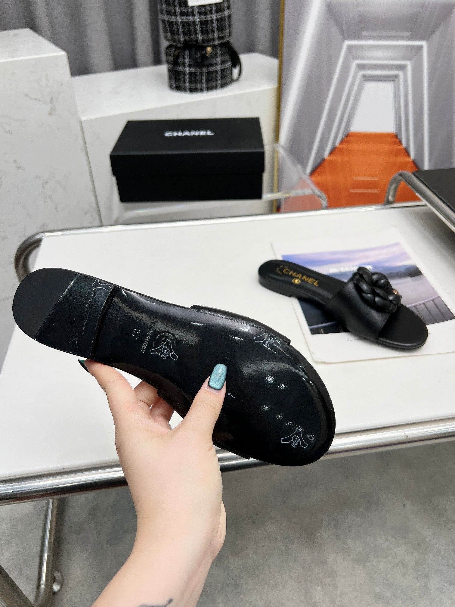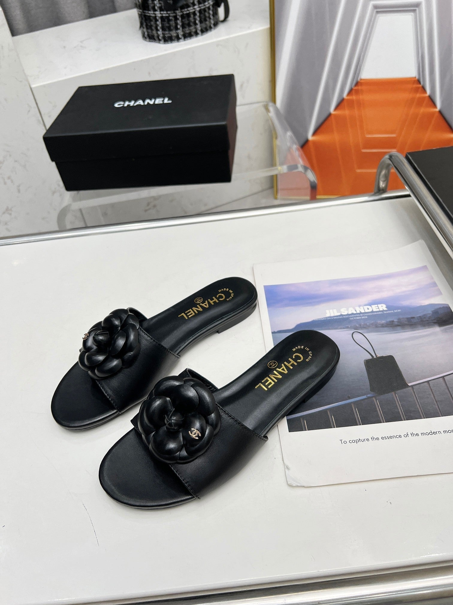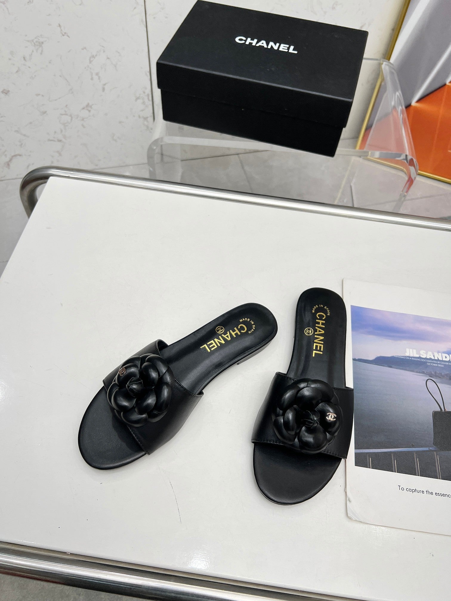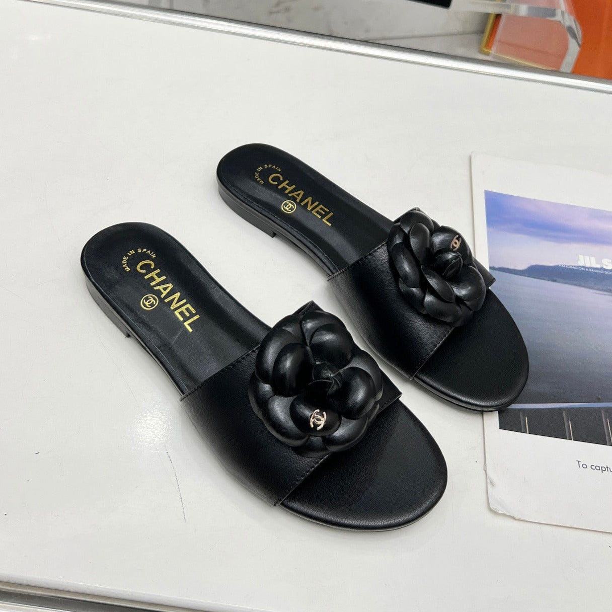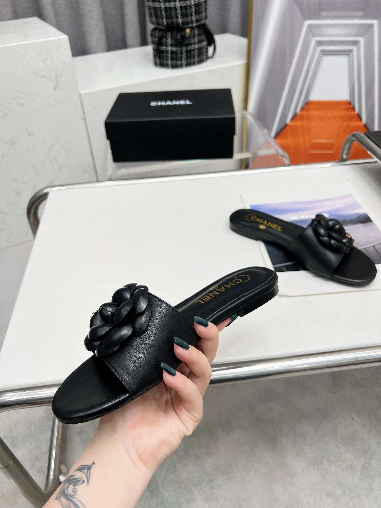 mule sandal flower black calfskin