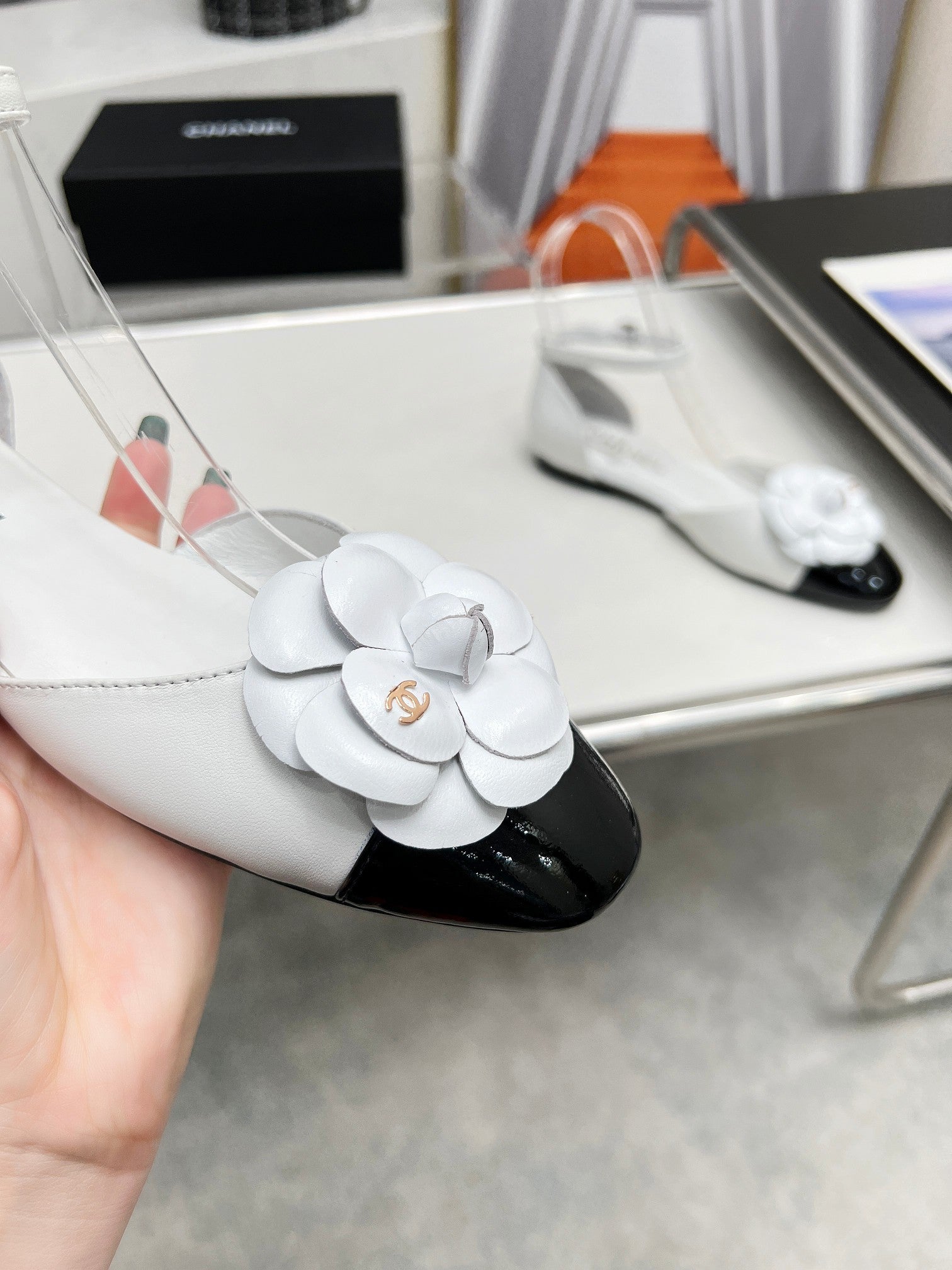 mule sandal flower wedge heel white black calfskin