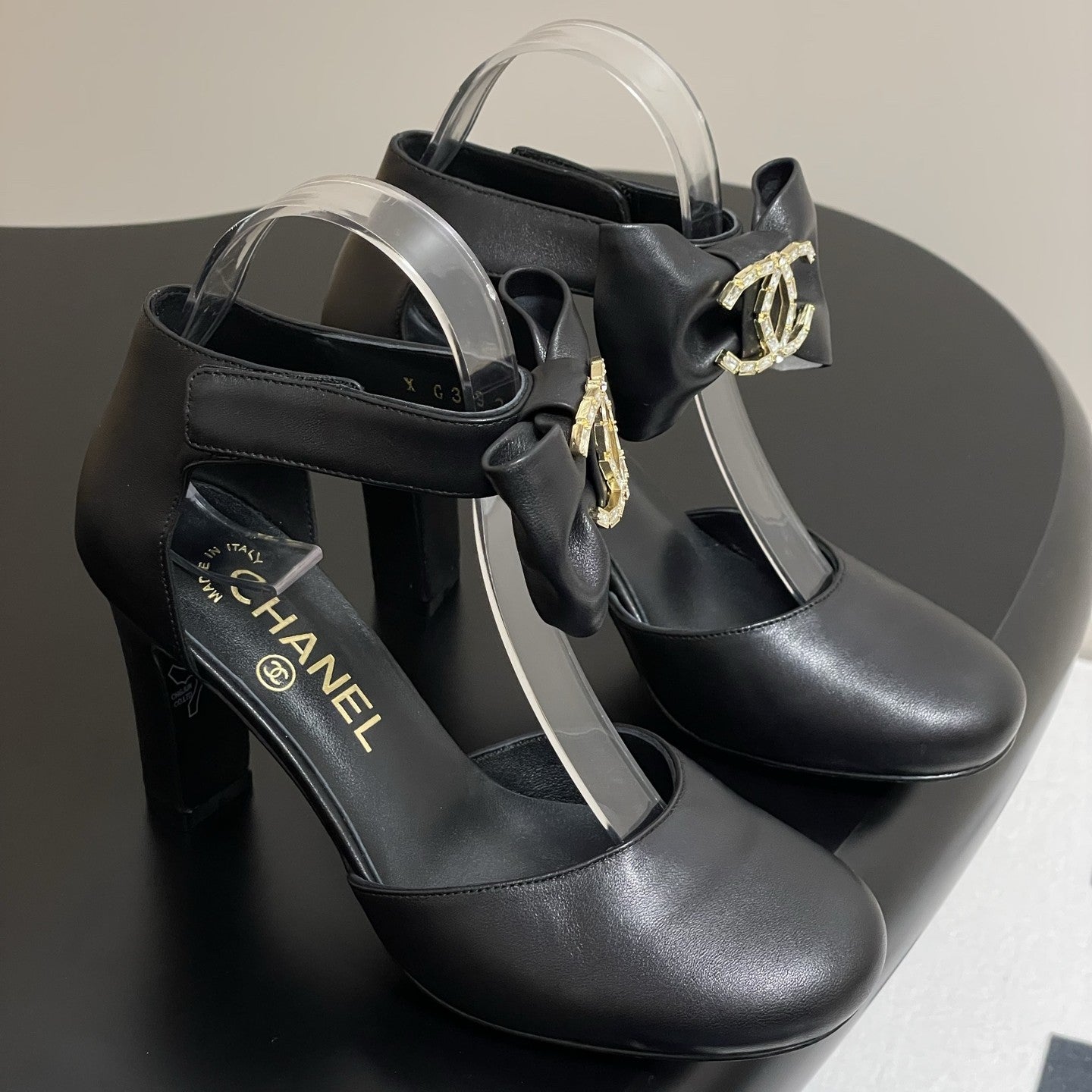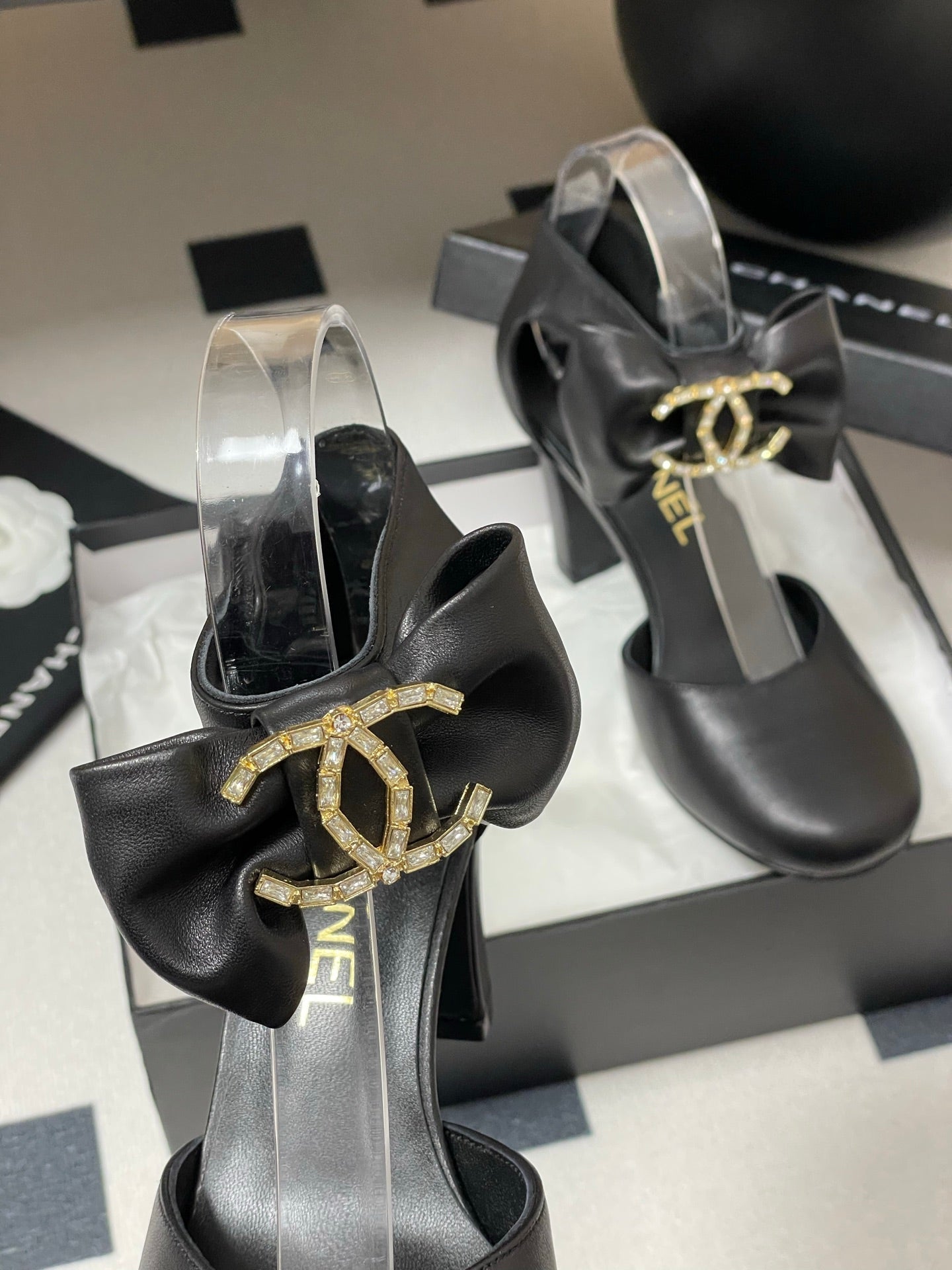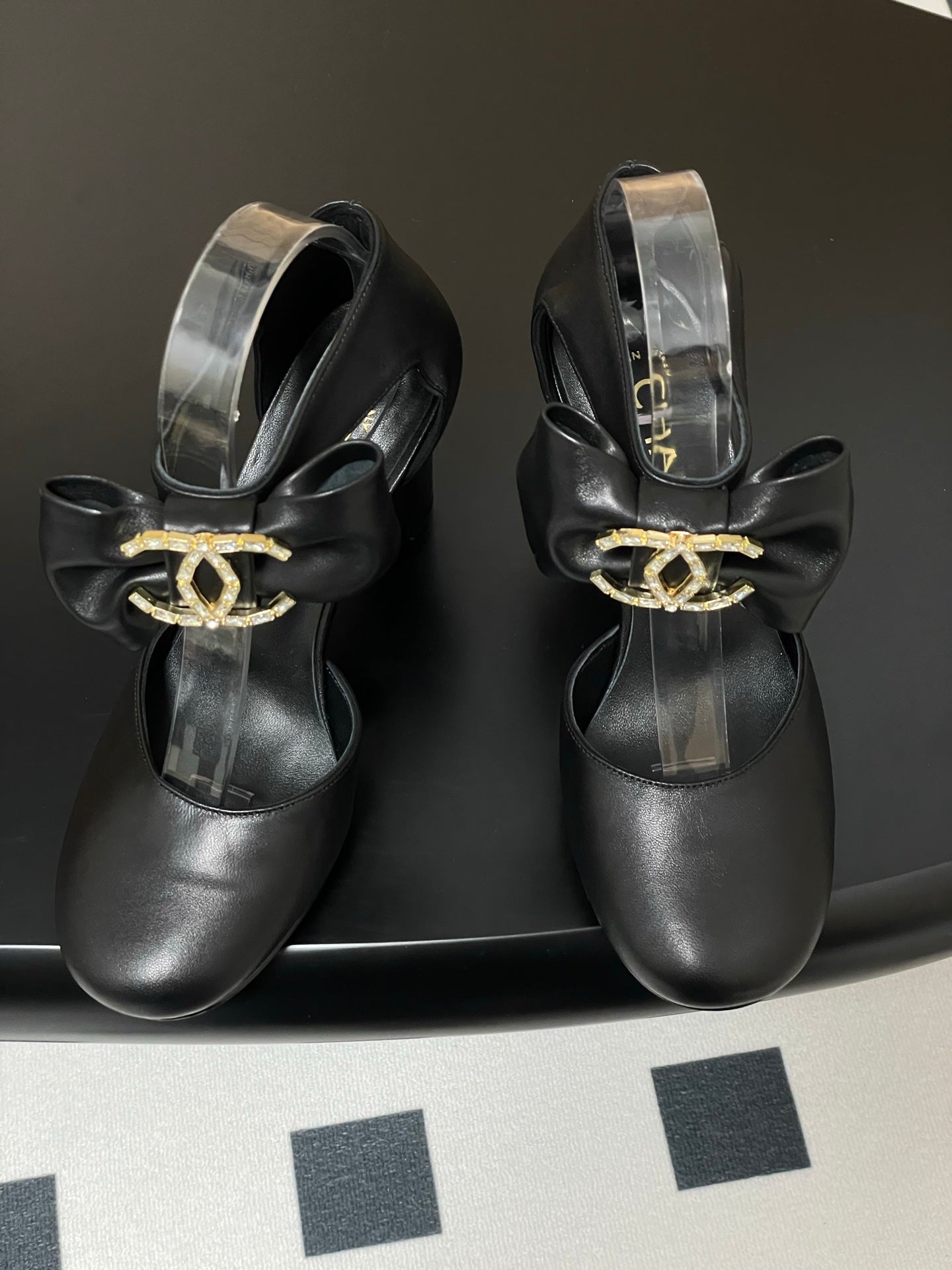 CC 25S Double C Rhinestone Buckle Bow High Heel Pump 85 Black Sheepskin 247573
