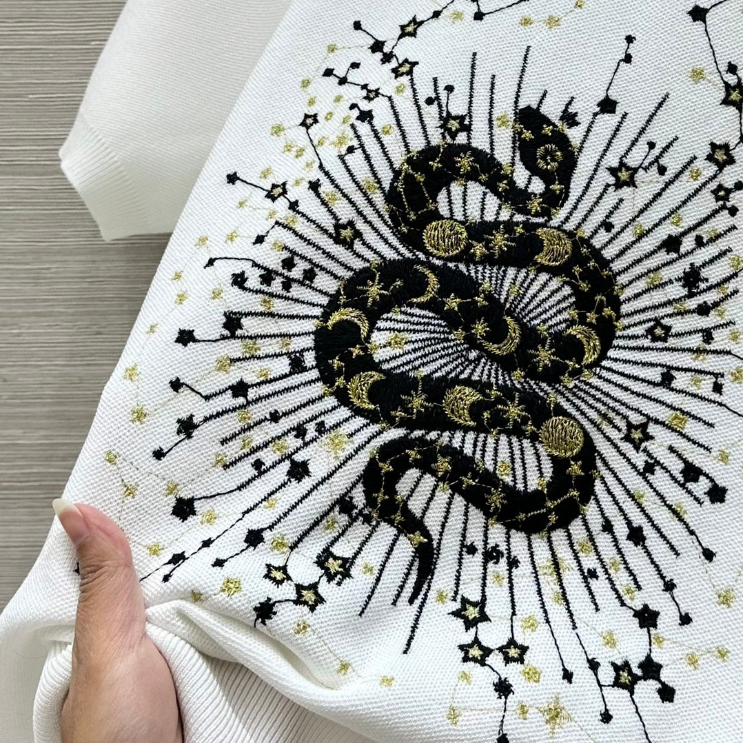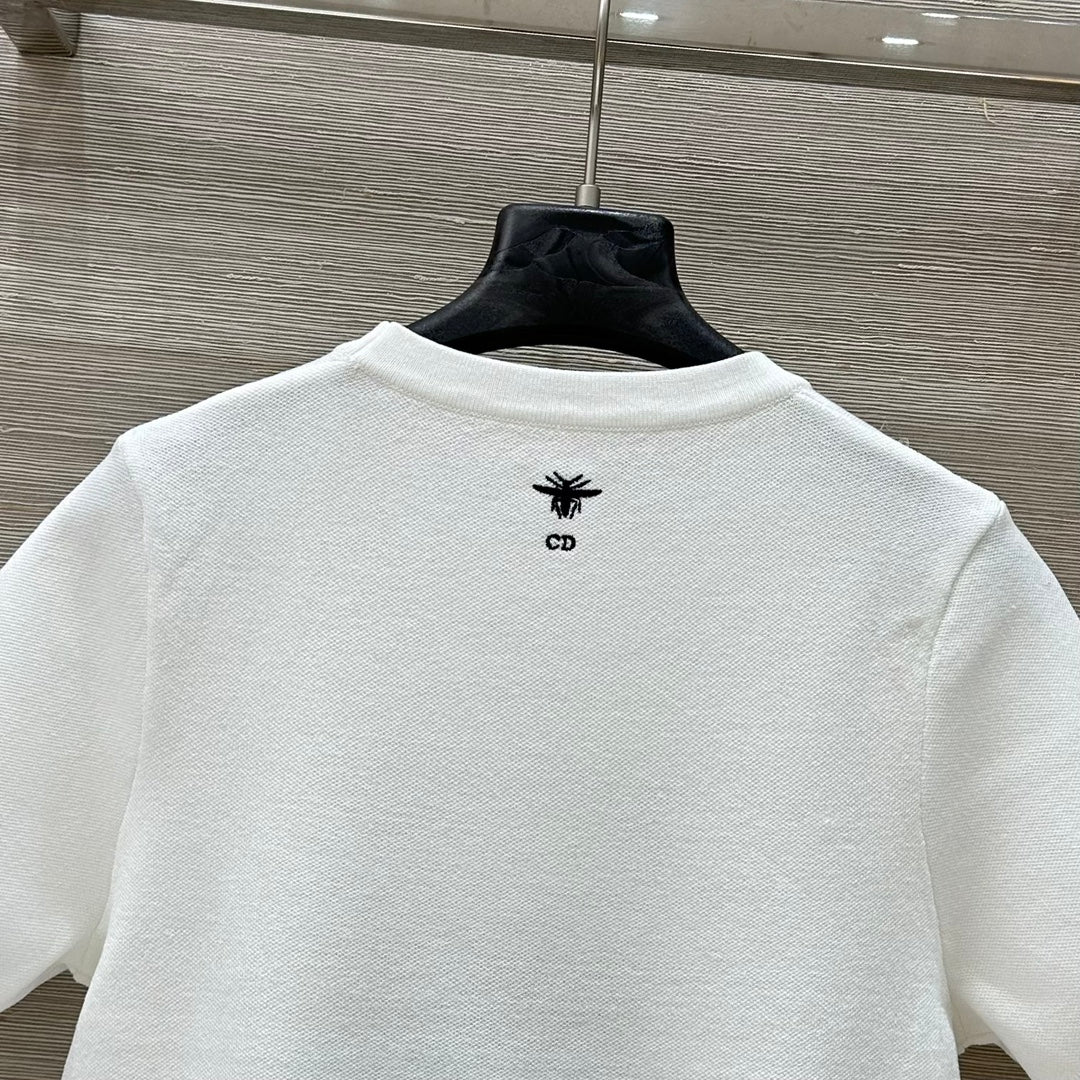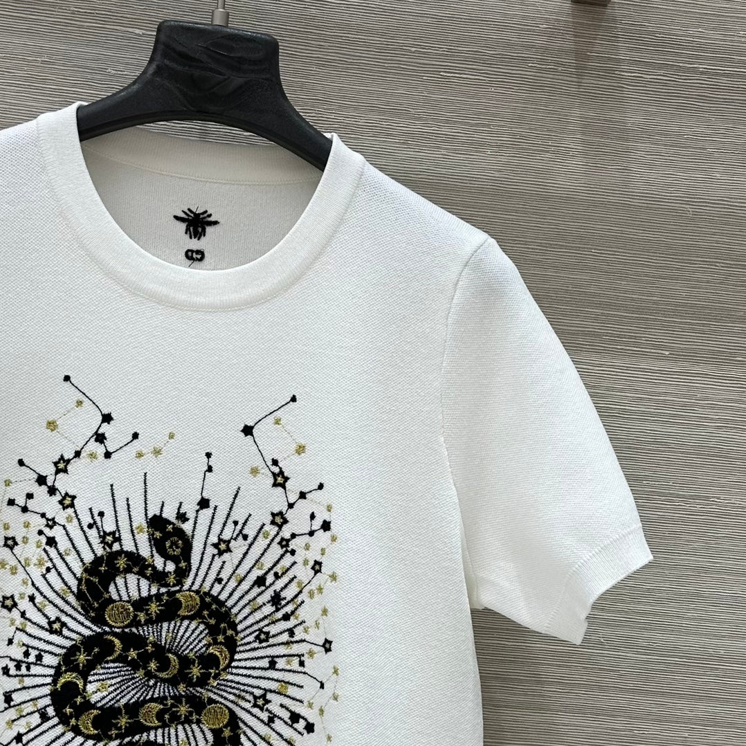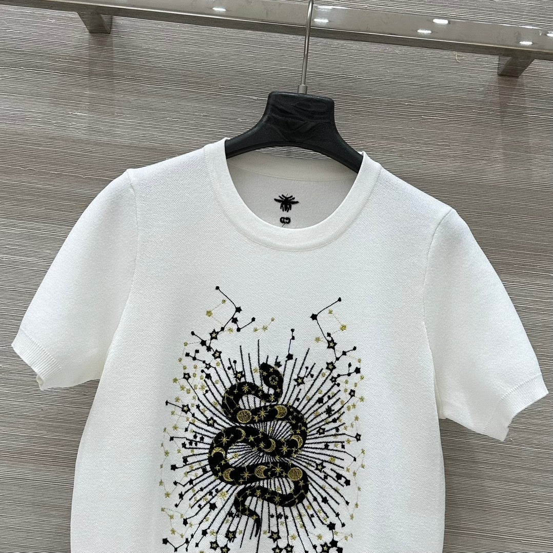 CD 25 Snake Embroidery Knitted Short-sleeved Top White Tencel Wool