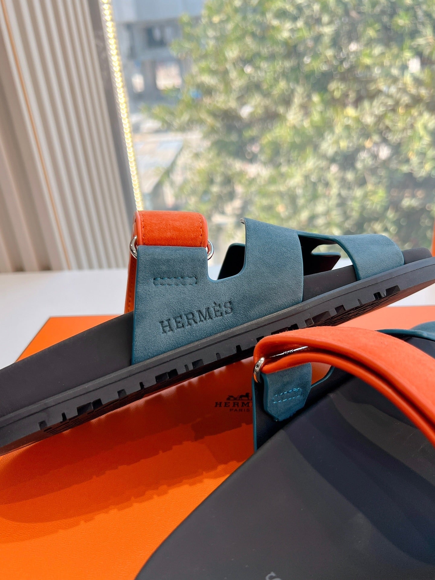 CHYPRE SANDAL IN TEAL GREEN MIX FIRE ORANGE SUEDE