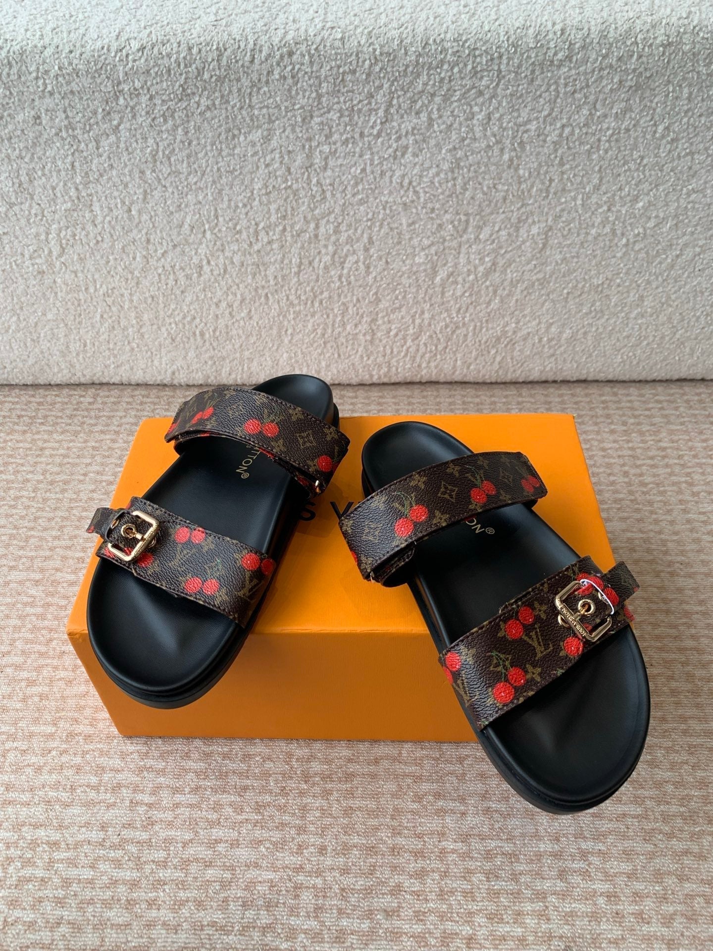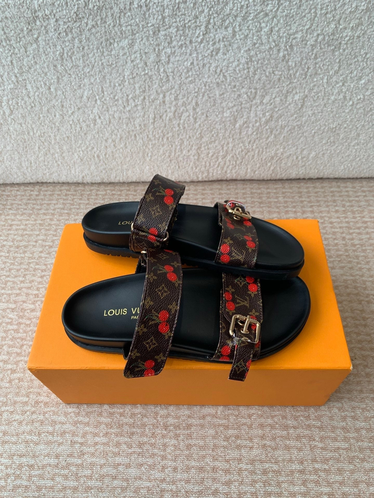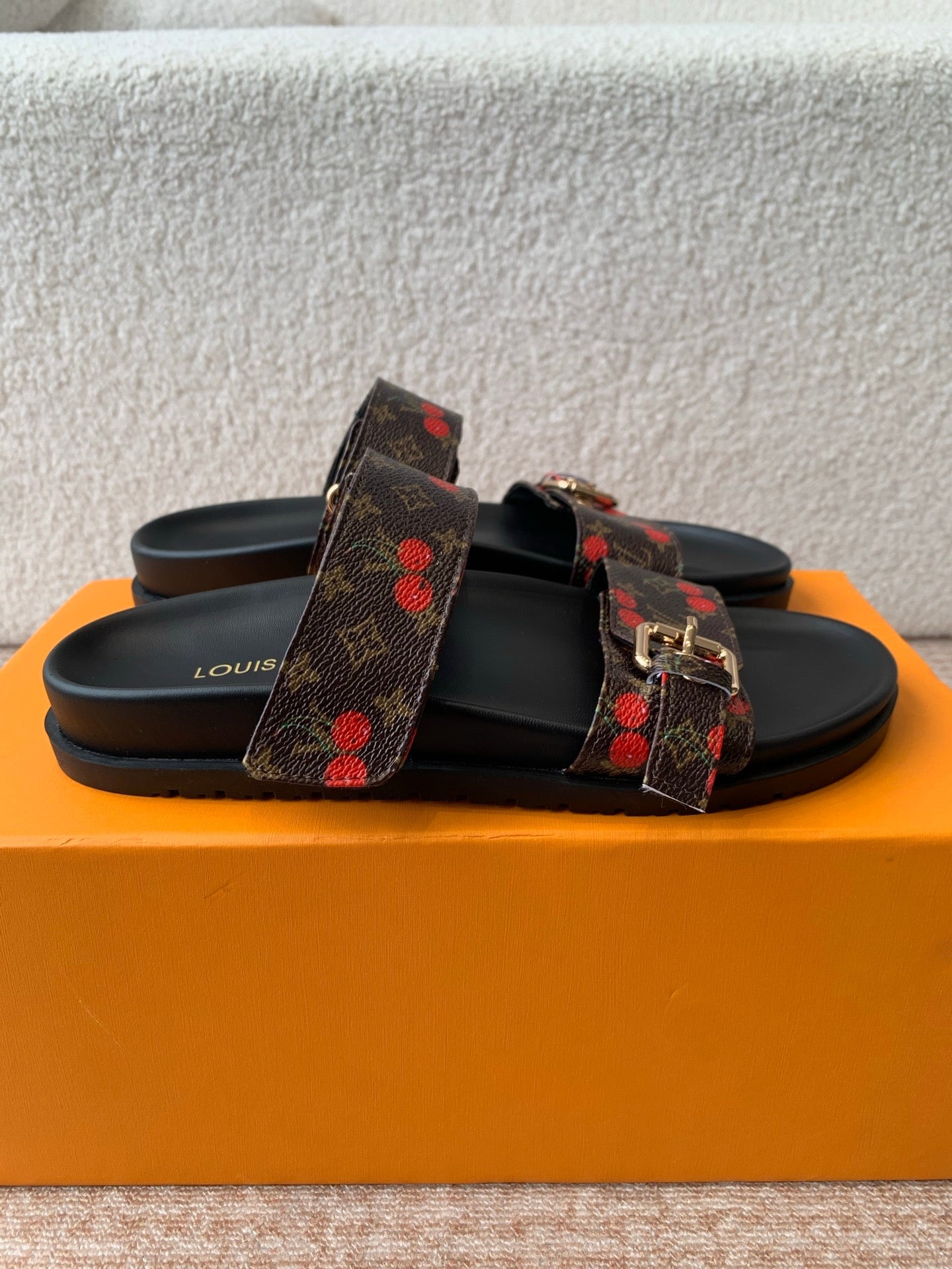 Bom Dia Flat Comfort Mule LV x TM Brown Sheepskin Mix Cherry Motif 319378