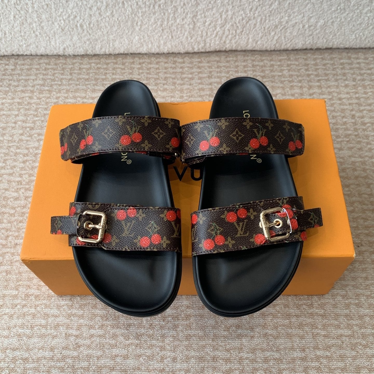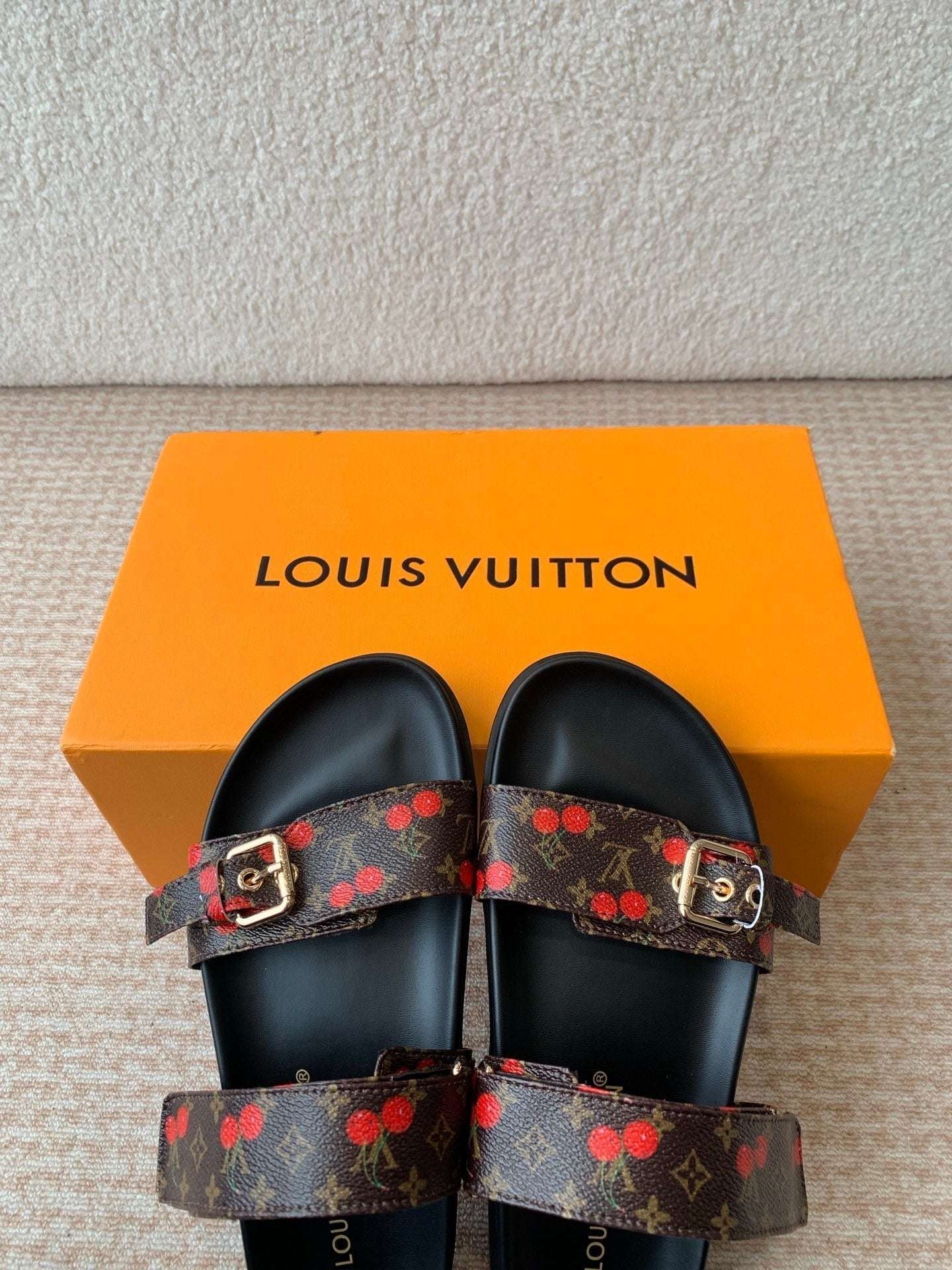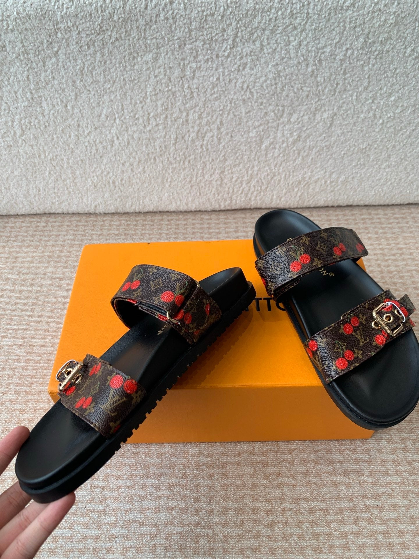 Bom Dia Flat Comfort Mule LV x TM Brown Sheepskin Mix Cherry Motif 319378