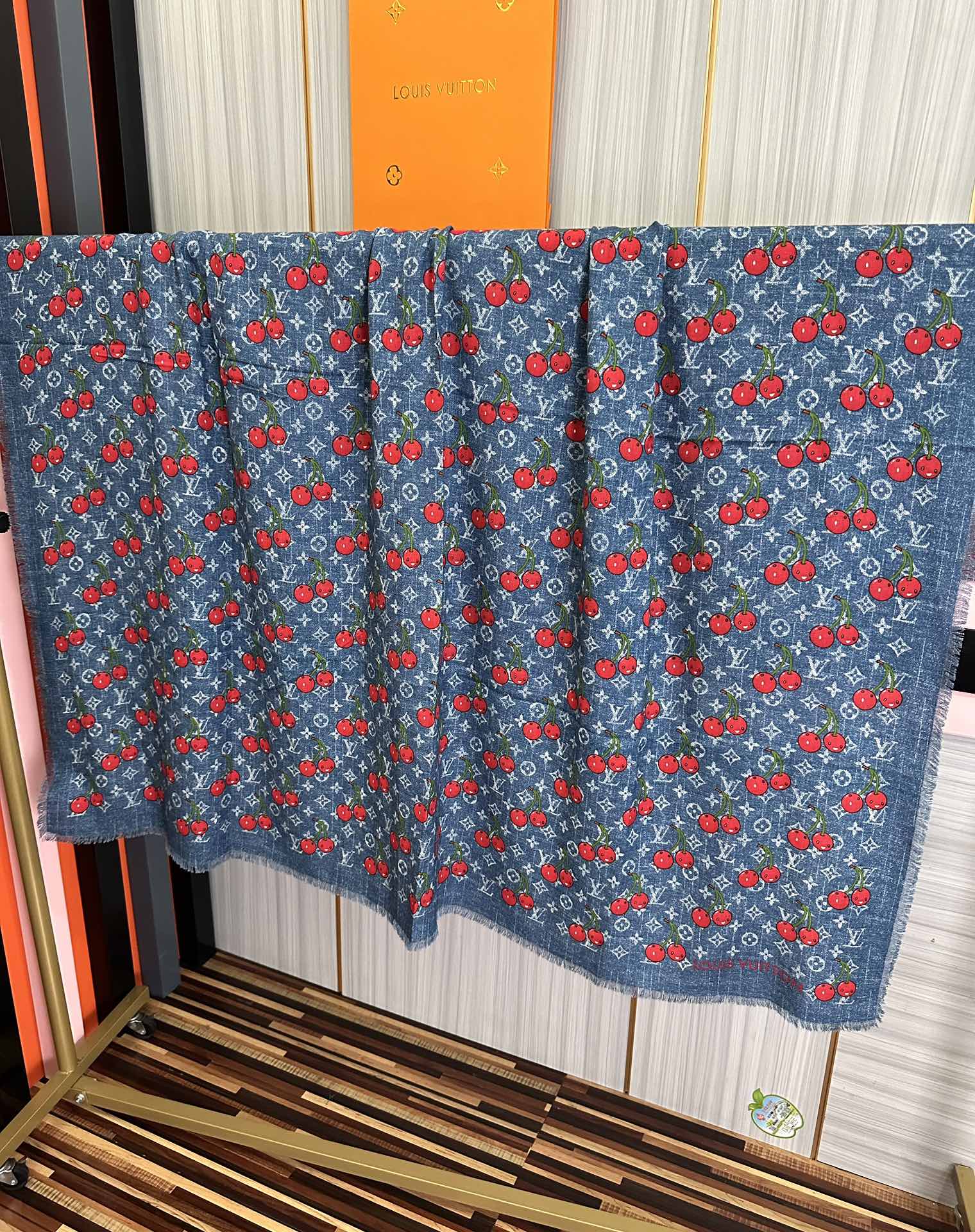 LV Double-Sided Cherry Square Scarf 140cm Blue Silk Cashmere 839716