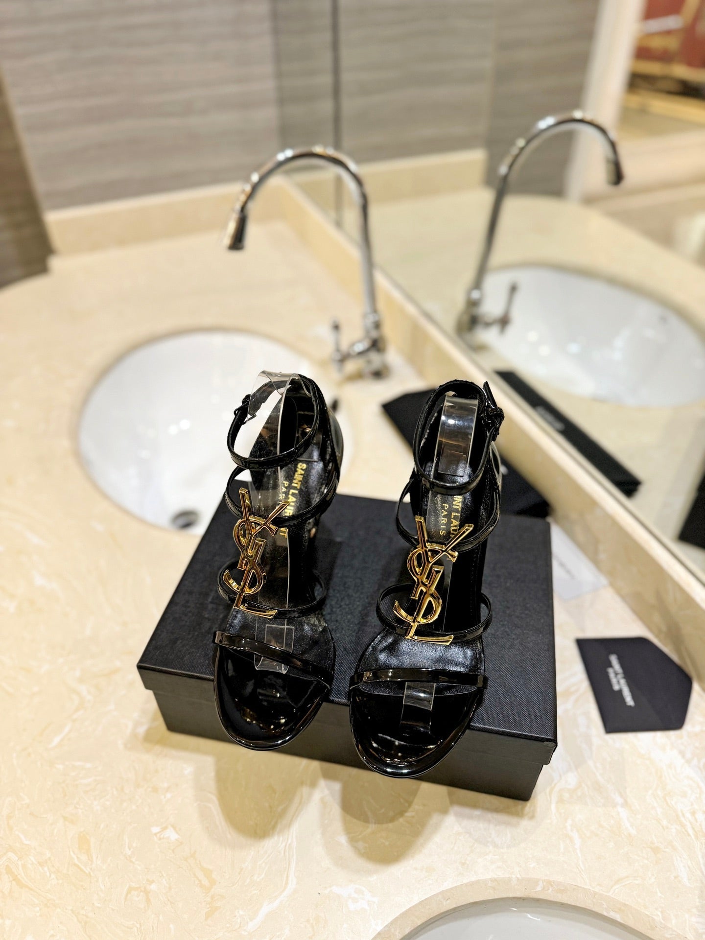 SL CASSANDRA HEELED SANDALS BLACK-GOLD CALFSKIN