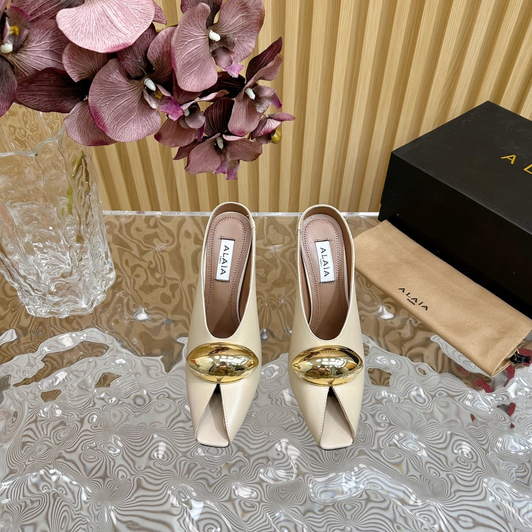 ALAIA AZZEDINE HIGH HEELS IN BEIGE CREAM CALFSKIN WITH GOLD HARDWARE