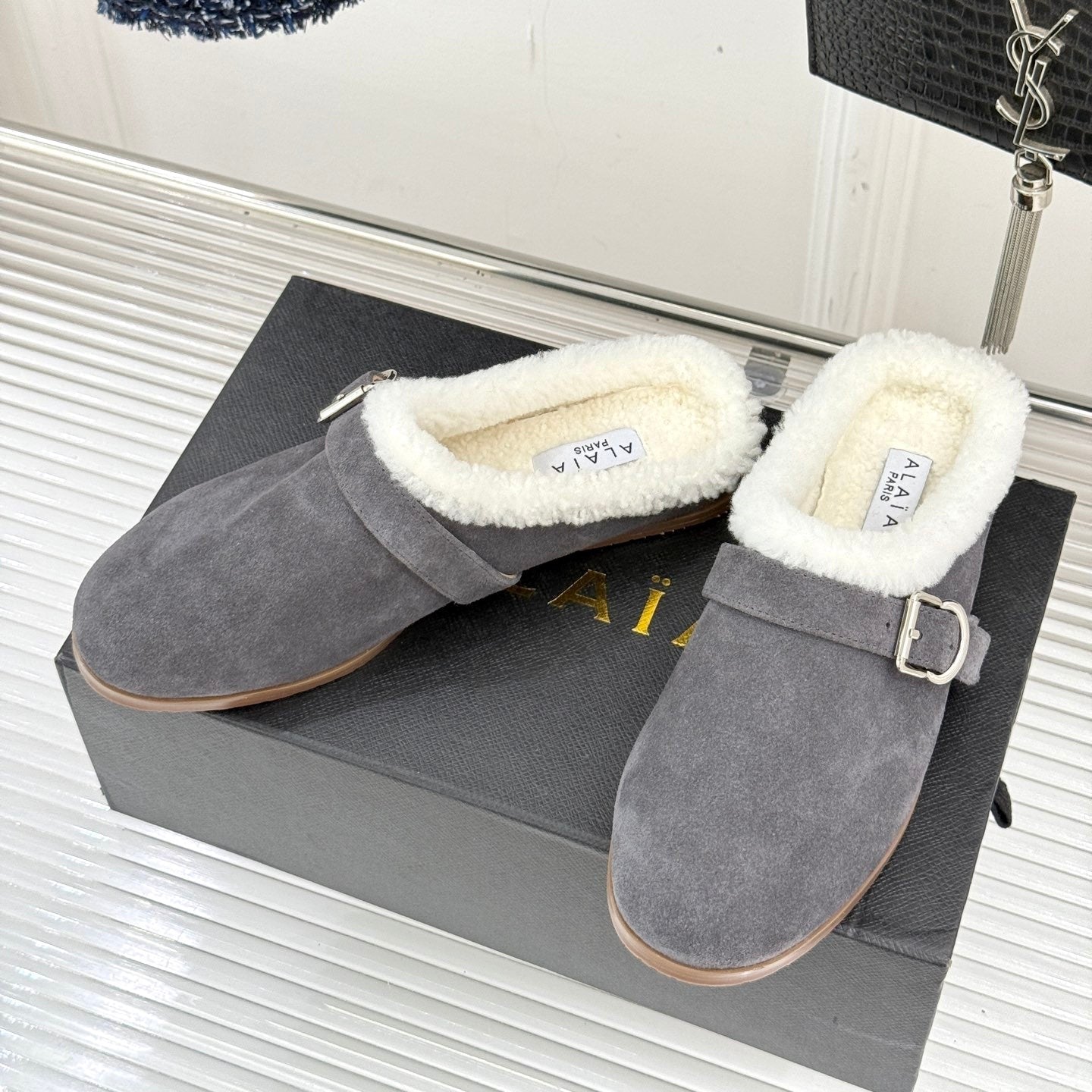 Alaia 25WF slippers belt buckle charcoal grey suede wool 472230