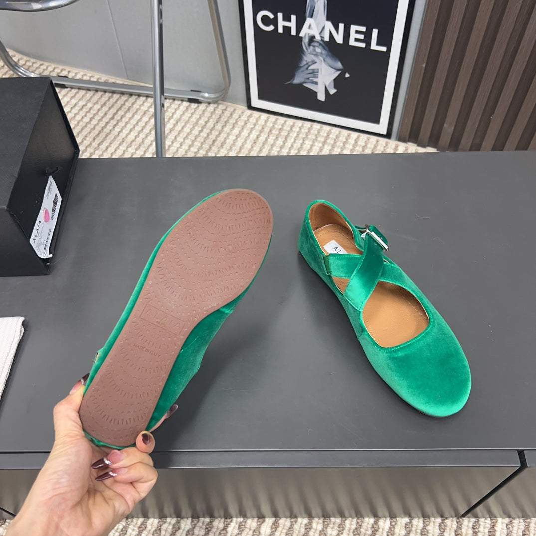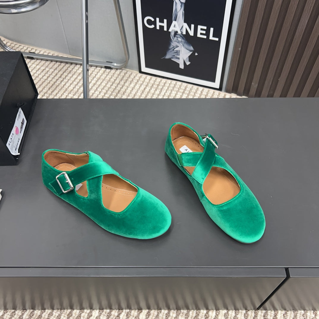 • Color: Green, Dark Beige • Material: Velvet, Lambskin • High hell: 0,5CM • Size: 35 - 42