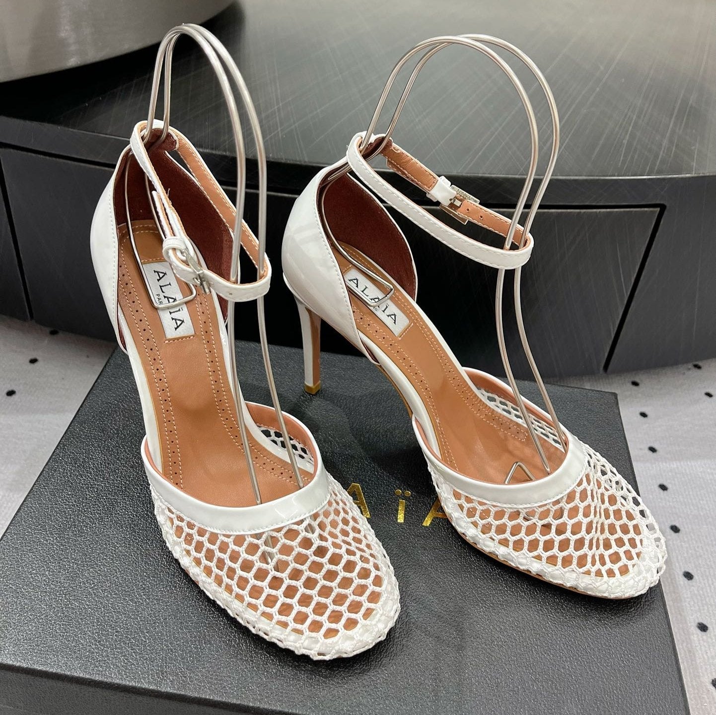 Alaila High Fishnet Pumps 90mm In White Mesh Fabric 954850