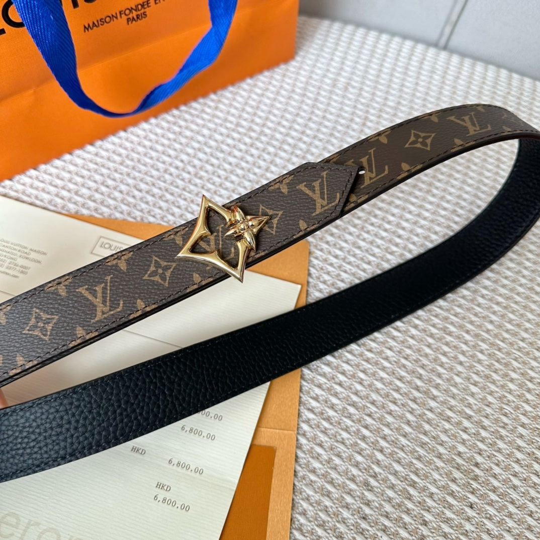 LV FLOWERGRAM 30MM REVERSIBLE BELT IN BLACK CALFSKIN GOLD HARDWARE