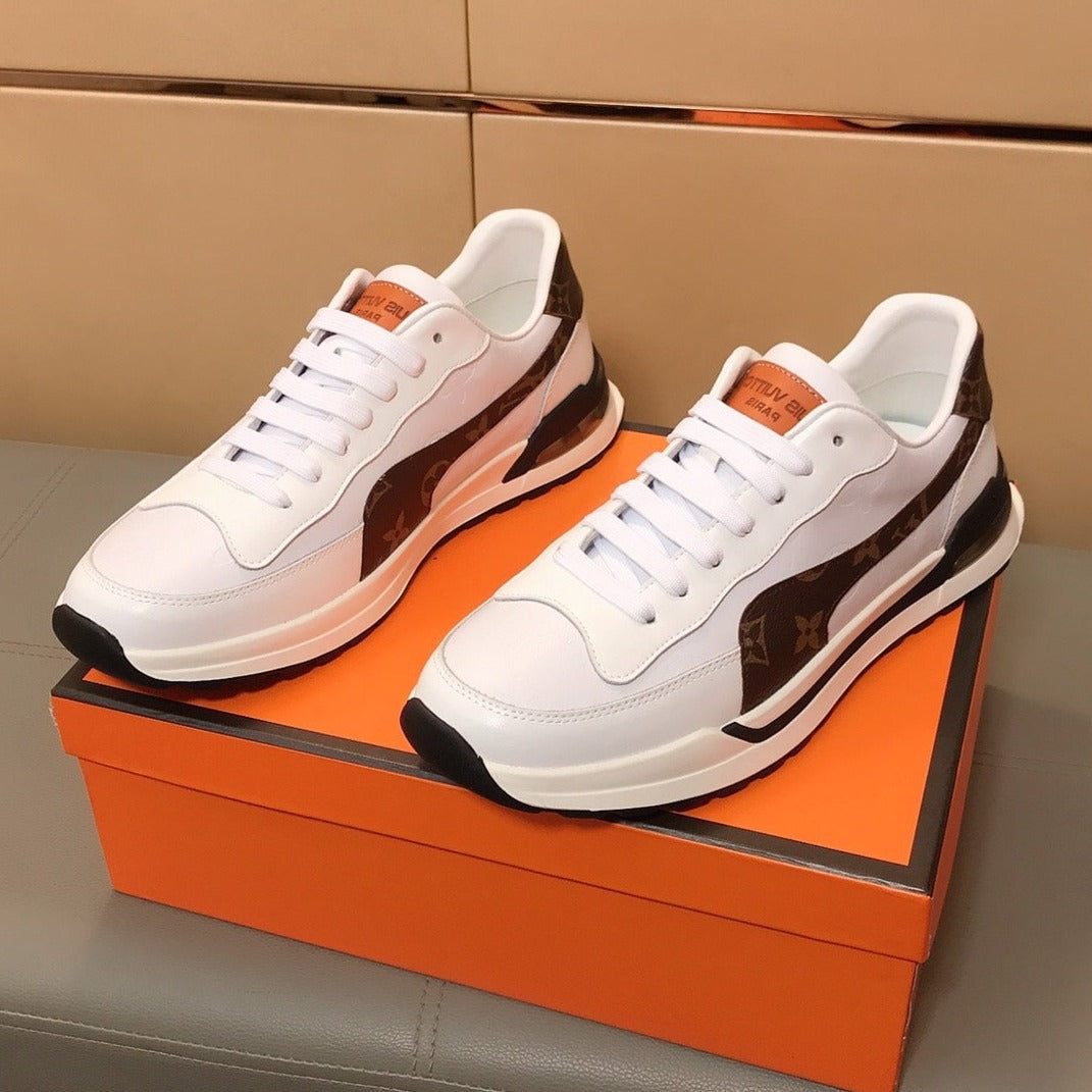 LV SNEAKERS IN GREY MIX BROWN CALFSKIN AND BRANDED PRINTED FABRIC