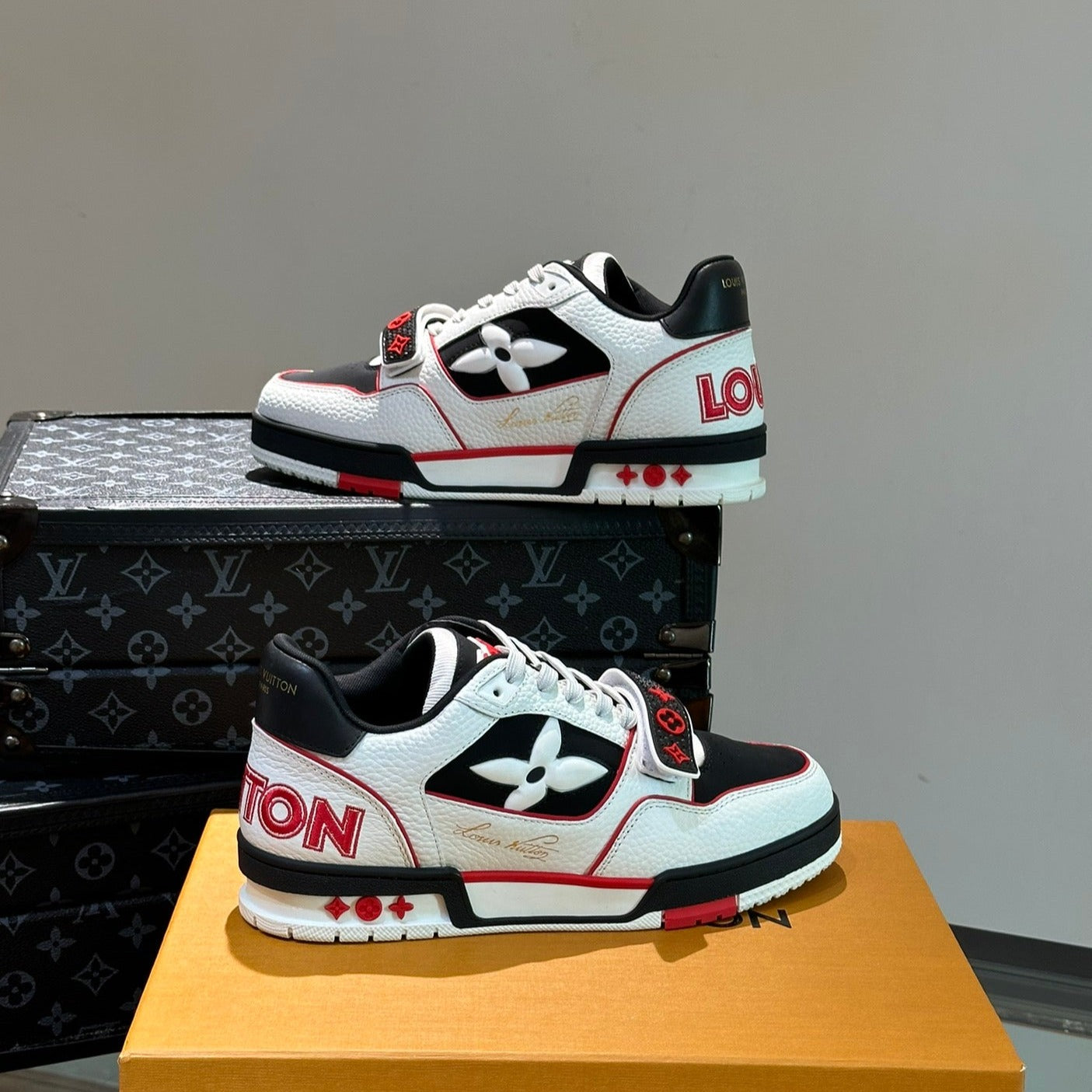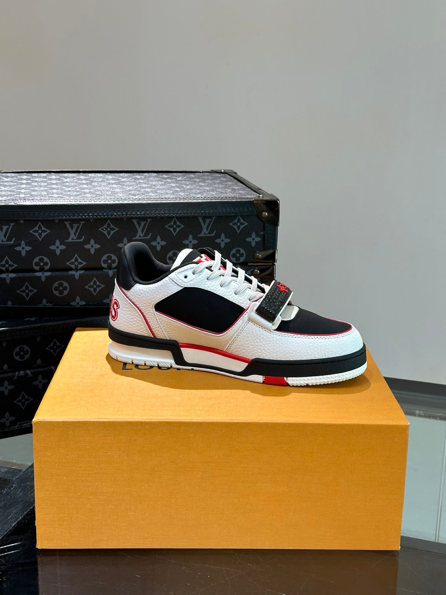 LV TRAINER SNEAKERS IN WHITE CALFSKIN AND BLACK MIX RED SUEDE