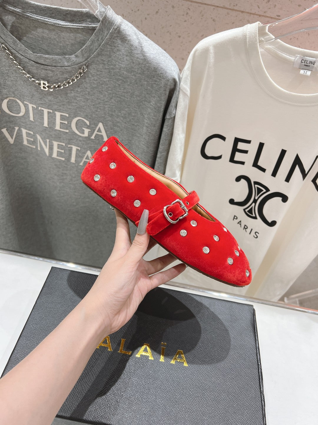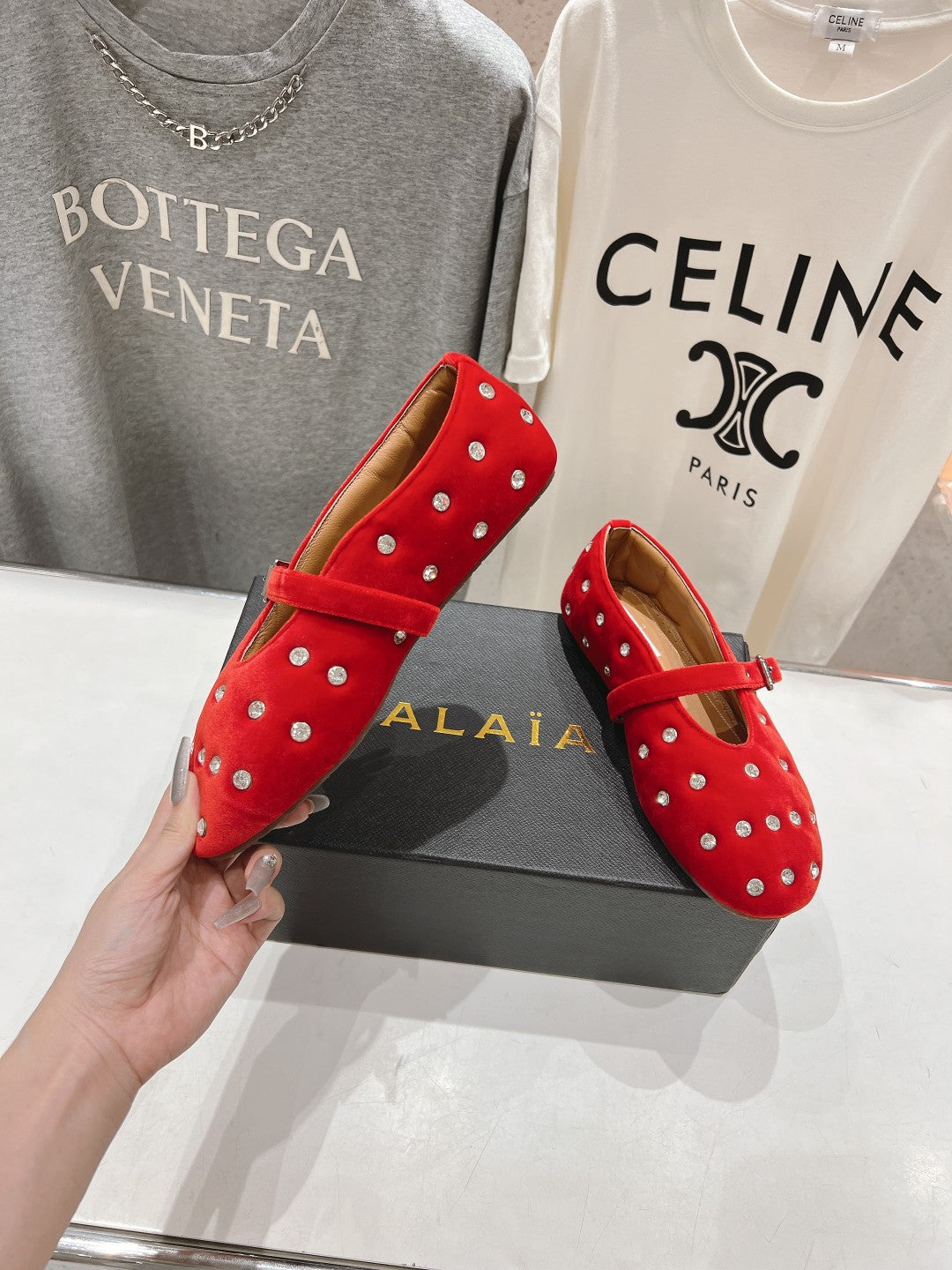 • Color: Red, Dark Beige • Material: Velvet With Rhinestones, Lambskin • High hell: 0,5CM • Size: 35 - 40