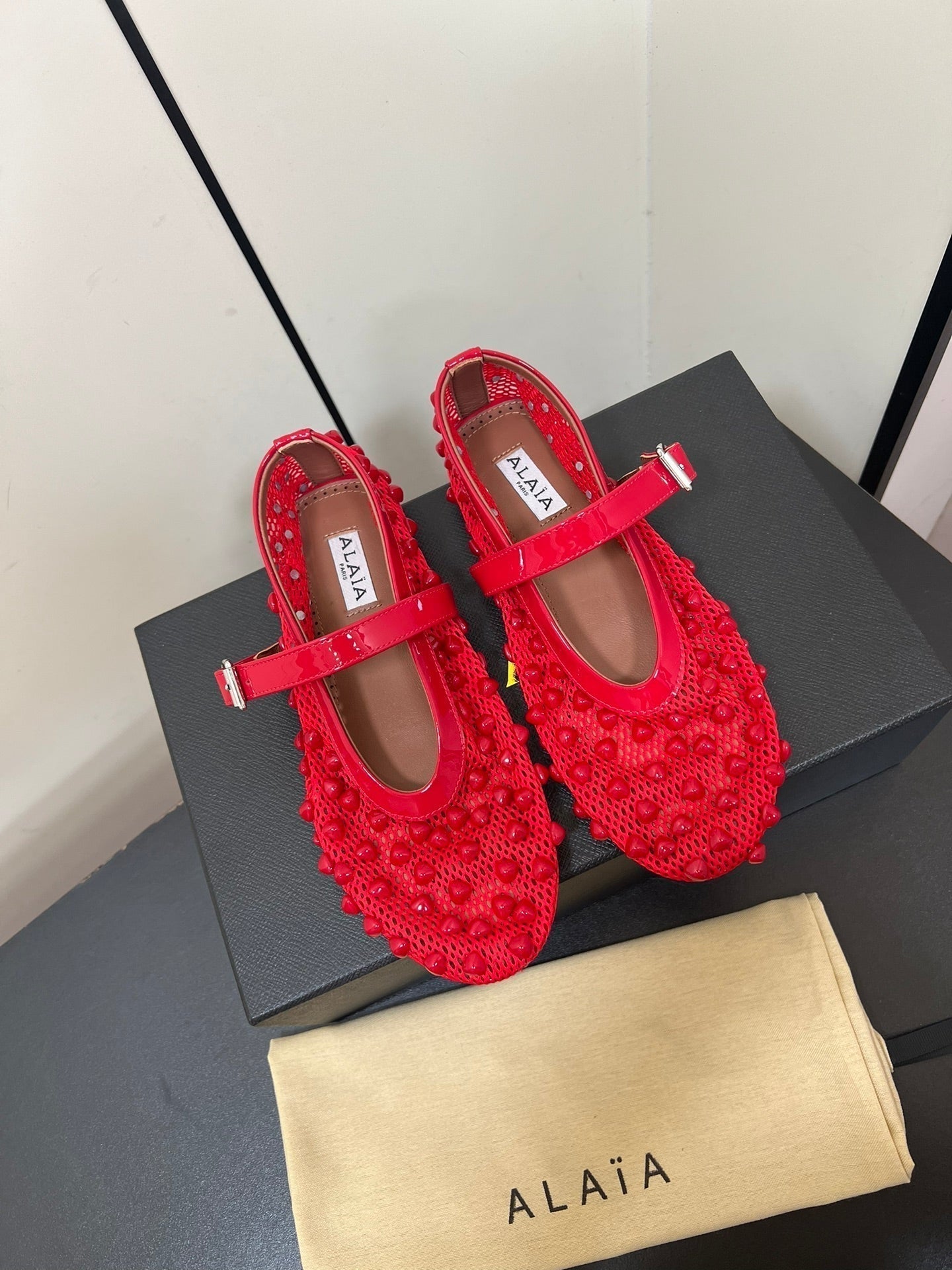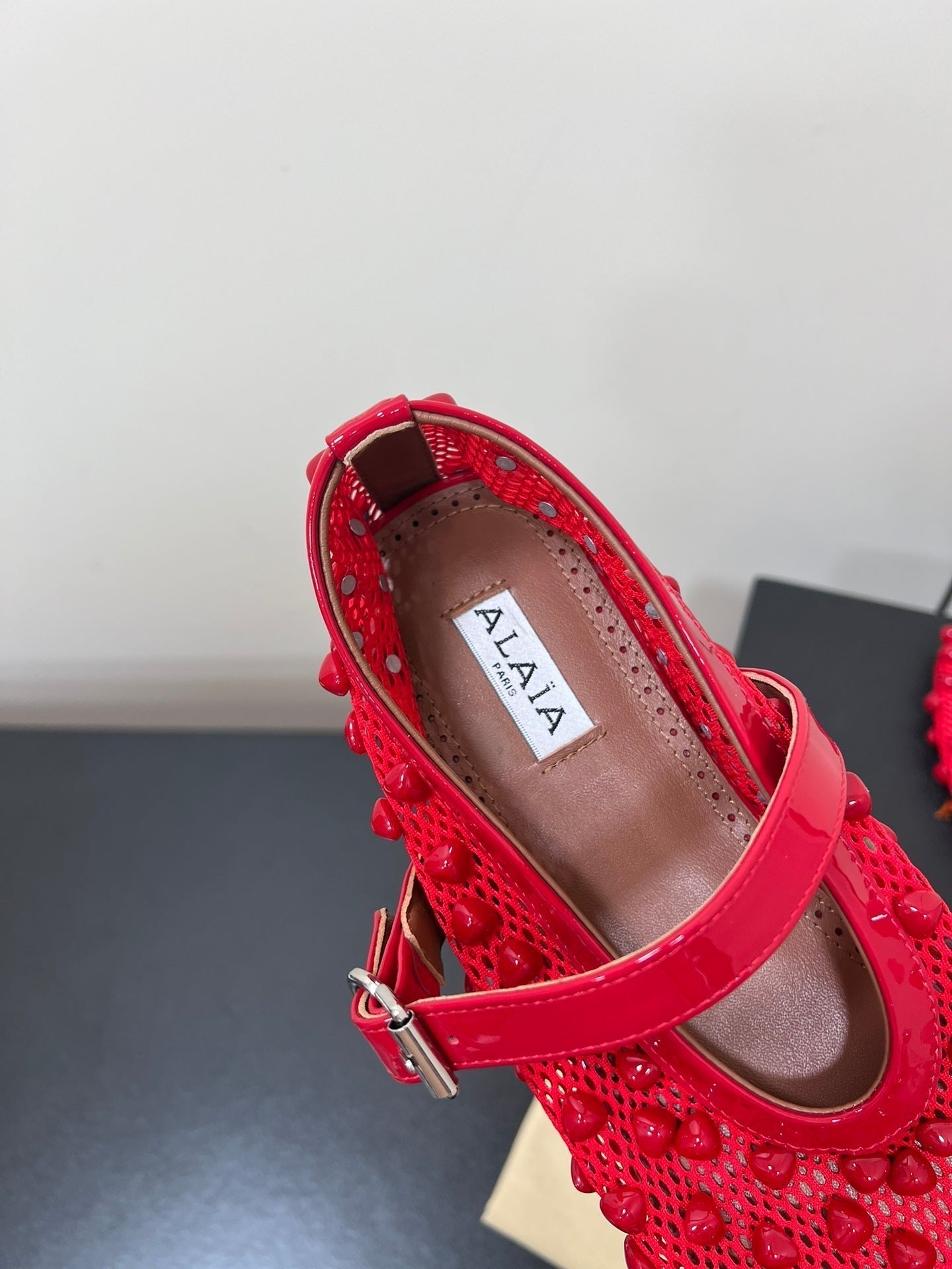 • Color: Red, Brown • Material: Studs On Fishnet, Lambskin • High hell: 0,5CM • Size: 35 - 42