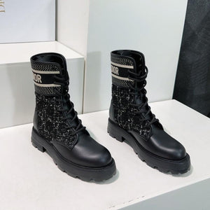 CD D-Major Boot Black Mix White Calfskin And Tweed Fabric