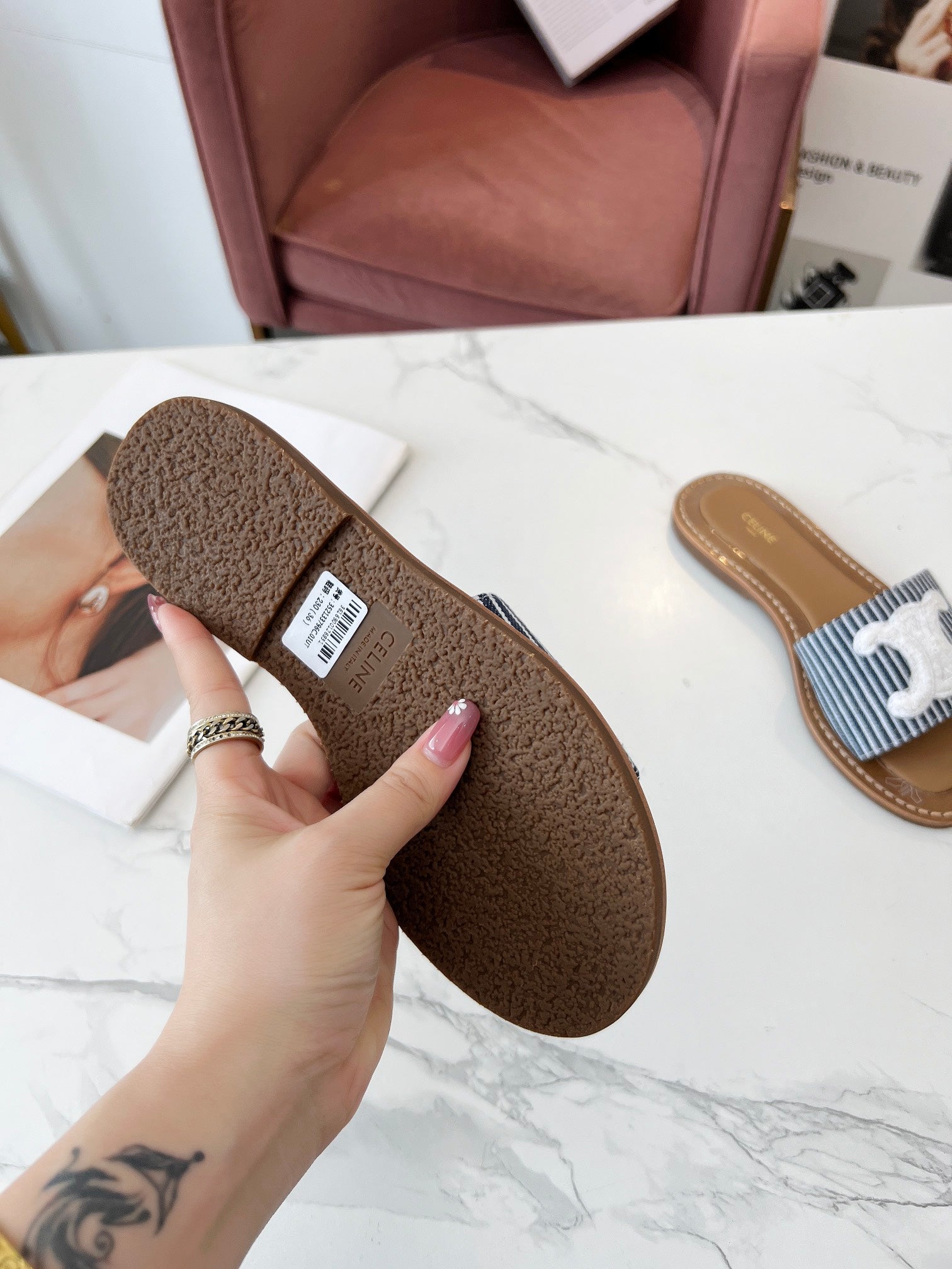 Celine 25C Slippers Navy Blue mix White Fabric with Calfskin 238166