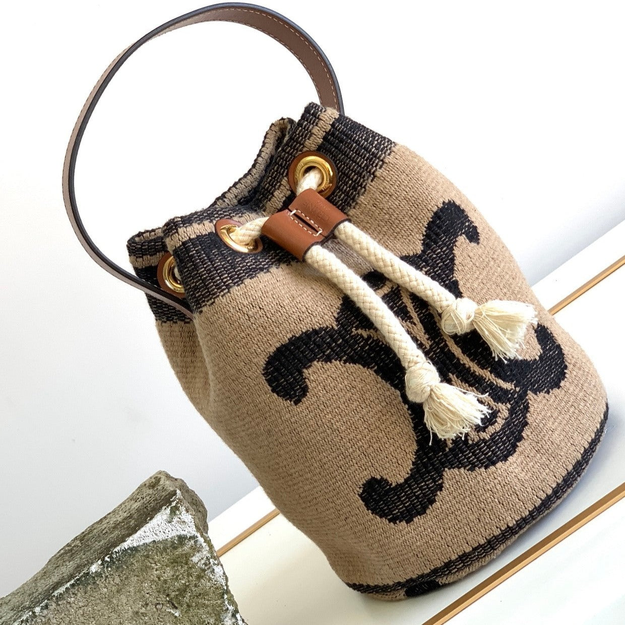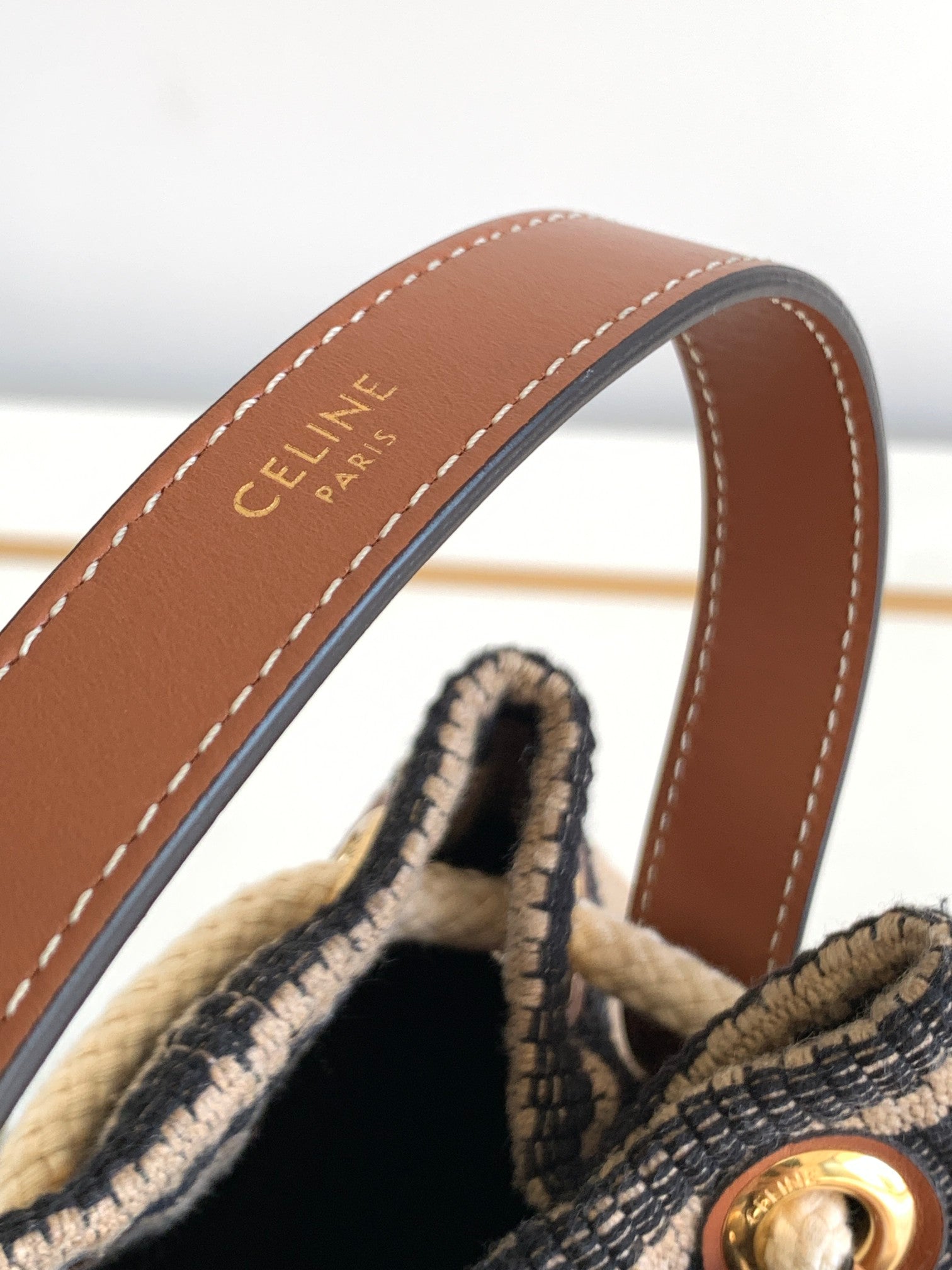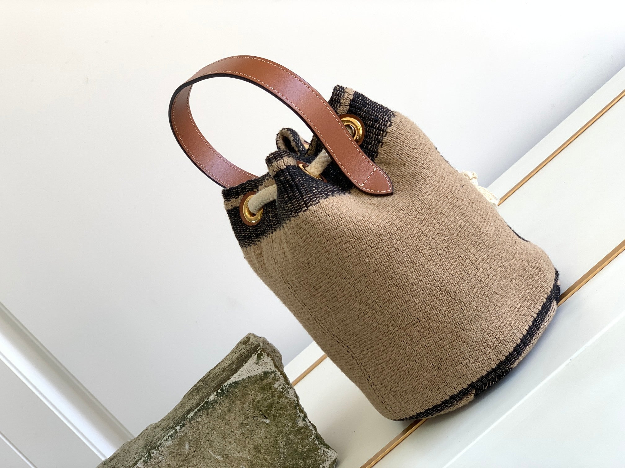Material: fabric lining, hand carry, drawstring closure, leather handle length 13 cm