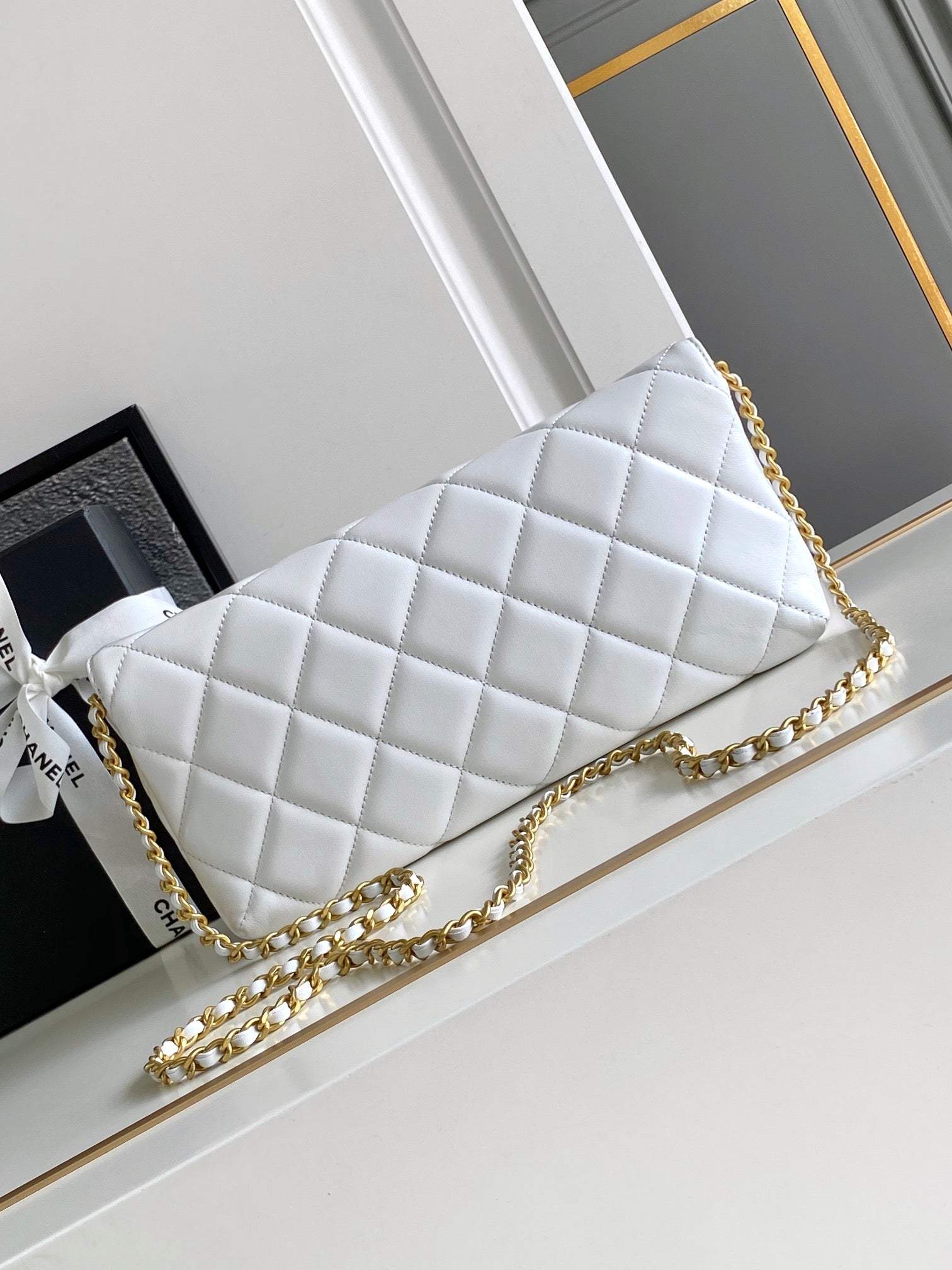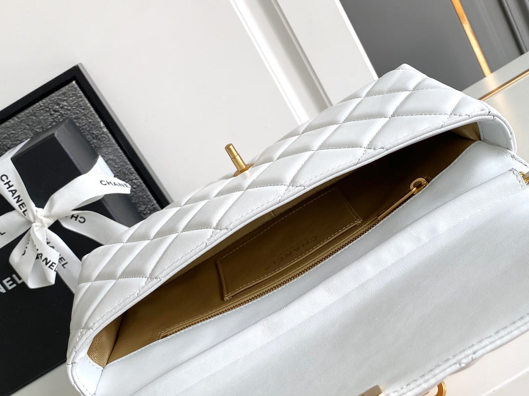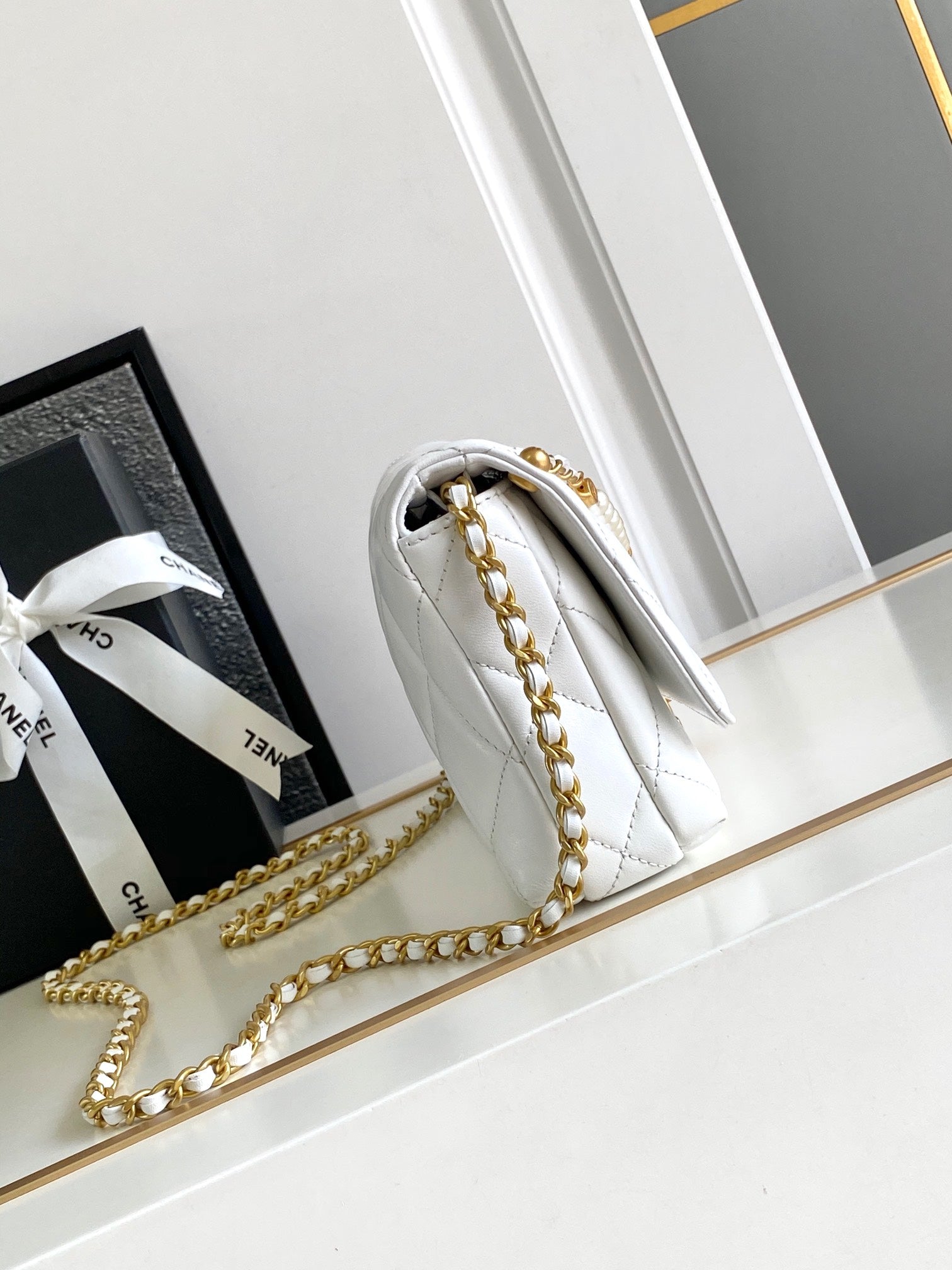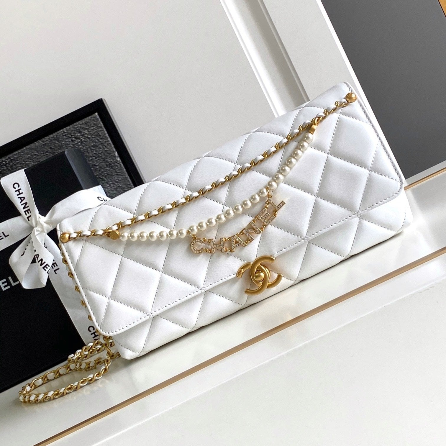 CC MEDIUM 27 CLASSIC FLAP BAG IN WHITE CALFSKIN WITH PEARL CHAIN