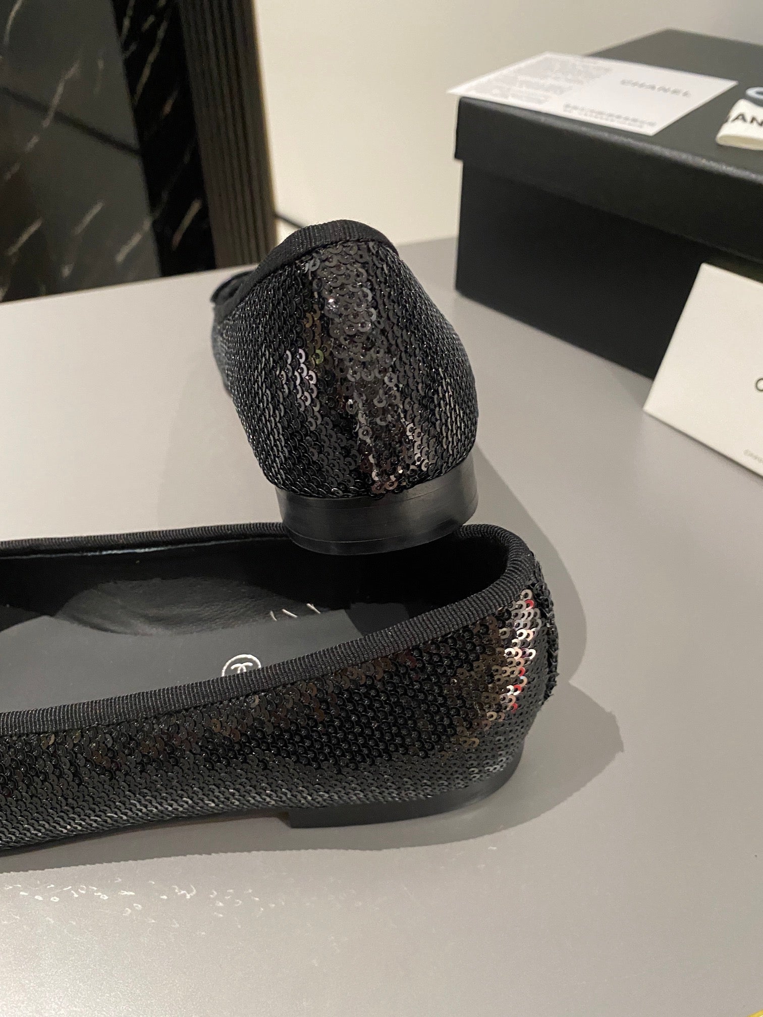 ballet flat black glitter sequins grosgrain