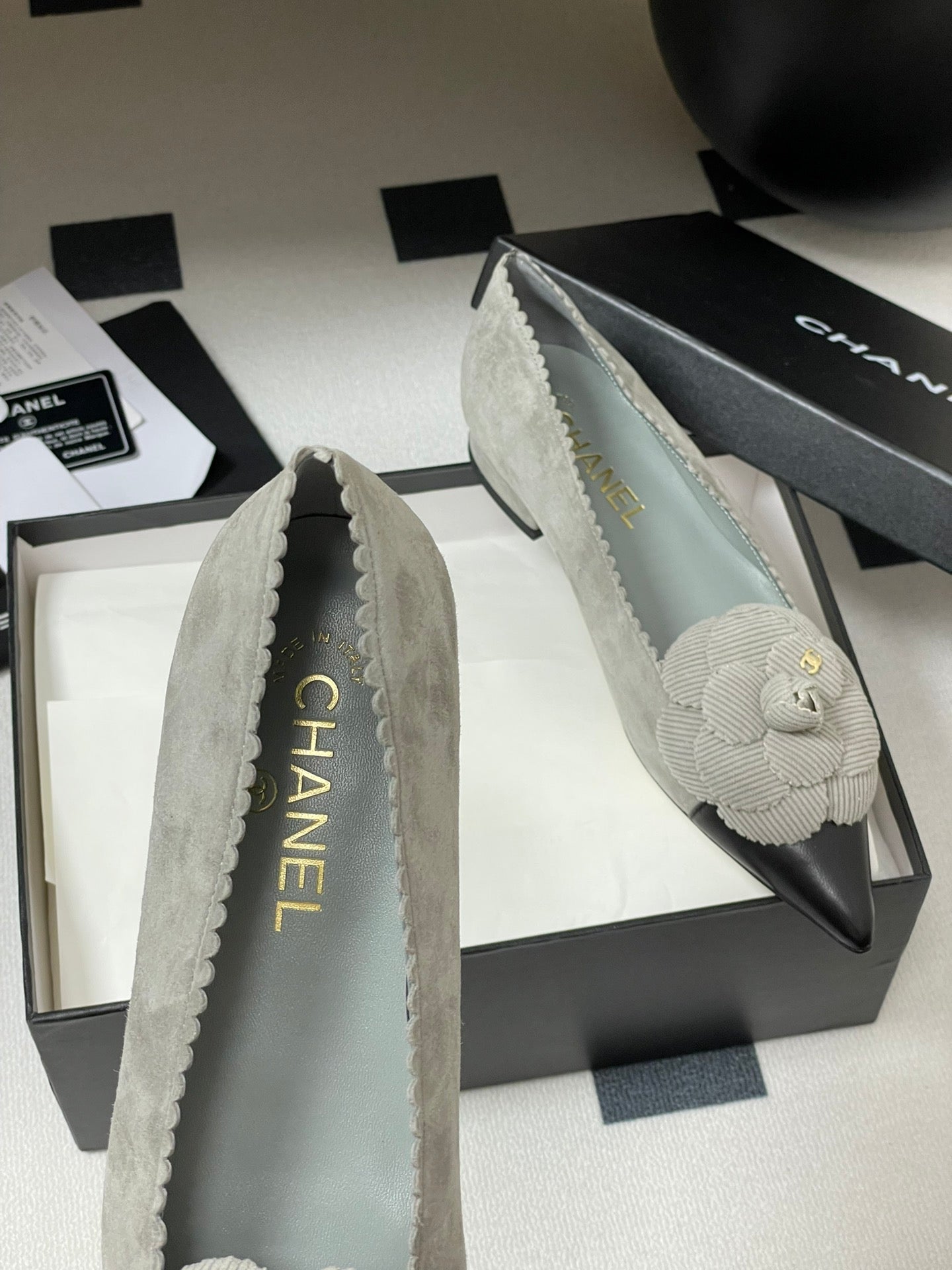 CC 25C Classic Camellia Pointed High Heels Flat 15mm Grey Suede 247607